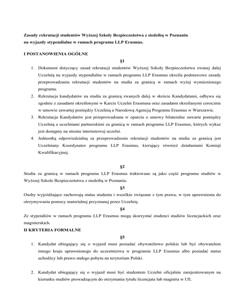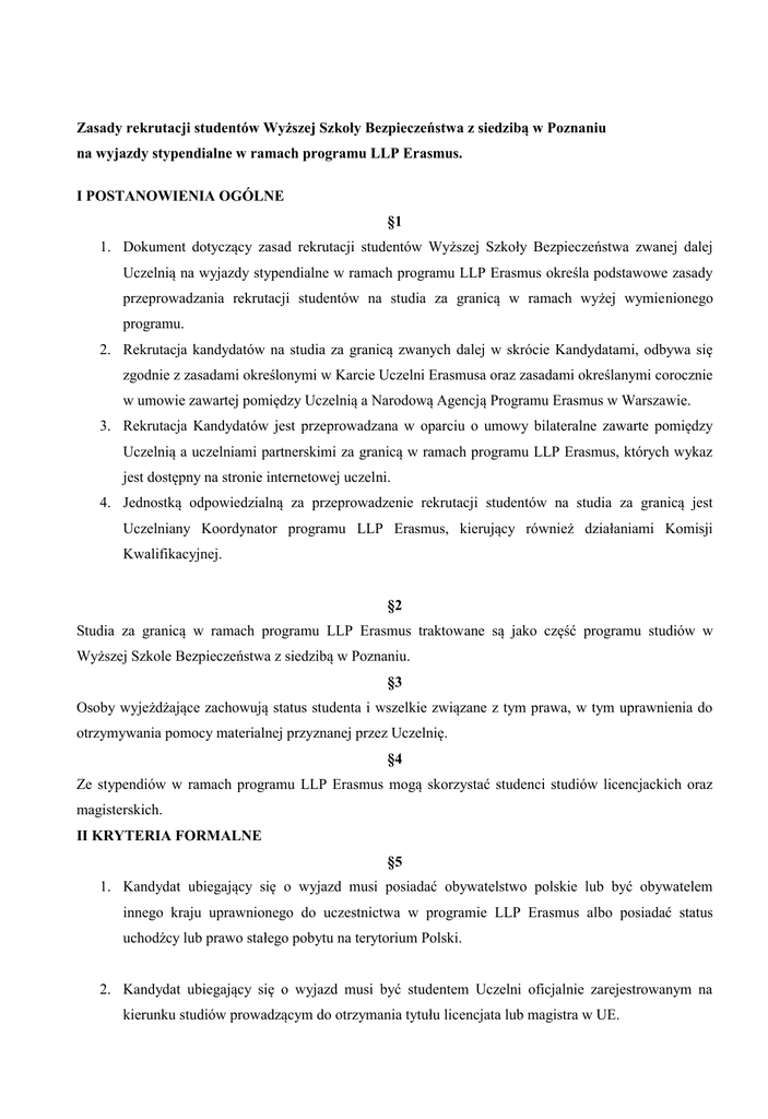 Zasady rekrutacji studentów Wyższej Szkoły Bezpieczeństwa z siedzibą w Poznaniu na wyjazdy stypendialne w ramach programu LLP Erasmus. I POSTANOWIENIA OGÓLNE §1 1. Dokument dotyczący zasad rekrutacji studentów Wyższej Szkoły Bezpieczeństwa zwanej dalej Uczelnią na wyjazdy stypendialne w ramach programu LLP Erasmus określa podstawowe zasady przeprowadzania rekrutacji studentów na studia za granicą w ramach wyżej wymienionego programu. 2. Rekrutacja kandydatów na studia za granicą zwanych dalej w skrócie Kandydatami, odbywa się zgodnie z zasadami określonymi w Karcie Uczelni Erasmusa oraz zasadami określanymi corocznie w umowie zawartej pomiędzy Uczelnią a Narodową Agencją Programu Erasmus w Warszawie. 3. Rekrutacja Kandydatów jest przeprowadzana w oparciu o umowy bilateralne zawarte pomiędzy Uczelnią a uczelniami partnerskimi za granicą w ramach programu LLP Erasmus, których wykaz jest dostępny na stronie internetowej uczelni. 4. Jednostką odpowiedzialną za przeprowadzenie rekrutacji studentów na studia za granicą jest Uczelniany Koordynator programu LLP Erasmus, kierujący również działaniami Komisji Kwalifikacyjnej. §2 Studia za granicą w ramach programu LLP Erasmus traktowane są jako część programu studiów w Wyższej Szkole Bezpieczeństwa z siedzibą w Poznaniu. §3 Osoby wyjeżdżające zachowują status studenta i wszelkie związane z tym prawa, w tym uprawnienia do otrzymywania pomocy materialnej przyznanej przez Uczelnię. §4 Ze stypendiów w ramach programu LLP Erasmus mogą skorzystać studenci studiów licencjackich oraz magisterskich. II KRYTERIA FORMALNE §5 1. Kandydat ubiegający się o wyjazd musi posiadać obywatelstwo polskie lub być obywatelem innego kraju uprawnionego do uczestnictwa w programie LLP Erasmus albo posiadać status uchodźcy lub prawo stałego pobytu na terytorium Polski. 2. Kandydat ubiegający się o wyjazd musi być studentem Uczelni oficjalnie zarejestrowanym na kierunku studiów prowadzącym do otrzymania tytułu licencjata lub magistra w UE. 3. Kandydat ubiegający się o wyjazd, w momencie wyjazdu powinien być studentem, co najmniej drugiego roku studiów pierwszego stopnia. 4. Kandydat ubiegający się o wyjazd wcześniej nie korzystał ze stypendium programu LLP Erasmus. III POSTĘPOWANIE REKRUTACYJNE §6 1. Rekrutacja na stypendia w ramach programu LLP Erasmus będzie odbywać się 2 razy w roku, w semestrze zimowym oraz w zależności od wolnych miejsc na wyjazdy w ramach programu LLP Erasmus, w semestrze letnim. 2. Jednostka organizacyjna właściwa ds. współpracy międzynarodowej będzie informowała wszystkich o terminach za pomocą ogłoszeń umieszczonych na stronie internetowej Uczelni oraz w Dziekanatach Wydziałów §7 Postępowanie rekrutacyjne prowadzone przez Uczelnianą Komisję Kwalifikacyjną odbywa się z uwzględnieniem następujących kryteriów: a. wyniki w nauce, mierzone średnią ocen b. znajomość języka obcego, w jakim będą prowadzone zajęcia w uczelni przyjmującej studenta, c. zewnętrzne certyfikaty językowe, d. zewnętrzne zaświadczenia o aktywności studenta, e. udział studenta w życiu organizacji studenckich, f. inne (wg przedstawionych przez studenta dokumentów), g. list motywacyjny. §8 1. W skład Uczelnianej Komisji Kwalifikacyjnej wchodzą: a. Uczelniany Koordynator Programu Erasmus jako przewodniczący, b. Dziekan lub prodziekan właściwego wydziału, którego studentem jest Kandydat, c. Przewodniczący Prezydium Zarządu Samorządu Studentów. 2. Protokoły z posiedzeń komisji kwalifikacyjnych załącza się do uczelnianej dokumentacji programu LLP Erasmus. §9 1. Dokumenty na wyjazdy w wybranym przez studenta semestrze nauki powinny dotrzeć do Uczelnianego Koordynatora Programu Erasmus najpóźniej w terminie do 1 czerwca każdego roku w wypadku rekrutacji na semestr zimowy oraz do 1 grudnia każdego roku w wypadku rekrutacji na semestr letni, jeżeli nie wykorzystano wszystkich miejsc w semestrze zimowym. 2. Dokumenty od studentów przyjmowane są przez cały rok akademicki. 3. Kandydat powinien wypełnić i przesłać obowiązujący w WSB formularz aplikacyjny, dostępny na stronie internetowej uczelni oraz następnie przekazać go w postaci wydruku Uczelnianemu Koordynatorowi Programu Erasmus. 4. Uczelniany Koordynator Programu Erasmus wyznacza termin posiedzenia Komisji Kwalifikacyjnej. O terminie tym wszyscy zainteresowani studenci zostaną poinformowani drogą mailową. §10 Uczelniany Koordynator zobowiązany jest do zamieszczenia na stronie internetowej Uczelni listy Kandydatów zakwalifikowanych do wyjazdu na studia za granicą oraz listy rezerwowej najpóźniej do dnia 30 czerwca. §11 1. Kandydatowi przysługuje możliwość odwołania się od decyzji Komisji Kwalifikacyjnej, w terminie 7 dni od dnia zamieszczenia list na stronie internetowej. Odwołanie powinno być złożone w formie pisemnej do Rektora. 2. Odwołanie jest rozstrzygane w ciągu 14 dni, a stosowna decyzja przekazana w formie pisemnej Kandydatowi. §12 Z każdym studentem zakwalifikowanym do wyjazdu zostanie podpisana stosowna umowa, której integralną część stanowi porozumienie o programie zajęć. §13 1. Kandydat, który rezygnuje z wyjazdu, powinien pisemnie poinformować o tym Uczelnianego Koordynatora najpóźniej na 30 dni przed dniem upływu terminu do złożenia aplikacji w zagranicznej uczelni partnerskiej. 2. Naruszenie określonego w ust. 1 terminu lub brak stosownej informacji ze strony Kandydata skutkuje wykluczeniem możliwości ponownego skorzystania przez tę osobę z wyjazdu w ramach programu LLP Erasmus realizowanego przez Uczelnią oraz poinformowaniem właściwego dziekana 3. Konsekwencje naruszenia przez Kandydata obowiązków określonych w ust. 1 nie będą zastosowane w przypadku zaistnienia okoliczności od kandydata niezależnych (tzw. zdarzenia losowe).
