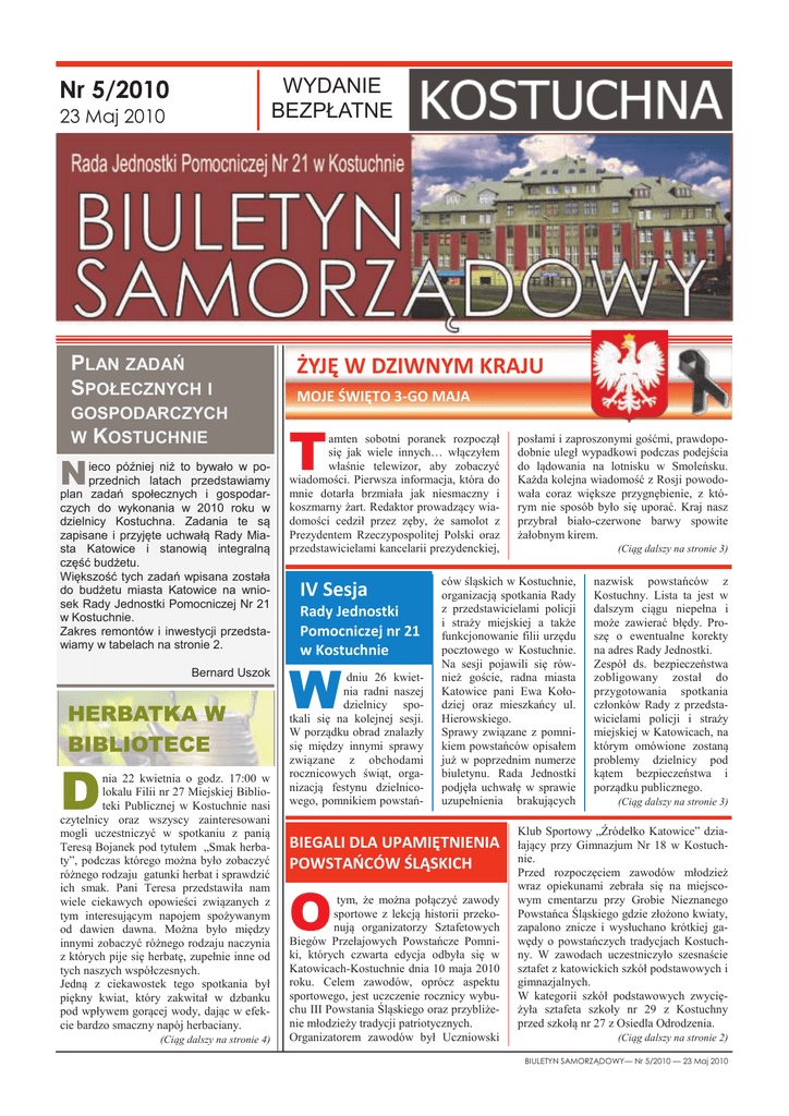 Nr 5/2010 WYDANIE BEZPŁATNE 23 Maj 2010 PLAN ZADAŃ SPOŁECZNYCH I GOSPODARCZYCH W KOSTUCHNIE N ieco później niż to bywało w poprzednich latach przedstawiamy plan zadań społecznych i gospodarczych do wykonania w 2010 roku w dzielnicy Kostuchna. Zadania te są zapisane i przyjęte uchwałą Rady Miasta Katowice i stanowią integralną część budżetu. Większość tych zadań wpisana została do budżetu miasta Katowice na wniosek Rady Jednostki Pomocniczej Nr 21 w Kostuchnie. Zakres remontów i inwestycji przedstawiamy w tabelach na stronie 2. Bernard Uszok HERBATKA W BIBLIOTECE D nia 22 kwietnia o godz. 17:00 w lokalu Filii nr 27 Miejskiej Biblioteki Publicznej w Kostuchnie nasi czytelnicy oraz wszyscy zainteresowani mogli uczestniczyć w spotkaniu z panią Teresą Bojanek pod tytułem „Smak herbaty”, podczas którego można było zobaczyć różnego rodzaju gatunki herbat i sprawdzić ich smak. Pani Teresa przedstawiła nam wiele ciekawych opowieści związanych z tym interesującym napojem spożywanym od dawien dawna. Można było między innymi zobaczyć różnego rodzaju naczynia z których pije się herbatę, zupełnie inne od tych naszych współczesnych. Jedną z ciekawostek tego spotkania był piękny kwiat, który zakwitał w dzbanku pod wpływem gorącej wody, dając w efekcie bardzo smaczny napój herbaciany. (Ciąg dalszy na stronie 4) ŻYJĘ W DZIWNYM KRAJU MOJE ŚWIĘTO 3-GO MAJA T amten sobotni poranek rozpoczął się jak wiele innych… włączyłem właśnie telewizor, aby zobaczyć wiadomości. Pierwsza informacja, która do mnie dotarła brzmiała jak niesmaczny i koszmarny żart. Redaktor prowadzący wiadomości cedził przez zęby, że samolot z Prezydentem Rzeczypospolitej Polski oraz przedstawicielami kancelarii prezydenckiej, IV Sesja Rady Jednostki Pomocniczej nr 21 w Kostuchnie W dniu 26 kwietnia radni naszej dzielnicy spotkali się na kolejnej sesji. W porządku obrad znalazły się między innymi sprawy związane z obchodami rocznicowych świąt, organizacją festynu dzielnicowego, pomnikiem powstań- (Ciąg dalszy na stronie 3) ców śląskich w Kostuchnie, organizacją spotkania Rady z przedstawicielami policji i straży miejskiej a także funkcjonowanie filii urzędu pocztowego w Kostuchnie. Na sesji pojawili się również goście, radna miasta Katowice pani Ewa Kołodziej oraz mieszkańcy ul. Hierowskiego. Sprawy związane z pomnikiem powstańców opisałem już w poprzednim numerze biuletynu. Rada Jednostki podjęła uchwałę w sprawie uzupełnienia brakujących BIEGALI DLA UPAMIĘTNIENIA POWSTAOCÓW ŚLĄSKICH O posłami i zaproszonymi gośćmi, prawdopodobnie uległ wypadkowi podczas podejścia do lądowania na lotnisku w Smoleńsku. Każda kolejna wiadomość z Rosji powodowała coraz większe przygnębienie, z którym nie sposób było się uporać. Kraj nasz przybrał biało-czerwone barwy spowite żałobnym kirem. tym, że można połączyć zawody sportowe z lekcją historii przekonują organizatorzy Sztafetowych Biegów Przełajowych Powstańcze Pomniki, których czwarta edycja odbyła się w Katowicach-Kostuchnie dnia 10 maja 2010 roku. Celem zawodów, oprócz aspektu sportowego, jest uczczenie rocznicy wybuchu III Powstania Śląskiego oraz przybliżenie młodzieży tradycji patriotycznych. Organizatorem zawodów był Uczniowski nazwisk powstańców z Kostuchny. Lista ta jest w dalszym ciągu niepełna i może zawierać błędy. Proszę o ewentualne korekty na adres Rady Jednostki. Zespół ds. bezpieczeństwa zobligowany został do przygotowania spotkania członków Rady z przedstawicielami policji i straży miejskiej w Katowicach, na którym omówione zostaną problemy dzielnicy pod kątem bezpieczeństwa i porządku publicznego. (Ciąg dalszy na stronie 3) Klub Sportowy „Źródełko Katowice” działający przy Gimnazjum Nr 18 w Kostuchnie. Przed rozpoczęciem zawodów młodzież wraz opiekunami zebrała się na miejscowym cmentarzu przy Grobie Nieznanego Powstańca Śląskiego gdzie złożono kwiaty, zapalono znicze i wysłuchano krótkiej gawędy o powstańczych tradycjach Kostuchny. W zawodach uczestniczyło szesnaście sztafet z katowickich szkół podstawowych i gimnazjalnych. W kategorii szkół podstawowych zwyciężyła sztafeta szkoły nr 29 z Kostuchny przed szkołą nr 27 z Osiedla Odrodzenia. (Ciąg dalszy na stronie 2) BIULETYN SAMORZĄDOWY— Nr 5/2010 — 23 Maj 2010 Strona 2 PLAN ZADAŃ SPOŁECZNYCH I GOSPODARCZYCH W KOSTUCHNIE L. p. ZAKRES REMONTÓW KWOTA W DZIELNICY REMONTU KOSTUCHNA L. p. ZAKRES INWESTYCJI W DZIELNICY KOSTUCHNA KWOTA INWESTYCJI Remont sali gimnastycznej i 1. garaży w Szkole Podstawowej Nr 29 28.000 zł Realizacja drugiego etapu budowy sieci kanalizacji deszczowej, sani1. tarnej i wodociągowej, oraz drogi gminnej z oświetleniem dla osiedla mieszkaniowego przy ulicy Bażantów Remont instalacji elektrycznej 2. w sali lekcyjnej nr 23 — Szkoły Podstawowej Nr 29 100.000 zł 10.000 zł Rozpoczęcie realizacji uzbrojenia terenu w zakresie drogi gminnej z 2. odwodnieniem i oświetleniem dla osiedla mieszkaniowego w rejonie ulicy Tymiankowej Naprawa nawierzchni boiska 3. sportowego w Gimnazjum Nr 18 7.200.000 zł 25.000 zł Budowa sieci kanalizacji deszczowej, sanitarnej i wodociągowej, oraz 3. dróg gminnych z oświetleniem na osiedlu Szarych Szeregów – Boya Żeleoskiego – Zawilców Projekt wejśd ewakuacyjnych w 4. Gimnazjum Nr 18 7.000 zł Inne prace remontowo – konserwacyjne w Gimnazjum Nr 18 15.290 zł Remont wejścia ewakuacyjnego 6. i schodów wewnętrznych w Miejskim Przedszkolu Nr 41 41.000 zł 5. Wymiana oświetlenia i malowa7. nie sal zajęciowych w Miejskim Przedszkolu Nr 41 Projekt wjazdu i drogi przeciw 8. pożarowej w Miejskim Przedszkolu Nr 41 12.000 zł 8.000 zł Inne prace remontowo – kon9. serwacyjne w Miejskim Przedszkolu Nr 41 400 zł Remont podłogi w szatni Miej10. skiego Przedszkola Nr 42 14.000 zł 11. Wymiana drzwi w Miejskim Przedszkolu Nr 42 4.000 zł I