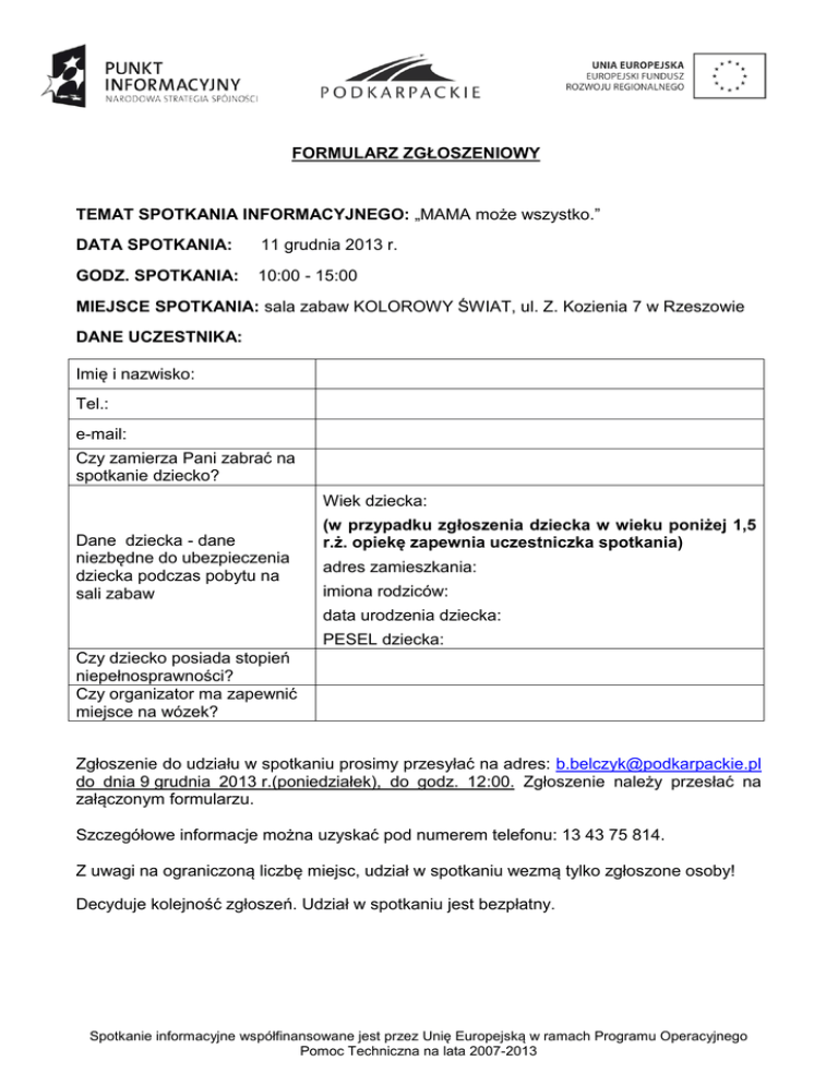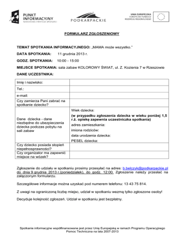 FORMULARZ ZGŁOSZENIOWY TEMAT SPOTKANIA INFORMACYJNEGO: „MAMA może wszystko.” DATA SPOTKANIA: 11 grudnia 2013 r. GODZ. SPOTKANIA: 10:00 - 15:00 MIEJSCE SPOTKANIA: sala zabaw KOLOROWY ŚWIAT, ul. Z. Kozienia 7 w Rzeszowie DANE UCZESTNIKA: Imię i nazwisko: Tel.: e-mail: Czy zamierza Pani zabrać na spotkanie dziecko? Wiek dziecka: Dane dziecka - dane niezbędne do ubezpieczenia dziecka podczas pobytu na sali zabaw (w przypadku zgłoszenia dziecka w wieku poniżej 1,5 r.ż. opiekę zapewnia uczestniczka spotkania) adres zamieszkania: imiona rodziców: data urodzenia dziecka: PESEL dziecka: Czy dziecko posiada stopień niepełnosprawności? Czy organizator ma zapewnić miejsce na wózek? Zgłoszenie do udziału w spotkaniu prosimy przesyłać na adres: [email protected] do dnia 9 grudnia 2013 r.(poniedziałek), do godz. 12:00. Zgłoszenie należy przesłać na załączonym formularzu. Szczegółowe informacje można uzyskać pod numerem telefonu: 13 43 75 814. Z uwagi na ograniczoną liczbę miejsc, udział w spotkaniu wezmą tylko zgłoszone osoby! Decyduje kolejność zgłoszeń. Udział w spotkaniu jest bezpłatny. Spotkanie informacyjne współfinansowane jest przez Unię Europejską w ramach Programu Operacyjnego Pomoc Techniczna na lata 2007-2013