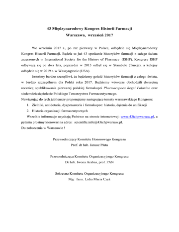 43 Międzynarodowy Kongres Historii Farmacji Warszawa, wrzesień 2017 We wrześniu 2017 r., po raz pierwszy w Polsce, odbędzie się Międzynarodowy Kongres Historii Farmacji. Będzie to już 43 spotkanie historyków farmacji z całego świata zrzeszonych w International Society for the History of Pharmacy (ISHP). Kongresy ISHP odbywają się co dwa lata, poprzedni w 2015 odbył się w Stambule (Turcja), a kolejny odbędzie się w 2019 r. w Waszyngtonie (USA). Jesteśmy bardzo szczęśliwi, że będziemy gościć historyków farmacji z całego świata, w bardzo szczególnym dla Polski roku 2017. Będziemy wówczas obchodzili dwusetną rocznicę opublikowania pierwszej polskiej farmakopei Pharmacopoea Regni Poloniae oraz siedemdziesięciolecie Polskiego Towarzystwa Farmaceutycznego. Nawiązując do tych jubileuszy proponujemy następujące tematy warszawskiego Kongresu: 1. Zielniki, antidotaria, dyspensatoria i farmakopee: historia, dążenia do unifikacji 2. Historia organizacji farmaceutycznych Wszelkie informacje uzyskają Państwo na stronie internetowej: www.43ichpwarsaw.pl, a pytania prosimy kierować na adres: [email protected]. Do zobaczenia w Warszawie ! Przewodniczący Komitetu Honorowego Kongresu Prof. dr hab. Janusz Pluta Przewodnicząca Komitetu Organizacyjnego Kongresu Dr hab. Iwona Arabas, prof. PAN Sekretarz Komitetu Organizacyjnego Kongresu Mgr farm. Lidia Maria Czyż
