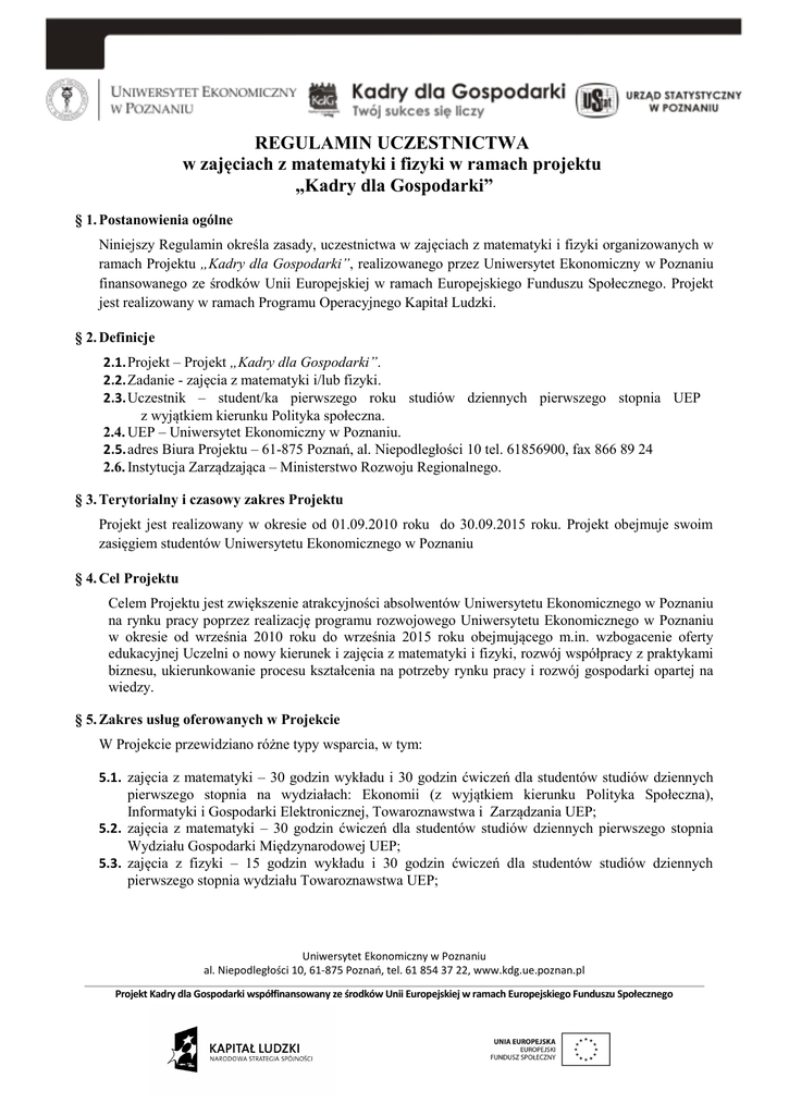 REGULAMIN UCZESTNICTWA w zajęciach z matematyki i fizyki w ramach projektu „Kadry dla Gospodarki” § 1. Postanowienia ogólne Niniejszy Regulamin określa zasady, uczestnictwa w zajęciach z matematyki i fizyki organizowanych w ramach Projektu „Kadry dla Gospodarki”, realizowanego przez Uniwersytet Ekonomiczny w Poznaniu finansowanego ze środków Unii Europejskiej w ramach Europejskiego Funduszu Społecznego. Projekt jest realizowany w ramach Programu Operacyjnego Kapitał Ludzki. § 2. Definicje 2.1. Projekt – Projekt „Kadry dla Gospodarki”. 2.2. Zadanie - zajęcia z matematyki i/lub fizyki. 2.3. Uczestnik – student/ka pierwszego roku studiów dziennych pierwszego stopnia UEP z wyjątkiem kierunku Polityka społeczna. 2.4. UEP – Uniwersytet Ekonomiczny w Poznaniu. 2.5. adres Biura Projektu – 61-875 Poznań, al. Niepodległości 10 tel. 61856900, fax 866 89 24 2.6. Instytucja Zarządzająca – Ministerstwo Rozwoju Regionalnego. § 3. Terytorialny i czasowy zakres Projektu Projekt jest realizowany w okresie od 01.09.2010 roku do 30.09.2015 roku. Projekt obejmuje swoim zasięgiem studentów Uniwersytetu Ekonomicznego w Poznaniu § 4. Cel Projektu Celem Projektu jest zwiększenie atrakcyjności absolwentów Uniwersytetu Ekonomicznego w Poznaniu na rynku pracy poprzez realizację programu rozwojowego Uniwersytetu Ekonomicznego w Poznaniu w okresie od września 2010 roku do września 2015 roku obejmującego m.in. wzbogacenie oferty edukacyjnej Uczelni o nowy kierunek i zajęcia z matematyki i fizyki, rozwój współpracy z praktykami biznesu, ukierunkowanie procesu kształcenia na potrzeby rynku pracy i rozwój gospodarki opartej na wiedzy. § 5. Zakres usług oferowanych w Projekcie W Projekcie przewidziano różne typy wsparcia, w tym: 5.1. zajęcia z matematyki – 30 godzin wykładu i 30 godzin ćwiczeń dla studentów studiów dziennych pierwszego stopnia na wydziałach: Ekonomii (z wyjątkiem kierunku Polityka Społeczna), Informatyki i Gospodarki Elektronicznej, Towaroznawstwa i Zarządzania UEP; 5.2. zajęcia z matematyki – 30 godzin ćwiczeń dla studentów studiów dziennych pierwszego stopnia Wydziału Gospodarki Międzynarodowej UEP; 5.3. zajęcia z fizyki – 15 godzin wykładu i 30 godzin ćwiczeń dla studentów studiów dziennych pierwszego stopnia wydziału Towaroznawstwa UEP; Uniwersytet Ekonomiczny w Poznaniu al. Niepodległości 10, 61-875 Poznań, tel. 61 854 37 22, www.kdg.ue.poznan.pl Projekt Kadry dla Gospodarki współfinansowany ze środków Unii Europejskiej w ramach Europejskiego Funduszu Społecznego Informacje dotyczące poszczególnych modułów dostępne są na platformie Moodle Uniwersytetu Ekonomicznego w Poznaniu lub bezpośrednio w Biurze Projektu. § 6. Zasady uczestnictwa w Projekcie A. Uczestnikami wsparcia, jakim są zajęcia z matematyki i fizyki, które zostanie udzielone w ramach realizacji Projektu „Kadry dla Gospodarki” są wszyscy studenci UEP pierwszego roku studiów dziennych pierwszego stopnia z wyjątkiem kierunku Polityka społeczna. B. Uczestnikami wsparcia, jakim są zajęcia z matematyki i fizyki, które zostanie udzielone w ramach realizacji Projektu „Kadry dla Gospodarki”, nie mogą być osoby nieposiadające obywatelstwa polskiego. 6.2. Osoby uczestniczące w zajęciach z matematyki i fizyki w Projekcie „Kadry dla Gospodarki” zobowiązane są dostarczyć następujące dokumenty: A. Deklarację uczestnictwa, B. Oświadczenie o zapoznaniu się z niniejszym Regulaminem, C. Oświadczenie o zapoznaniu się z obowiązkowym charakterem zajęć z matematyki i fizyki, D. Oświadczenie o wyrażeniu zgody na przetwarzanie danych osobowych, E. Zgoda na wykorzystanie wizerunku, F. Kwestionariusz osobowy uczestnika projektu. 6.3. Projekt jest zgodny z polityką równych szans. § 7. Zobowiązania stron 7.1. Przystąpienie Uczestnika do udziału w zajęciach z matematyki i fizyki w Projekcie „Kadry dla Gospodarki” następuje poprzez podpisanie deklaracji uczestnictwa w projekcie wraz ze zobowiązaniem do przestrzegania niniejszego Regulaminu . 7.2. Uczestnik jest zobowiązany do udziału we wszystkich wykładach i ćwiczeniach realizowanych w ramach zadania zgodnie z wymiarem przewidzianym dla danego wydziału. 7.3. Uczestnictwo we wszystkich zajęciach stanowi warunek konieczny uzyskania zaliczenia semestru. 7.4. Nieobecność nieusprawiedliwiona na więcej niż 20% godzin zajęć skutkuje niezaliczeniem przedmiotu. 7.5. W wyjątkowych sytuacjach student może wystąpić do Dziekana z wnioskiem (dostępnym pod adresem: http://www.kdg.ue.poznan.pl/matematyka-i-fizyka/dokumenty-do-pobrania/) o zwolnienie z obowiązku uczestniczenia w wykładach bądź ćwiczeniach realizowanych w ramach zajęć z przedmiotu Matematyka-wstęp/Fizyka-wstęp w sytuacji, gdy: a) w ramach studiów na dowolnym kierunku realizowanym przez UEP lub inną uczelnię zaliczył przedmiot matematyka/fizyka lub przedmiot o zbieżnym programie nauczania, b) z przyczyn zdrowotnych, udokumentowanych orzeczeniem lekarskim albo orzeczeniem o niepełnosprawności, nie może uczestniczyć w zajęciach realizowanych zgodnie z planem zajęć tj. w normalnym trybie. 7.6. Studenci, którzy zaliczyli w latach wcześniejszych przedmiot Matematyka – wstęp/Fizyka-wstęp, mogą uzyskać zgodę na zaliczenie zajęć z tych przedmiotów bez obowiązku uczestniczenia w wykładach/ćwiczeniach. W takiej sytuacji student zobowiązany jest wystąpić z wnioskiem (dostępnym pod adresem: http://www.kdg.ue.poznan.pl/matematyka-i-fizyka/dokumenty-dopobrania/) do opiekuna merytorycznego przedmiotu. Uniwersytet Ekonomiczny w Poznaniu al. Niepodległości 10, 61-875 Poznań, tel. 61 854 37 22, www.kdg.ue.poznan.pl Projekt Kadry dla Gospodarki współfinansowany ze środków Unii Europejskiej w ramach Europejskiego Funduszu Społecznego 7.7. W wyjątkowych sytuacjach spowodowanych przyczynami zdrowotnymi, gdy nieobecność udokumentowana zwolnieniem lekarskim wykracza 