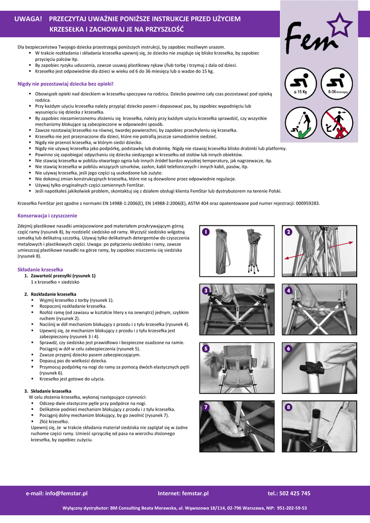 UWAGA! PRZECZYTAJ UWAŻNIE PONIŻSZE INSTRUKCJE PRZED UŻYCIEM KRZESEŁKA I ZACHOWAJ JE NA PRZYSZŁOŚĆ Dla bezpieczeństwa Twojego dziecka przestrzegaj poniższych instrukcji, by zapobiec możliwym urazom. W trakcie rozkładania i składania krzesełka upewnij się, że dziecko nie znajduje się blisko krzesełka, by zapobiec przycięciu palców itp. By zapobiec ryzyku uduszenia, zawsze usuwaj plastikowy rękaw i/lub torbę i trzymaj z dala od dzieci. Krzesełko jest odpowiednie dla dzieci w wieku od 6 do 36 miesięcy lub o wadze do 15 kg. Nigdy nie pozostawiaj dziecka bez opieki! Obowiązek opieki nad dzieckiem w krzesełku spoczywa na rodzicu. Dziecko powinno cały czas pozostawać pod opieką rodzica. Przy każdym użyciu krzesełka należy przypiąć dziecko pasem i dopasować pas, by zapobiec wypadnięciu lub wysunięciu się dziecka z krzesełka. By zapobiec niezamierzonemu złożeniu się krzesełka, należy przy każdym użyciu krzesełka sprawdzić, czy wszystkie mechanizmy blokujące są zabezpieczone w odpowiedni sposób. Zawsze rozstawiaj krzesełko na równej, twardej powierzchni, by zapobiec przechyleniu się krzesełka. Krzesełko nie jest przeznaczone dla dzieci, które nie potrafią jeszcze samodzielnie siedzieć. Nigdy nie przenoś krzesełka, w którym siedzi dziecko. Nigdy nie używaj krzesełka jako podpórkę, podstawkę lub drabinkę. Nigdy nie stawiaj krzesełka blisko drabinki lub platformy. Powinno się zapobiegać odpychaniu się dziecka siedzącego w krzesełku od stołów lub innych obiektów. Nie stawiaj krzesełka w pobliżu otwartego ognia lub innych źródeł bardzo wysokiej temperatury, jak nagrzewacze, itp. Nie stawiaj krzesełka w pobliżu wiszących sznurków, zasłon, kabli telefonicznych i innych kabli, pasów, itp. Nie używaj krzesełka, jeśli jego części są uszkodzone lub zużyte. Nie dokonuj zmian konstrukcyjnych krzesełka, które nie są dozwolone przez odpowiednie regulacje. Używaj tylko oryginalnych części zamiennych FemStar. Jeśli napotkałeś jakikolwiek problem, skontaktuj się z działem obsługi klienta FemStar lub dystrybutorem na terenie Polski. Krzesełko FemStar jest zgodne z normami EN 14988-1:2006(E), EN 14988-2:2006(E), ASTM 404 oraz opatentowane pod numer rejestracji: 000959283. Konserwacja i czyszczenie Zdejmij plastikowe nasadki umiejscowione pod materiałem przykrywającym górną część ramy (rysunek 8), by rozdzielić siedzisko od ramy. Wyczyść siedzisko wilgotną szmatką lub delikatną szczotką. Używaj tylko delikatnych detergentów do czyszczenia metalowych i plastikowych części. Uwaga: po połączeniu siedzisko i ramy, zawsze umieszczaj plastikowe nasadki na górze ramy, by zapobiec niszczeniu się siedziska (rysunek 8). Składanie krzesełka 1. Zawartość przesyłki (rysunek 1) 1 x krzesełko + siedzisko 2. Rozkładanie krzesełka Wyjmij krzesełko z torby (rysunek 1). Rozpocznij rozkładanie krzesełka. Rozłóż ramę (od zawiasu w kształcie litery x na zewnątrz) jednym, szybkim ruchem (rysunek 2). Naciśnij w dół mechanizm blokujący z przodu i z tyłu krzesełka (rysunek 4). Upewnij się, że mechanizm blokujący z przodu i z tyłu krzesełka jest zabezpieczony (rysunek 3 i 4). Sprawdź, czy siedzisko jest prawidłowo i bezpieczne osadzone na ramie. Pociągnij w dół w celu zabezpieczenia (rysunek 5). Zawsze przypnij dziecko pasem zabezpieczającym. Dopasuj pas do wielkości dziecka. Przymocuj podpórkę na nogi do ramy za pomocą dwóch elastycznych pętli (rysunek 6). Krzesełko jest gotowe do użycia. 3. Składanie krzesełka W celu złożenia krzesełka, wykonaj następujące czynności: Odczep dwie elastyczne pętle przy podpórce na nogi. Delikatnie podnieś mechanizm blokujący z przodu i z tyłu krzesełka. Pociągnij dolny mechanizm blokujący, by go zwolnić (rysunek 7). Złóż krzesełko. Upewnij się, że w trakcie składania materiał siedziska nie zaplątał się w żadne ruchome części ramy. Umieść sprzączkę od pasa na wierzchu złożonego krzesełka, by zapobiec zużyciu. e-mail: [email protected] Internet: femstar.pl tel.: 502 425 745 Wyłączny dystrybutor: BM Consulting Beata Morawska, ul. Wąwozowa 18/114, 02-796 Warszawa, NIP: 951-202-59-53