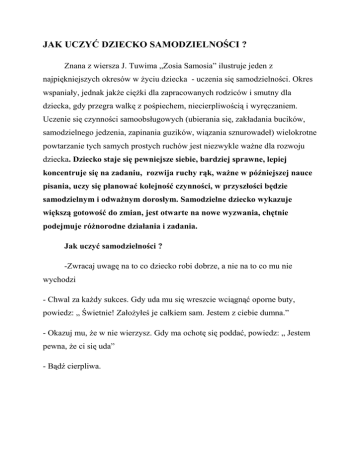 JAK UCZYĆ DZIECKO SAMODZIELNOŚCI ? Znana z wiersza J. Tuwima „Zosia Samosia” ilustruje jeden z najpiękniejszych okresów w życiu dziecka - uczenia się samodzielności. Okres wspaniały, jednak jakże ciężki dla zapracowanych rodziców i smutny dla dziecka, gdy przegra walkę z pośpiechem, niecierpliwością i wyręczaniem. Uczenie się czynności samoobsługowych (ubierania się, zakładania bucików, samodzielnego jedzenia, zapinania guzików, wiązania sznurowadeł) wielokrotne powtarzanie tych samych prostych ruchów jest niezwykle ważne dla rozwoju dziecka. Dziecko staje się pewniejsze siebie, bardziej sprawne, lepiej koncentruje się na zadaniu, rozwija ruchy rąk, ważne w późniejszej nauce pisania, uczy się planować kolejność czynności, w przyszłości będzie samodzielnym i odważnym dorosłym. Samodzielne dziecko wykazuje większą gotowość do zmian, jest otwarte na nowe wyzwania, chętnie podejmuje różnorodne działania i zadania. Jak uczyć samodzielności ? -Zwracaj uwagę na to co dziecko robi dobrze, a nie na to co mu nie wychodzi - Chwal za każdy sukces. Gdy uda mu się wreszcie wciągnąć oporne buty, powiedz: „ Świetnie! Założyłeś je całkiem sam. Jestem z ciebie dumna.” - Okazuj mu, że w nie wierzysz. Gdy ma ochotę się poddać, powiedz: „ Jestem pewna, że ci się uda” - Bądź cierpliwa. - Nie wyręczaj dziecka, jeśli nie jest to konieczne - Nie ucz go nowych umiejętności, gdy się spieszysz lub jesteś bardzo zajęta. Nauka wymaga czasu. - Nie wyśmiewaj się z dziecka ani nie porównuj go z innymi. PRAKTYCZNE RADY POMOCNE W UBIERANIU - Dokładnie wyjaśnij jak najłatwiej włożyć spodnie ( na siedząco, niekoniecznie obie nogawki naraz), skarpetki ( najpierw palce, później pięta), rajstopy ( najlepiej zrolować nogawki), bluzkę ( najpierw głowa, później ręce), kurtkę ( zatrzaski zapinamy od dołu) - Pomóż dziecku rozpoznać przód i tył ubrania. Przyda się kilka ogólnych wskazówek np. „ metka z tyłu”, „ obrazek na brzuchu”, „ kieszenie z przodu” - Zwróć uwagę, żeby dziurki nie były za małe ( guziki muszą w nie lekko wchodzić). Suwak powinien mieć duży dzyndzelek na końcu, by było za co chwycić ( jeśli go nie ma, przewlecz przez dziurkę metalowe kółeczko). - Łatwiej zapiąć guziki, czy suwak na kimś, bo wtedy można zobaczyć, co się robi. Kiedy idziecie na spacer poproś by dziecko zapięło ci kurtkę. - Sposobem ułatwiającym trafienie prawą noga w prawy i lewą w lewy but jest oznakowanie ich kolorowymi kropkami. Gdy malec dobrze założy buty kropki się zetkną. - Włóż do dużego pudła jak najwięcej ciuchów( stare sukienki, marynarki, szaliki, kapelusze) i pozwól dziecku ubrać się w co zechce – to też ćwiczenie. opracowała: mgr Małgorzata Ożóg Przedszkole Samorządowe nr 95