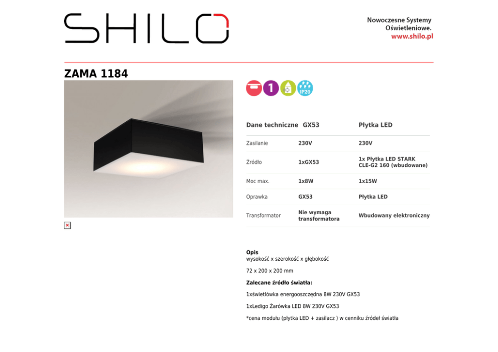 ZAMA 1184 Dane techniczne GX53 Płytka LED Zasilanie 230V 230V Źródło 1xGX53 1x Płytka LED STARK CLE-G2 160 (wbudowane) Moc max. 1x8W 1x15W Oprawka GX53 Płytka LED Transformator Nie wymaga transformatora Wbudowany elektroniczny Opis wysokość x szerokość x głębokość 72 x 200 x 200 mm Zalecane źródło światła: 1xświetlówka energooszczędna 8W 230V GX53 1xLedigo Żarówka LED 8W 230V GX53 *cena modułu (płytka LED + zasilacz ) w cenniku źródeł światła