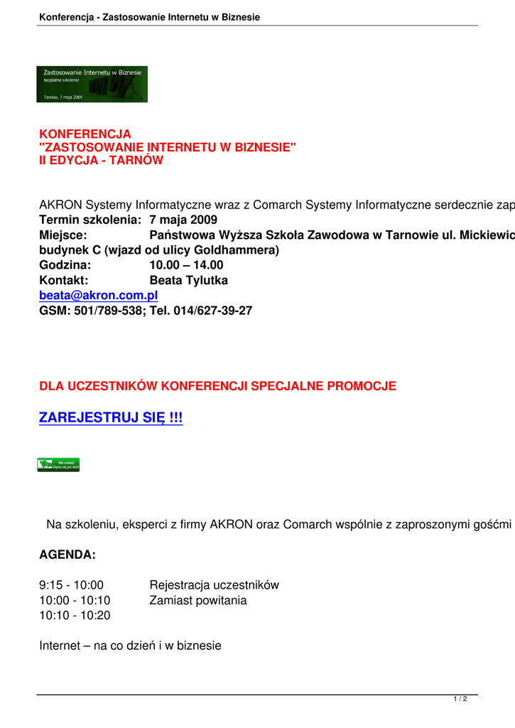 Konferencja - Zastosowanie Internetu w Biznesie KONFERENCJA "ZASTOSOWANIE INTERNETU W BIZNESIE" II EDYCJA - TARNÓW AKRON Systemy Informatyczne wraz z Comarch Systemy Informatyczne serdecznie zap Termin szkolenia: 7 maja 2009 Miejsce: Państwowa Wyższa Szkoła Zawodowa w Tarnowie ul. Mickiewic budynek C (wjazd od ulicy Goldhammera) Godzina: 10.00 – 14.00 Kontakt: Beata Tylutka [email protected] GSM: 501/789-538; Tel. 014/627-39-27 DLA UCZESTNIKÓW KONFERENCJI SPECJALNE PROMOCJE ZAREJESTRUJ SIĘ !!! Na szkoleniu, eksperci z firmy AKRON oraz Comarch wspólnie z zaproszonymi gośćmi AGENDA: 9:15 - 10:00 10:00 - 10:10 10:10 - 10:20 Rejestracja uczestników Zamiast powitania Internet – na co dzień i w biznesie 1/2 Konferencja - Zastosowanie Internetu w Biznesie 10:20 - 10:50 Działania e-marketingowe dla firm, czyli jak pozyskiwać klientów w Internecie oraz wzbud 10:50 - 11:40 Nowoczesna firma o Wykorzystuj na co dzień możliwości Internetu o Elektroniczna wymiana danych o Zarządzanie bez granic 11:40 - 12:00 12:00 - 13:20 Przerwa kawowa Wyprzedź konkurencję o Zbuduj swój sklep internetowy w 20 minut! o Twoja firma tam gdzie Ty! 13:20 - 13:35 Magia Internetu 13:35 - 13:45 Optymistyczne zakończenie 2/2