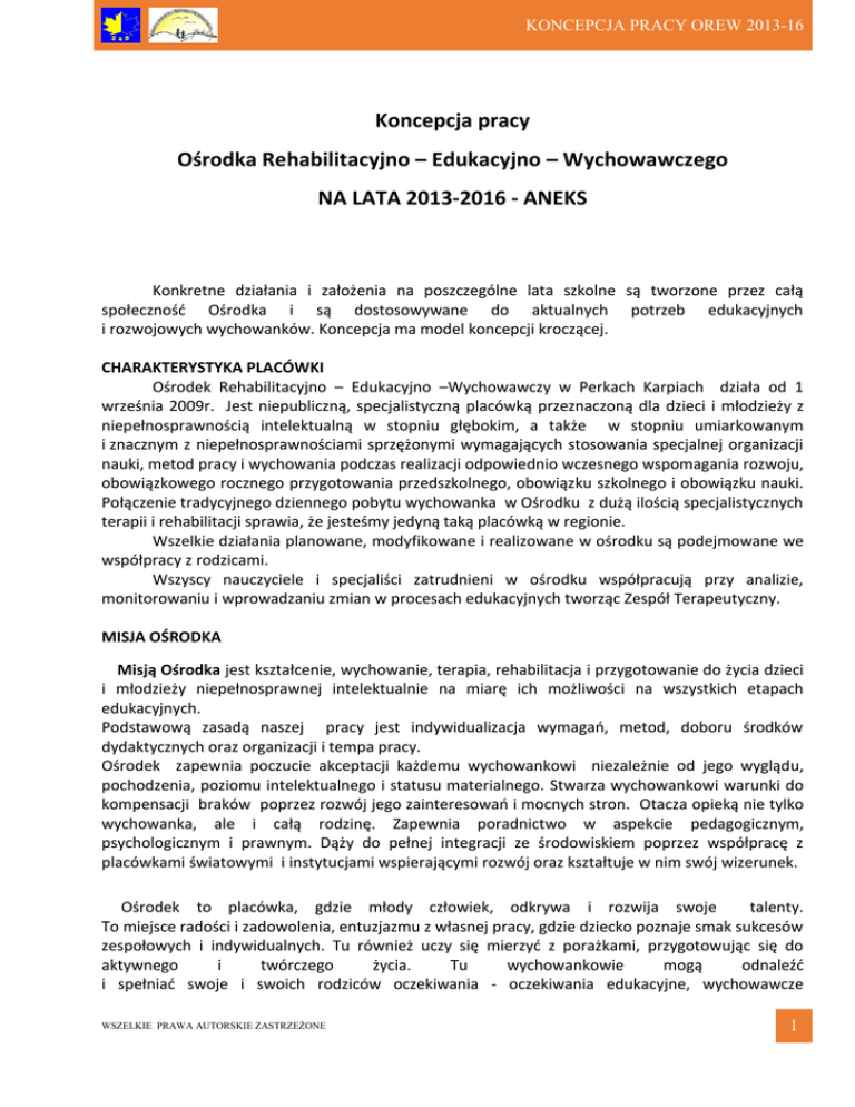 KONCEPCJA PRACY OREW 2013-16 Koncepcja pracy Ośrodka Rehabilitacyjno – Edukacyjno – Wychowawczego NA LATA 2013-2016 - ANEKS Konkretne działania i założenia na poszczególne lata szkolne są tworzone przez całą społeczność Ośrodka i są dostosowywane do aktualnych potrzeb edukacyjnych i rozwojowych wychowanków. Koncepcja ma model koncepcji kroczącej. CHARAKTERYSTYKA PLACÓWKI Ośrodek Rehabilitacyjno – Edukacyjno –Wychowawczy w Perkach Karpiach działa od 1 września 2009r. Jest niepubliczną, specjalistyczną placówką przeznaczoną dla dzieci i młodzieży z niepełnosprawnością intelektualną w stopniu głębokim, a także w stopniu umiarkowanym i znacznym z niepełnosprawnościami sprzężonymi wymagających stosowania specjalnej organizacji nauki, metod pracy i wychowania podczas realizacji odpowiednio wczesnego wspomagania rozwoju, obowiązkowego rocznego przygotowania przedszkolnego, obowiązku szkolnego i obowiązku nauki. Połączenie tradycyjnego dziennego pobytu wychowanka w Ośrodku z dużą ilością specjalistycznych terapii i rehabilitacji sprawia, że jesteśmy jedyną taką placówką w regionie. Wszelkie działania planowane, modyfikowane i realizowane w ośrodku są podejmowane we współpracy z rodzicami. Wszyscy nauczyciele i specjaliści zatrudnieni w ośrodku współpracują przy analizie, monitorowaniu i wprowadzaniu zmian w procesach edukacyjnych tworząc Zespół Terapeutyczny. MISJA OŚRODKA Misją Ośrodka jest kształcenie, wychowanie, terapia, rehabilitacja i przygotowanie do życia dzieci i młodzieży niepełnosprawnej intelektualnie na miarę ich możliwości na wszystkich etapach edukacyjnych. Podstawową zasadą naszej pracy jest indywidualizacja wymagań, metod, doboru środków dydaktycznych oraz organizacji i tempa pracy. Ośrodek zapewnia poczucie akceptacji każdemu wychowankowi niezależnie od jego wyglądu, pochodzenia, poziomu intelektualnego i statusu materialnego. Stwarza wychowankowi warunki do kompensacji braków poprzez rozwój jego zainteresowań i mocnych stron. Otacza opieką nie tylko wychowanka, ale i całą rodzinę. Zapewnia poradnictwo w aspekcie pedagogicznym, psychologicznym i prawnym. Dąży do pełnej integracji ze środowiskiem poprzez współpracę z placówkami światowymi i instytucjami wspierającymi rozwój oraz kształtuje w nim swój wizerunek. Ośrodek to placówka, gdzie młody człowiek, odkrywa i rozwija swoje talenty. To miejsce radości i zadowolenia, entuzjazmu z własnej pracy, gdzie dziecko poznaje smak sukcesów zespołowych i indywidualnych. Tu również uczy się mierzyć z porażkami, przygotowując się do aktywnego i twórczego życia. Tu wychowankowie mogą odnaleźć i spełniać swoje i swoich rodziców oczekiwania - oczekiwania edukacyjne, wychowawcze WSZELKIE PRAWA AUTORSKIE ZASTRZEŻONE 1 KONCEPCJA PRACY OREW 2013-16 i społeczne. Dyrekcja, terapeuci i wszyscy pracownicy OREW organizują proces nauczania i wychowania tak, aby wspierać rodziców w wychowaniu wielostronnym, uwzględniającym harmonijny rozwój intelektualny i duchowy. Nie dzielimy naszych wychowanków na dobrych i złych, zdolnych i niezdolnych. Dostrzegamy w każdym dziecku pewne predyspozycje, umiejętności i rozwijamy je. W swojej pracy opieramy się na wartościach takich jak: uczciwość, odpowiedzialność, szacunek. Celem naszej pracy jest uzyskanie przez wychowanka autonomii rozumianej jako niezależność, samodzielność i zaradność życiowa na miarę indywidualnych potrzeb i możliwości rozwojowych oraz wszechstronne przygotowanie osoby niepełnosprawnej umysłowo do satysfakcjonującego wszystkich funkcjonowania w społeczeństwie. Przekazujemy naszym wychowankom te wartości, według których sami postępujemy. Pragniemy, aby byli oni szczęśliwi, bezpieczni i otoczeni miłością . CELE I ZADANIA PLACÓWKI W STOSUNKU DO WYCHOWANKÓW 1. 2. 3. 4. 5. 6. 7. 8. 9. 10. 11. 12. 13. 14. 15. 16. 17. 18. Uzyskanie przez wychowanków autonomii rozumianej jako niezależność, samodzielność i zaradność życiowa na miarę indywidualnych potrzeb i możliwości rozwojowych. Prowadzenie działań edukacyjnych i rehabilitacyjnych ukierunkowanych na zaspokojenie specyficznych potrzeb zgodnie z indywidualnym programem edukacyjno-terapeutycznym. Realizacja zaleceń zawartych w orzeczeniach o potrzebie kształcenia specjalnego. Zaopatrzenie w odpowiednie, ze względu na indywidualne potrzeby rozwojowe i edukacyjne oraz możliwości psychofizyczne wychowanków, warunki do nauki, sprzęt specjalistyczny i środki dydaktyczne. Dostosowanie zajęć specjalistycznych do indywidualnych możliwości i potrzeb. Wspomaganie wszechstronnego i harmonijnego rozwoju wychowanków. Rozwój osobowości, umiejętności i wiadomości potrzebnych do zdobycia niezależności i zaradności życiowej. Rozwój samoakceptacji, poczucia własnej wartości, poczucia pewności siebie. Poprawa sprawności psychoruchowej lub zapobieganie jej pogarszaniu. Rozwój procesów poznawczych. Rozwój umiejętności społecznych, w tym umiejętności komunikacji. Rozwój zainteresowania ludźmi i otaczającym światem, poznawanie rzeczy, zjawisk i procesów w nim zachodzących. Kształtowanie umiejętności współżycia w grupie. Rozwój indywidualnych uzdolnień i zainteresowań oraz umożliwienie samorealizacji. Przygotowanie do pełnienia różnych ról społecznych, autonomii oraz prowadzenia aktywnego dorosłego życia. Integracja ze środowiskiem rówieśniczym i lokalnym. Kształtowanie umiejętności samodzielnego organizowania wypoczynku i czasu wolnego. Doskonalenie sprawności i wydolności fizycznej oraz prowadzenie różnorodnych działań prozdrowotnych. CELE I ZADANIA PLACÓWKI W STOSUNKU DO RODZICÓW 1. Wsparcie w rozpoznaniu, rozumieniu i zaspokajaniu przez rodzinę potrzeb rozwojowych, psychicznych i społecznych dziecka, WSZELKIE PRAWA AUTORSKIE ZASTRZEŻONE 2 KONCEPCJA PRACY OREW 2013-16 2. 3. 4. 5. 6. 7. Wsparcie rodziny w syt
