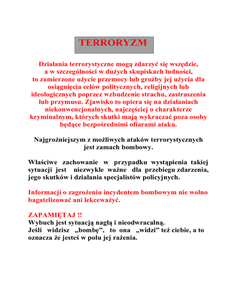TERRORYZM Działania terrorystyczne mogą zdarzyć się wszędzie, a w szczególności w dużych skupiskach ludności, to zamierzone użycie przemocy lub groźby jej użycia dla osiągnięcia celów politycznych, religijnych lub ideologicznych poprzez wzbudzenie strachu, zastraszenia lub przymusu. Zjawisko to opiera się na działaniach niekonwencjonalnych, najczęściej o charakterze kryminalnym, których skutki mają wykraczać poza osoby będące bezpośrednimi ofiarami ataku. Najgroźniejszym z możliwych ataków terrorystycznych jest zamach bombowy. Właściwe zachowanie w przypadku wystąpienia takiej sytuacji jest niezwykle ważne dla przebiegu zdarzenia, jego skutków i działania specjalistów policyjnych. Informacji o zagrożeniu incydentem bombowym nie wolno bagatelizować ani lekceważyć. ZAPAMIĘTAJ !! Wybuch jest sytuacją nagłą i nieodwracalną. Jeśli widzisz „bombę”, to ona „widzi” też ciebie, a to oznacza że jesteś w polu jej rażenia. Symptomy wystąpienia zagrożenia incydentem bombowym Podstawową cechą terroryzmu jest to, że nie ma wyraźnych znaków ostrzegawczych o możliwości wystąpienia zamachu lub są one trudno dostrzegalne. Dlatego zwracaj uwagę na to, co dzieje się w najbliższym otoczeniu, np. podczas zakupów, w podróży, podczas uczestnictwa w imprezach masowych, uroczystościach religijnych i innych miejscach publicznych, gdzie przebywa duża liczba ludzi. Zainteresowania i uwagi wymagają: • rzucające się w oczy nietypowe zachowania się osób; • pozostawione bez opieki przedmioty typu: teczki, paczki, pakunki itp.; • osoby ubrane nietypowo do występującej pory roku; • samochody, a w szczególności furgonetki pozostawione w nietypowych miejscach tj. w pobliżu kościołów lub miejsc organizowania imprez masowych, zawodów sportowych i zgromadzeń. Należy jednak pamiętać, że terrorysta nie zawsze musi wyróżniać się z tumu szczególnym wyglądem. O swoich spostrzeżeniach poinformuj: służby odpowiedzialne za bezpieczeństwo obiektu, Straż Miejską lub Policję. Jak postępować w sytuacjach zagrożenia incydentem bombowym. Możesz przygotować się na wypadek powstania tego typu zagrożeń w miejscach użyteczności publicznej: • pomyśl, którędy w pośpiechu można się ewakuować z budynku, metra, sklepu, lub innych zatłoczonych miejsc; • zapamiętaj, gdzie znajdują się klatki schodowe i wyjścia Ewakuacyjne, a przede wszystkim tzw. Drogi ewakuacyjne; • zwróć uwagę na ciężkie lub łatwo tłukące się przedmioty, które mogą być przesunięte, zrzucone lub zniszczone podczas wybuchu. Zapamiętaj elementy z najbliższego otoczenia. Pamiętaj o tym, aby nie przyjmować od obcych osób żad nych pakunków, nie pozostawiać własnego bagażu bez opieki. Jeżeli jesteś osobą, która dowiedziała się o podłożeniu ładunku wybuchowego lub ujawniła przedmiot niewiaromego pochodzenia, co do którego istnieje podejrzenie, że może ono stanowić zagrożenie dla osób i mienia, powinieneś natychmiast ten fakt zgłosić służbą odpowiedzialnym za bezpieczeństwo na tym terenie – w najbliższej jednostce Policji lub Straży Miejskiej, władzą administracyjnym. Informacji takiej nie należy rozpowszechniać, gdyż jej przekazanie osobom trzecim, może doprowadzić do paniki i w konsekwencji utrudnić przeprowadzenie sprawnej ewakuacji osób z zagrożonego miejsca. Zawiadamiając Policję staraj się podać następujące informacje: • rodzaj zagrożenia i źródło informacji o podłożeniu ładunku wybuchowego; • treść rozmowy z osobą przekazującą informację o zagrożeniu (informacja telefoniczna, ujawniony podejrzany przedmiot); • numer telefonu na który przekazano informację o podło- żeniu ładunku wybuchowego, opis miejsca i wygląd ujawnionego przedmiotu. Ogłoszenie alarmu bombowego oraz procedury postępowania w czasie zagrożenia bombowego Do czasu przybycia Policji należy w miarę możliwości zabezpieczyć zagrożone miejsce, zachowując elementarne środki bezpieczeństwa, bez narażenia siebie i innych osób na niebezpieczeństwo. Po przybyciu Policji na miejsce incydentu bombowego, przejmuje ona dalsze kierowanie akcją. Należy bezwzględnie wykonywać polecenia policjantów !!. Przy braku informacji o konkretnym miejscu podłożenia „bomby” użytkownicy pomieszczeń powinni sprawdzić swoje miejsce pracy i jego bezpośrednie otoczenia celem odnalezienia przedmiotów nieznanego pochodzenia. Podejrzanych przedmiotów nie wolno dotykać !!, o ich lokalizacji należy powiadomić administratora obiektu. Pomieszczenia ogólnodostępne (korytarze, klatki schodowe windy, toalety, piwnice, strychy) oraz najbliższe otoczenie zewnętrzne obiektu sprawdzają i przeszukują osoby wyznaczone lub służby odpowiedzialne za bezpieczeństwo w danej instytucji. Po ogłoszeniu ewakuacji należy zachować spokój i opanowanie, pozwoli to sprawnie i bezpiecznie opuścić zagrożony rejon. Po ogłoszeniu ewakuacji w miejscu twojej pracy należy je opuścić, zabierając rzeczy osobiste ( torebki, siatki itp.). Identyfikacją i rozpoznawaniem zlokalizowanego ładunku wybuchowego oraz jego neutralizacją zajmują się uprawnione i wyspecjalizowane jednostki i komórki organizacyjne Policji. Jak powinieneś zachować się po otrzymaniu informacji o podłożeniu lub groźbie podłożenia „bomby” Podczas działań, związanych z neutralizacja „bomby”, zastosuj się do poleceń Policji. Ciekawość jest niebezpieczna – jak najszybciej oddal się z miejsca zagrożonego wybuchem. Po drodze informuj o zagrożeniu jak największe grono osób, będących w strefie zagrożonej lub kierujących się w jej stronę. Po ogłoszeniu alarmu i zarządzeniu ewakuacji w obiektach publicznych , np. supermarketach, halach widowiskowo – sportowych, kinach, niezwłocznie udaj się do wyjścia, zgodnie ze wskazaniami administratora budynku lub wskazaniami upoważnionych osób. W przypadku wł