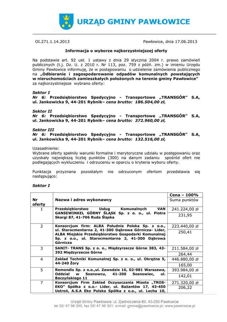 OI.271.1.14.2013 Pawłowice, dnia 17.06.2013 Informacja o wyborze najkorzystniejszej oferty Na podstawie art. 92 ust. 1 ustawy z dnia 29 stycznia 2004 r. prawo zamówień publicznych (t.j. Dz. U. z 2010 r. Nr 113, poz. 759 z późń. zm.) w imieniu Urzędu Gminy Pawłowice informuję, że w postępowaniu o udzielenie zamówienia publicznego na „Odbieranie i zagospodarowanie odpadów komunalnych powstających w nieruchomościach zamieszkałych położonych na terenie gminy Pawłowice” za najkorzystniejsze wybrano oferty: Sektor I Nr 6: Przedsiębiorstwo Spedycyjno - Transportowe „TRANSGÓR” ul. Jankowicka 9, 44-201 Rybnik– cena brutto: 186.504,00 zł, S.A, Sektor II Nr 6: Przedsiębiorstwo Spedycyjno - Transportowe „TRANSGÓR” ul. Jankowicka 9, 44-201 Rybnik– cena brutto: 372.960,00 zł, S.A, Sektor III Nr 6: Przedsiębiorstwo Spedycyjno - Transportowe „TRANSGÓR” ul. Jankowicka 9, 44-201 Rybnik– cena brutto: 132.516,00 zł, S.A, Uzasadnienie: Wybrane oferty spełniły warunki formalne i merytoryczne udziału w postępowaniu oraz uzyskały największą liczbę punktów (300) na danym zadaniu spośród ofert nie podlegających wykluczeniu i odrzuceniu w oparciu o kryteria wyboru oferty. Punktacja przyznana następująco: pozostałym nie odrzuconym ofertom przedstawia się Sektor I Nr oferty 1 Nazwa i adres wykonawcy Cena – 100% Suma punktów Przedsiębiorstwo Usług Komunalnych VAN GANSEWINKEL GÓRNY ŚLĄSK Sp. z o. o., ul. Piotra Skargi 87, 41-706 Ruda Śląska 241.224,00 zł Konsorcjum firm: ALBA Południe Polska Sp. z o.o., ul. Starocmentarna 2, 41-300 Dąbrowa Górnicza- Lider, ALBA Miejskie Przedsiębiorstwo Gospodarki Komunalnej Sp. z o.o., ul. Starocmentarna 2, 41-300 Dąbrowa Górnicza 223.440,00 zł 3 SANIT- TRANS Sp. z o. o., Międzyrzecze Górne 383, 43392 Międzyrzecze Górne 211.584,00 zł 4 Zakład Techniki Komunalnej Sp. z o. o., ul. Okrężna 5, 44-240 Żory 5 Remondis Sp. z o.o.,ul. Zawodzie 16, 02-981 Warszawa, Oddział w Sosnowcu, 41-200 Sosnowiec, ul. Baczyńskiego 11 Konsorcjum Firm Zakład Oczyszczania Miasta „TROSEKO” Spółka z o.o.- Lider, ul. Bażantów 17, 43-450 Ustroń, A.S.A Eko Polska Spółka z o.o., ul. Lecha 10, 2 7 231,95 250,41 264,44 446.880,00 zł 165,00 393.984,00 zł 142,01 271.320,00 zł 206,22 8 9 10 41-800 Zabrze Konsorcjum firm: Przedsiębiorstwo Produkcyjno Usługowo Handlowe „Komunalnik” Sp. z o.o.- Lider , ul. Kolejowa 30, 44-338 Jastrzębie Zdrój, „EKO- MAR” Sp. z o.o., ul. Rozwojowa 1, 44-338 Jastrzębie Zdrój 245.784,00 zł 227,64 „EKO” M. Golik, J. Konsek, J. ul. Kościuszki 45 A, 44-200 Rybnik 226.632,00 zł 246,88 Serwotka Sp. J., Przedsiębiorstwo Usług Komunalnych Sp. z o.o., ul. Kokotek 33, 41-700 Ruda Śląska 246.240,00 zł 227,22 Sektor II Nr oferty 1 Cena – 100% Suma punktów Nazwa i adres wykonawcy Przedsiębiorstwo Usług Komunalnych VAN GANSEWINKEL GÓRNY ŚLĄSK Sp. z o. o., ul. Piotra Skargi 87, 41-706 Ruda Śląska Konsorcjum firm: ALBA Południe Polska Sp. z o.o., ul. Starocmentarna 2, 41-300 Dąbrowa Górnicza- Lider, ALBA Miejskie Przedsiębiorstwo Gospodarki Komunalnej Sp. z o.o., ul. Starocmentarna 2, 41-300 Dąbrowa Górnicza 483.960,00 zł 4 Zakład Techniki Komunalnej Sp. z o. o., ul. Okrężna 5, 44-240 Żory 395.160,00 zł 7 Konsorcjum Firm Zakład Oczyszczania Miasta „TROSEKO” Spółka z o.o.- Lider, ul. Bażantów 17, 43-450 Ustroń, A.S.A Eko Polska Spółka z o.o., ul. Lecha 10, 41-800 Zabrze 8 Konsorcjum firm: Przedsiębiorstwo Produkcyjno Usługowo Handlowe „Komunalnik” Sp. z o.o.- Lider , ul. Kolejowa 30, 44-338 Jastrzębie Zdrój, „EKO- MAR” Sp. z o.o., ul. Rozwojowa 1, 44-338 Jastrzębie Zdrój 488.400,00 zł 229,09 9 „EKO” M. Golik, J. Konsek, J. ul. Kościuszki 45 A, 44-200 Rybnik 451.104,00 zł 248,03 2 10 Serwotka Sp. J., Przedsiębiorstwo Usług Komunalnych Sp. z o.o., ul. Kokotek 33, 41-700 Ruda Śląska 231,19 411.144,00 zł 272,14 283,15 377.400,00 zł 296,47 416.472,00 zł 268,66 Sektor III Nr oferty 1 2 3 Nazwa i adres wykonawcy Cena – 100% Suma punktów Przedsiębiorstwo Usług Komunalnych VAN GANSEWINKEL GÓRNY ŚLĄSK Sp. z o. o., ul. Piotra Skargi 87, 41-706 Ruda Śląska 171.396,00 zł Konsorcjum firm: ALBA Południe Polska Sp. z o.o., ul. Starocmentarna 2, 41-300 Dąbrowa Górnicza- Lider, ALBA Miejskie Przedsiębiorstwo Gospodarki Komunalnej Sp. z o.o., ul. Starocmentarna 2, 41-300 Dąbrowa Górnicza 157.140,00 zł SANIT- TRANS Sp. z o. o., Międzyrzecze Górne 383, 43392 Międzyrzecze Górne 150.336,00 zł 231,95 252,99 264,44 4 Zakład Techniki Komunalnej Sp. z o. o., ul. Okrężna 5, 44-240 Żory 5 Remondis Sp. z o.o.,ul. Zawodzie 16, 02-981 Warszawa, Oddział w Sosnowcu, 41-200 Sosnowiec, ul. Baczyńskiego 11 176.580,00 zł 296,70 279.936,00 zł 142,01 7 Konsorcjum Firm Zakład Oczyszczania Miasta „TROSEKO” Spółka z o.o.- Lider, ul. Bażantów 17, 43-450 Ustroń, A.S.A Eko Polska Spółka z o.o., ul. Lecha 10, 41-800 Zabrze 186.300,00 zł 213,39 8 Konsorcjum firm: Przedsiębiorstwo Produkcyjno Usługowo Handlowe „Komunalnik” Sp. z o.o.- Lider , ul. Kolejowa 30, 44-338 Jastrzębie Zdrój, „EKO- MAR” Sp. z o.o., ul. Rozwojowa 1, 44-338 Jastrzębie Zdrój 174.636,00 zł 227,64 9 „EKO” M. Golik, J. Konsek, J. ul. Kościuszki 45 A, 44-200 Rybnik 161.028,00 zł 246,88 10 Serwotka Przedsiębiorstwo Usług Komunalnych Sp. z o.o., ul. Kokotek 33, 41-700 Ruda Śląska Sp. J., 181.440,00 zł 219,11 Zatwierdził Wójt Gminy mgr inż. Damian Galusek
