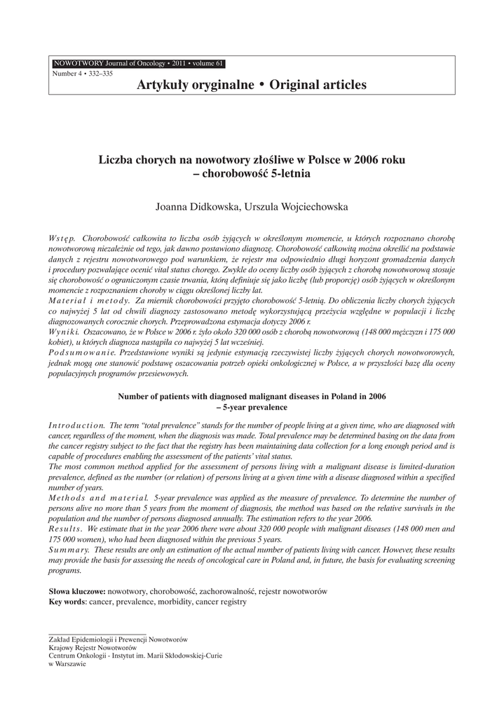 NOWOTWORY Journal of Oncology • 2011 • volume 61 Number 4 • 332–335 Artykuły oryginalne • Original articles Liczba chorych na nowotwory złośliwe w Polsce w 2006 roku – chorobowość 5-letnia Joanna Didkowska, Urszula Wojciechowska Ws t ę p. Chorobowość całkowita to liczba osób żyjących w określonym momencie, u których rozpoznano chorobę nowotworową niezależnie od tego, jak dawno postawiono diagnozę. Chorobowość całkowitą można określić na podstawie danych z rejestru nowotworowego pod warunkiem, że rejestr ma odpowiednio długi horyzont gromadzenia danych i procedury pozwalające ocenić vital status chorego. Zwykle do oceny liczby osób żyjących z chorobą nowotworową stosuje się chorobowość o ograniczonym czasie trwania, którą definiuje się jako liczbę (lub proporcję) osób żyjących w określonym momencie z rozpoznaniem choroby w ciągu określonej liczby lat. M a t e r i a ł i m e t o d y. Za miernik chorobowości przyjęto chorobowość 5-letnią. Do obliczenia liczby chorych żyjących co najwyżej 5 lat od chwili diagnozy zastosowano metodę wykorzystującą przeżycia względne w populacji i liczbę diagnozowanych corocznie chorych. Przeprowadzona estymacja dotyczy 2006 r. W y n i k i. Oszacowano, że w Polsce w 2006 r. żyło około 320 000 osób z chorobą nowotworową (148 000 mężczyzn i 175 000 kobiet), u których diagnoza nastąpiła co najwyżej 5 lat wcześniej. P o d s u m o w a n i e. Przedstawione wyniki są jedynie estymacją rzeczywistej liczby żyjących chorych nowotworowych, jednak mogą one stanowić podstawę oszacowania potrzeb opieki onkologicznej w Polsce, a w przyszłości bazę dla oceny populacyjnych programów przesiewowych. Number of patients with diagnosed malignant diseases in Poland in 2006 – 5-year prevalence I n t r o d u c t i o n. The term “total prevalence” stands for the number of people living at a given time, who are diagnosed with cancer, regardless of the moment, when the diagnosis was made. Total prevalence may be determined basing on the data from the cancer registry subject to the fact that the registry has been maintaining data collection for a long enough period and is capable of procedures enabling the assessment of the patients’ vital status. The most common method applied for the assessment of persons living with a malignant disease is limited-duration prevalence, defined as the number (or relation) of persons living at a given time with a disease diagnosed within a specified number of years. M e t h o d s a n d m a t e r i a l. 5-year prevalence was applied as the measure of prevalence. To determine the number of persons alive no more than 5 years from the moment of diagnosis, the method was based on the relative survivals in the population and the number of persons diagnosed annually. The estimation refers to the year 2006. R e s u l t s . We estimate that in the year 2006 there were about 320 000 people with malignant diseases (148 000 men and 175 000 women), who had been diagnosed within the previous 5 years. S u m m a r y. These results are only an estimation of the actual number of patients living with cancer. However, these results may provide the basis for assessing the needs of oncological care in Poland and, in future, the basis for evaluating screening programs. Słowa kluczowe: nowotwory, chorobowość, zachorowalność, rejestr nowotworów Key words: cancer, prevalence, morbidity, cancer registry Zakład Epidemiologii i Prewencji Nowotworów Krajowy Rejestr Nowotworów Centrum Onkologii - Instytut im. Marii Skłodowskiej-Curie w Warszawie 333 Wstęp Chorobowość całkowitą można interpretować jako liczbę osób żyjących w określonym momencie, u których rozpoznano chorobę nowotworową, niezależnie od tego, jak dawno postawiono diagnozę. Chorobowość całkowitą można określić na podstawie danych z rejestru nowotworowego pod warunkiem, że w rejestr ma odpowiednio długi horyzont gromadzenia danych i procedury pozwalające ocenić vital status chorego. Rejestry nowotworowe gromadzące dane wystarczająco długo (40-50 lat) oraz dysponujące danymi o wysokiej kompletności, tak aby móc zliczyć wszystkich żyjących chorych, istnieją tylko w kilku krajach (przykładem mogą być rejestry w krajach skandynawskich). Chorobowość całkowitą można również określić na podstawie badań reprezentacyjnych, prosząc o wskazanie, czy kiedykolwiek rozpoznano u respondenta chorobę nowotworową. W latach 80. ubiegłego wieku taką metodą, opierając się na ponad 40 000 próbie, oszacowano całkowitą chorobowość w USA [1]. Stosując tę metodę należy liczyć się z zaniżoną liczbą odpowiedzi (w zależności od stopnia akceptacji choroby w danym społeczeństwie) oraz z błędną klasyfikacją choroby. Zwykle do oceny liczby osób żyjących z chorobą nowotworową stosuje się chorobowość o ograniczonym czasie trwania. Chorobowość o ograniczonym czasie trwania definiuje się jako liczbę (lub proporcję) osób żyjących w określonym momencie z rozpoznaniem choroby w ciągu ostatnich x lat (np. x=5, 10 lub 20 lat). Rejestry gromadzące dane krócej niż 40-50 lat mogą stosować jedynie tę miarę. Wiele rejestrów nowotworowych publikuje chorobowość 1-roczną, 3- i 5-letnią, ponieważ każdy z tych wskaźników może być interpretowany dla większości nowotworów jako, odpowiednio, miernik rozpoczęcia leczenia (szybkości diagnozy), jakości opieki klinicznej i wyleczenia. Materiał i metody Do oszacowania chorobowości w Polsce w 2006 r. wykorzystano zbiór przypadków zachorowań na nowotwory złośliwe z lat 2002-2006 z bazy Krajowego Rejestru Nowotworów. Metoda estymacji liczby chorych została opisana szczegółowo w publikacji „Nowotwory złośliwe w Polsce w 2008 r.” [2, 3]. Jako prawdopodobieństwo przeżycia kolejnego roku od diagnozy dla Tab. I. Chorobowość 5-letnia w Polsce w 2006 roku (chorzy na nowotwory w wieku pow