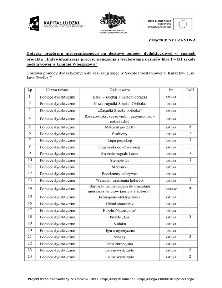 Załącznik Nr 1 do SIWZ Dotyczy przetargu nieograniczonego na dostawę pomocy dydaktycznych w ramach projektu „Indywidualizacja procesu nauczania i wychowania uczniów klas I – III szkoły podstawowej w Gminie Włoszczowa” Dostawa pomocy dydaktycznych do realizacji zajęć w Szkole Podstawowej w Kurzelowie, ul. Jana Brożka 7. Lp Nazwa towaru Opis towaru Jm Ilość 1 Pomoce dydaktyczne Bajki – słuchaj i układaj obrazki sztuka 1 2 Pomoce dydaktyczne Nowe zagadki Smoka Obiboka sztuka 1 3 Pomoce dydaktyczne „Zagadki Smoka obiboka” sztuka 1 4 Pomoce dydaktyczne Rzeczowniki , czasowniki i przymiotniki – pakiet zdjęć sztuka 1 5 Pomoce dydaktyczne Matematyka ZOO sztuka 5 6 Pomoce dydaktyczne Szablony sztuka 7 7 Pomoce dydaktyczne Lupa peryskop sztuka 3 8 Pomoce dydaktyczne Pojemniki do obserwacji sztuka 1 9 Pomoce dydaktyczne Stemple pogoda i czas sztuka 3 10 Pomoce dydaktyczne Stemple las sztuka 3 11 Pomoce dydaktyczne Menzurki sztuka 1 12 Pomoce dydaktyczne Podziemny odkrywca sztuka 1 13 Pomoce dydaktyczne Warsztat mieszania kolorów sztuka 3 14 Pomoce dydaktyczne Barwniki uzupełniające do warsztatu mieszania kolorów (zestaw 3 kolorów) zestaw 20 15 Pomoce dydaktyczne Poznajemy elektryczność sztuka 1 16 Pomoce dydaktyczne Układ słoneczny sztuka 1 17 Pomoce dydaktyczne Puzzle„Nasze ciało” sztuka 1 18 Pomoce dydaktyczne Puzzle „Las sztuka 3 19 Pomoce dydaktyczne Sudoku sztuka 1 20 Pomoce dydaktyczne Igła magnetyczna sztuka 1 21 Pomoce dydaktyczne Szachy sztuka 3 22 Pomoce dydaktyczne Unia europejska sztuka 1 23 Pomoce dydaktyczne Co się wydarzyło sztuka 2 24 Pomoce dydaktyczne Co się wydarzyło sztuka 2 Projekt współfinansowany ze środków Unii Europejskiej w ramach Europejskiego Funduszu Społecznego 25 Pomoce dydaktyczne Kreatywne historie: UFO, O zwierzętach, W podróży, W kręgu rodzinnym Zestaw 1 26 Pomoce dydaktyczne Labirynty z biedronką sztuka 1 27 Pomoce dydaktyczne Labirynt magnetyczny Mrówki sztuka 1 28 Pomoce dydaktyczne Labirynt magnetyczny Myszki sztuka 1 29 Pomoce dydaktyczne Gra – zwierzęta sztuka 1 30 Pomoce dydaktyczne Gra – znajome dźwięki sztuka 1 31 Pomoce dydaktyczne Leniwa ósemka sztuka 1 32 Pomoce dydaktyczne Klocki Technik sztuka 2 33 Pomoc dydaktyczna Rzutnik - view sztuka 1 Projekt współfinansowany ze środków Unii Europejskiej w ramach Europejskiego Funduszu Społecznego
