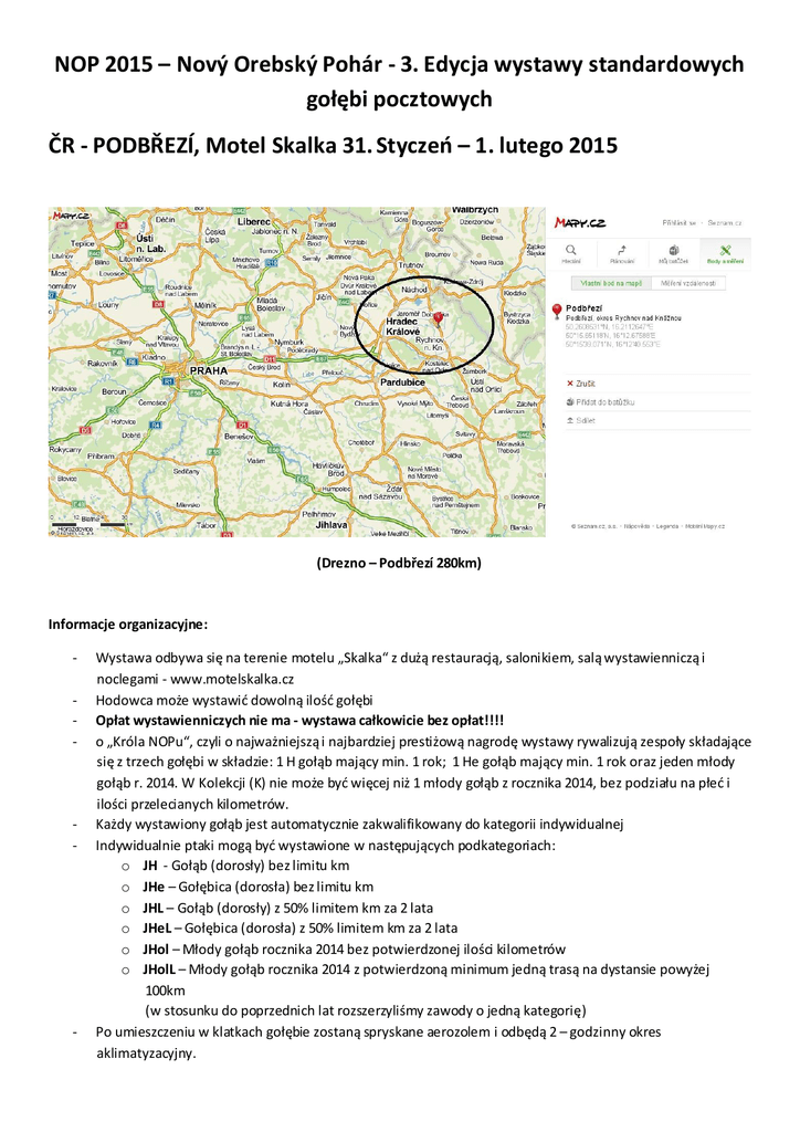 NOP 2015 – Nový Orebský Pohár - 3. Edycja wystawy standardowych gołębi pocztowych ČR - PODBŘEZÍ, Motel Skalka 31. Styczeń – 1. lutego 2015 (Drezno – Podbřezí 280km) Informacje organizacyjne: - - - Wystawa odbywa się na terenie motelu „Skalka“ z dużą restauracją, salonikiem, salą wystawienniczą i noclegami - www.motelskalka.cz Hodowca może wystawić dowolną ilość gołębi Opłat wystawienniczych nie ma - wystawa całkowicie bez opłat!!!! o „Króla NOPu“, czyli o najważniejszą i najbardziej prestiżową nagrodę wystawy rywalizują zespoły składające się z trzech gołębi w składzie: 1 H gołąb mający min. 1 rok; 1 He gołąb mający min. 1 rok oraz jeden młody gołąb r. 2014. W Kolekcji (K) nie może być więcej niż 1 młody gołąb z rocznika 2014, bez podziału na płeć i ilości przelecianych kilometrów. Każdy wystawiony gołąb jest automatycznie zakwalifikowany do kategorii indywidualnej Indywidualnie ptaki mogą być wystawione w następujących podkategoriach: o JH - Gołąb (dorosły) bez limitu km o JHe – Gołębica (dorosła) bez limitu km o JHL – Gołąb (dorosły) z 50% limitem km za 2 lata o JHeL – Gołębica (dorosła) z 50% limitem km za 2 lata o JHol – Młody gołąb rocznika 2014 bez potwierdzonej ilości kilometrów o JHolL – Młody gołąb rocznika 2014 z potwierdzoną minimum jedną trasą na dystansie powyżej 100km (w stosunku do poprzednich lat rozszerzyliśmy zawody o jedną kategorię) Po umieszczeniu w klatkach gołębie zostaną spryskane aerozolem i odbędą 2 – godzinny okres aklimatyzacyjny. - - Oceną gołębi zajmie się 5 osobowa komisja złożona z sędziów posiadających konieczny certyfikat (w międzynarodowym składzie). Jeśli sędzia będzie chciał umieścić swoje ptaki w konkursie, organizator musi zapewnić 6-go niezależnego arbitra, tak aby sędzia nie oceniał własnych gołębi. Najlepszy i najgorszy wynik zostaje anulowany, z pozostałych trzech liczy się średnia punktowa. Średni wynik Kolekcji stanowi średnią pojedynczych gołębi w Kolekcji. Ocena będzie ujednolicona, a instrukcji sędziów otrzymają przed samą oceną uczestniczących gołębi. Jako pierwsze ocenie zostaną poddane młode samice, potem młode samce, potem dorosłe samice a na koniec dorosłe samce. Ilość gołębi na wystawie wynosi max. 150 szt. Radzimy je wcześniej zgłosić mailem, tak by nie brakło miejsc. Będziemy robić rezerwacje. Zapewniamy profesjonalny serwis, włącznie z karmieniem i piciem dla gołębi. Przez cały okres trwania wystawy do dyspozycji będzie tłumacz j. niemieckiego. Zwycięzcy obu poprzednich roczników pochodzą od niemieckiego hodowcy p. Paula SCHIESSELBAUERA !! Sprzedaż produktów hodowlanych fy Economic Matuška zapewniony. Kobiety i dzieci wstęp za darmo, częścią opłaty wstępnej jest profesjonalny kolorowy katalog. PROGRAM WYSTAWY: Sobota 31.1.2015 11 – 13 przyjmowanie gołębi 13 – 15 a klima tyzowanie gołębi 14:20 spotkanie i ins trukcje s ędziów 15 – 18 ocena Od 19 wolna zabawa , spotkania i deba ty na tema ty związane z gołębiami (z niemieckim tłuma czem) . Niedziela 1.2.2015 8 – 9 śniadanie dla zakwaterowanych 9 otwa rcie wys tawy (główna sala wys ta wienni cza) 10:30 – 12:30 wys tąpienia , deba ty (Salonik obok Sali wys ta w.) 14.00 Ofi cjalna ocena Wys tawy 14:30 losowanie nagród Po za kończeniu Wys ta wy sprzedaż gołębi . Informa cje i kontakt na organi zatorów: Miloš Ja vůrek, Podbřezí 28, 51803 – ja [email protected], tel. +420 776 279 477, Ing. Stanisla v Ma tuška – [email protected], tel. +420 775 995 701 Inne możliwości noclegów: www.adler-dobruska.cz - +420 494 322 920, nebo www.kocoursolnice.cz – +420 494 596 719