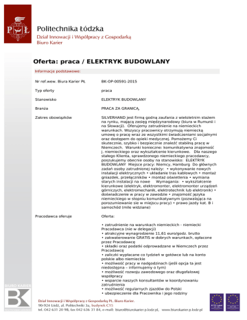 Oferta: praca / ELEKTRYK BUDOWLANY Informacje podstawowe: Nr ref.wew. Biura Karier PŁ BK-OP-00591-2015 Typ oferty praca Stanowisko ELEKTRYK BUDOWLANY Branża PRACA ZA GRANICĄ, Zakres obowiązków SILVERHAND jest firmą godną zaufania z wieloletnim stażem na rynku, mającą zasięg międzynarodowy (biura w Rumunii i na Słowacji). Oferujemy zatrudnienie na niemieckich warunkach. Wszyscy pracownicy otrzymują niemiecką umowę o pracę wraz ze wszystkimi świadczeniami socjalnymi oraz dostępem do opieki medycznej. Pomożemy Ci skutecznie, szybko i bezpiecznie znaleźć stabilną pracę w Niemczech. Warunki konieczne: komunikatywna znajomość j. niemieckiego oraz wykształcenie kierunkowe. Dla naszego stałego Klienta, sprawdzonego niemieckiego pracodawcy, poszukujemy obecnie osoby na stanowisko: ELEKTRYK BUDOWLANY Miejsce pracy: Niemcy, Hamburg Do głównych zadań osoby zatrudnionej należy: • wykonywanie nowych instalacji elektrycznych • układanie tras kablowych • montaż gniazdek, przełączników • montaż oświetlenia • wymiana starych instalacji na nowe Wymagania: • wykształcenie kierunkowe (elektryk, elektromonter, elektromonter urządzeń górniczych, elektromechanik, elektrotechnik lub elektronik) • doświadczenie w pracy w zawodzie • znajomość języka niemieckiego w stopniu komunikatywnym (pozwalająca na porozumiewanie sie w miejscu pracy) • prawo jazdy kat. B i samochód (mile widziane) Pracodawca oferuje Oferta: • zatrudnienie na warunkach niemieckich - niemiecki Pracodawca (nie w delegacji) • atrakcyjne wynagrodzenie 11,61 euro/godz. brutto • zakwaterowanie GRATIS w dobrych warunkach, opłacone przez Pracodawcę • składki oraz podatki odprowadzane w Niemczech przez Pracodawcę • zaliczki wypłacane co tydzień w gotówce lub na konto polskie albo niemieckie • możliwość pracy w nadgodzinach (jeśli opcja ta jest niedostępna – informujemy o tym) • możliwość rozwoju zawodowego oraz długofalowej współpracy • wsparcie naszych konsultantów w koordynowaniu zatrudnienia • możliwość regularnych zjazdów do Polski • ubezpieczenie dla Pracownika i jego rodziny • respektowane prawo do urlopu • nasze usługi są bezpłatne (m. in. tłumaczenie oraz profesjonalne przygotowanie CV w j. niemieckim na potrzeby rekrutacji) Miejsce pracy: Kraj NIEMCY, Miejscowość Hamburg Wymaganie odnośnie kandydata: Wymagana znajomość języków język - Niemiecki Preferowana forma studiów - I (studia inżynierskie stacjonarne dzienne), Preferowane wydziały - WYDZIAŁ ELEKTROTECHNIKI, ELEKTRONIKI, INFORMATYKI I AUTOMATYKI, Preferowane kierunki - AUTOMATYKA I ROBOTYKA, znajomość Dobra Dane kontaktowe: Nazwa firmy/Pracodawcy Kraj SIlverhand NIEMCY Sposób aplikacji: Usługa dodatkowa: Od 20 lat świadczymy również usługi w zakresie rozliczeń podatków niemieckich oraz holenderskich, a także Kindergeld. Zadzwoń i dowiedz się więcej! Osoby zainteresowane prosimy o przesłanie aplikacji na podany adres mailowy: [email protected] w temacie wpisując nazwę stanowiska oraz numer referencyjny: BK/09M/001 Prosimy o dołączenie klauzuli: Wyrażam zgodę na przetwarzanie moich danych osobowych zawartych w ofercie pracy dla potrzeb procesu rekrutacji zgodnie z ustawą z dnia 29.08.1997 r. o Ochronie Danych Osobowych, tekst jednolity: Dz. U. z 2002 r., Nr 101, poz. 926 z późn. zm. Kontaktujemy się telefonicznie wyłącznie z wybranymi kandydatami. Jesteśmy do Państwa dyspozycji pod poniższymi numerami telefonów: 734-496-021 | 606-857-662 | 600-486-115 | 600-483-657 | 606-857-993 AKTUALNE OFERTY PRACY dostępne na naszej stronie internetowej: silverhand.eu Facebook: facebook.com/praca.silverhand SILVERHAND Dominik Matczak - bezpieczne i satysfakcjonujące zatrudnienie za granicą (KRAZ 7822). Data umieszczenia: Oferta ważna od 09-03-2015 do 09-04-2017 Politechnika Łódzka, jest wpisana pod numerem 2414 do rejestru podmiotów prowadzących agencje zatrudnienia.