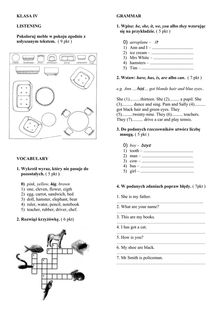 KLASA IV GRAMMAR LISTENING 1. Wpisz: he, she, it, we, you albo they wzorując się na przykładzie. ( 5 pkt ) Pokoloruj meble w pokoju zgodnie z usłyszanym tekstem. ( 9 pkt ) 0) 1) 2) 3) 4) 5) aeroplane – it Ann and I – ..................................... ice cream – ...................................... Mrs White – .................................... hamsters – ....................................... Tim – ............................................... 2. Wstaw: have, has, is, are albo can. ( 7 pkt ) e.g. Ann ....has.... got blonde hair and blue eyes.. She (1)..........thirteen. She (2)......... a pupil. She (3).......... dance and sing. Pam and Sally (4).......... got black hair and green eyes. They (5)..........twenty-nine. They (6).......... teachers. They (7).......... drive a car and play tennis. 3. Do podanych rzeczowników utwórz liczbę mnogą. ( 5 pkt ) VOCABULARY 1. Wykreśl wyraz, który nie pasuje do pozostałych. ( 5 pkt ) 0) 1) 2) 3) 4) 5) pink, yellow, big, brown one, eleven, flower, eigth egg, carrot, sandwich, bed doll, hamster, elephant, bear ruler, water, pencil, notebook teacher, rubber, driver, chef. 2. Rozwiąż krzyżówkę. ( 6 pkt) 0) 1) 2) 3) 4) 5) boy - boys tooth – ............................................. man – .............................................. cow – ............................................... bus – ................................................ girl – ................................................ 4. W podanych zdaniach popraw błędy. ( 7pkt ) 1. She is my father. ………………………………………………….. 2. What are your name? …………………………………………………… 3. This are my books. …………………………………………………… 4. I has got a cat. …………………………………………………… 5. How is you? …………………………………………………… 6. My shoe are black. …………………………………………………… 7. Mr Smith is policeman. …………………………………………………… COMMUNICATION WRITING Połącz pytania z odpowiedziami. ( 7 pkt ) Pokoloruj i opisz psa. Użyj następujących wyrazów: eyes, ears, tail, body, head, teeth, big / small. Podaj jak ma na imię, ile ma lat i jakiego jest koloru. Tekst musi liczyć od 40 do 60 słów. ( 21 pkt ) 0 How old are you? – H 1 What’s your name? 2 How do you spell that? 3 Who’s this? 4 How are you? 5 What’s your last name? 6 What’s your favourite colour? 7 What’s this? A B C D E F G H ................................................................................ ................................................................................ ................................................................................ M-A-R-Y I’m fine, thanks. Smith. Red. This is my dad. Mary. It’s a snake. Twelve. ................................................................................ ................................................................................ ................................................................................ ................................................................................ ................................................................................ ................................................................................ READING ................................................................................ Przeczytaj uważnie tekst o tym jak Sam spędza piątek i sobotę, a następnie zaznacz poprawną odpowiedź. ( 6 pkt ) ................................................................................ On Saturday I always get up early. For breakfast I have bacon sandwiches! Delicious! After breakfast I play with Jenny. Sometimes we go to the park with Dooby. After lunch I meet my friends. We play football or table tennis or they listen to CDs. Sometimes we visit my grandparents. In the evening I watch TV or a video. I don’t work on Saturday. I love Saturday. It’s my favourite day of the week! On Friday I don’t watch TV. On Friday I do my homework. I clean my room and I wash up. I don’t like Friday! ................................................................................ YES NO 1. Sam gets up early. 2. Sam plays with Jenny. He meets his friends after 3. breakfast. He watches a video in the 4. evening. 5. He cleans his room on Saturday. 6. He loves Saturday. ................................................................................ ................................................................................ ................................................................................ ................................................................................ ................................................................................ ................................................................................ ................................................................................ ................................................................................ ................................................................................ ................................................................................ ................................................................................ ................................................................................ ................................................................................ ................................................................................ ................................................................................ ................................................................................ ................................................................................ ................................................................................