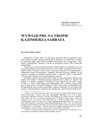 ARCHIWUM EMIGRACJI Studia – Szkice – Dokumenty Toruń, Rok 2011, Zeszyt 1–2 (14–15) ___________________________________________________________ WYWIAD PRL NA TROPIE KAZIMIERZA SABBATA Krzysztof TARKA (Opole) Wieczorem, 19 lipca 1989 r. po dniu pracy, prezydent RP na uchodźstwie Kazimierz Sabbat wyszedł z siedziby emigracyjnych władz przy 43 Eaton Place w Londynie. Idąc ulicą nagle zasłabł. Śmierć nastąpiła natychmiast. Tego samego dnia w Warszawie, Zgromadzenie Narodowe wybrało na prezydenta (jeszcze PRL) Wojciecha Jaruzelskiego1. Ponad ćwierć wieku wcześniej Kazimierz Sabbat znalazł się na długiej liście emigracyjnych polityków, którymi interesował się wywiad PRL. W połowie marca 1963 r. major Czesław Kozubski, starszy oficer operacyjny Wydziału VIII Departamentu I Ministerstwa Spraw Wewnętrznych, rozpatrzył materiały dotyczące Sabbata. Na tej podstawie przygotował formalne postanowienie o założeniu sprawy ewidencyjno-obserwacyjnej. Rozpracowaniu nadał kryptonim „Kanon”2. Informacje zebrane przez peerelowskie służby na temat Kazimierza Sabbata były jednak „dość skąpe”. Z dotychczasowego rozpracowania wynikało, iż „Kanon” był jednym z czołowych polityków Niezależnej Grupy Społecznej (do NGS wstąpił w 1949 r., w 1960 r. objął funkcję przewodniczącego partii i pełnił ją nieprzerwanie przez kolejne 26 lat). Po rozłamie emigracji w 1954 r. na tle sporu o prezydenturę Sabbat opowiedział się po stronie przeciwników Augusta Zaleskiego. W tym samym roku wszedł w skład Egzekutywy Zjednoczenia Narodowego, gdzie kierował działem skar1 Szerzej: J. K. Danel, Kazimierz Sabbat. Rys biograficzny, Mielec 2000; tenże, Kazimierz Sabbat (1913–1989) — polityk i mąż stanu, Niepodległość 2000/2001 t. 51, s. 7–28; J. Jędrychowska [K. Kijowska], Rozmowa z Kazimierzem Sabbatem, [w:] Widzieć Polskę z oddalenia, Paryż 1988, s. 98–121; S. S. Nicieja, Prezydenci RP 1972–1990, [w:] Kierownictwo obozu niepodległościowego na obczyźnie 1945–1990, pod red. A. Szkuty, Londyn 1996, s. 137–145; A. Romanowski, Kazimierz Sabbat (1913–1989), Tygodnik Powszechny 1989 nr 32, s. 2; R. Terlecki, Sabbat Kazimierz Aleksander, Polski Słownik Biograficzny 1992 t. 34, s. 239–240; M. B. Topolska, Sabbat Kazimierz Aleksander, [w:] Encyklopedia polskiej emigracji i Polonii, pod red. K. Dopierały, t. 4, Toruń 2005, s. 325–326. Zob. też: K. Sabbat, Polska na drodze do wolności i niepodległości. Pisma polityczne, wybór i oprac. W. K. Roman, Toruń 2009. 2 Archiwum Instytutu Pamięci Narodowej, 01227/576, Postanowienie z 14 III 1963 r. O założeniu sprawy ewidencyjno-obserwacyjnej kryptonim „Kanon”. 289 bu, potem również działem spraw emigracji. Działał także we władzach Stowarzyszenia Polskich Kombatantów oraz Naczelnej Radzie Harcerskiej. Wywiad nie miał natomiast żadnych informacji na temat jego przedwojennej działalności oraz rodziny w kraju: „Od strony kraju «Kanon» nie został jeszcze rozpoznany” — przyznał major Kozubski. Na podstawie perlustracji korespondencji ustalono natomiast, że kontakt listowny z Sabbatami utrzymywali Janina i Henryk Jaślan z Warszawy. Jaślan była lektorką języków obcych w Szkole Głównej Służby Zagranicznej. Jej mąż pracował w Sądzie Wojewódzkim3. 15 stycznia 1964 r. major Kozubski umówił się telefonicznie na rozmowę z Janiną Jaślan. Spotkali się następnego dnia w jej mieszkaniu. Oficer wywiadu nie chciał przez telefon mówić o celu nieoczekiwanej wizyty. Dopiero na miejscu oświadczył, że przyszedł w sprawie rodziny Sabbatów z Londynu. Spytał Jaślan, co mogłaby mu powiedzieć o Kazimierzu Sabbacie. Ta była tym lekko zaskoczona. Stwierdziła, że Sabbata i jego żonę poznała w 1957 r. za pośrednictwem swojego męża, gdy z ramienia MSZ przebywała w Londynie na trzymiesięcznym kursie praktycznym z języka angielskiego. Później była jeszcze na kursach językowych w Londynie w 1958 i w 1961 r. W tym czasie przebywała u Sabbatów. W 1958 r. wraz z nią pojechał również jej mąż. Henryk Jaślan i Kazimierz Sabbat znali się jeszcze sprzed wojny, gdy studiowali prawo na Uniwersytecie Warszawskim (magisterium Sabbat uzyskał w roku 1939). Jaślan stwierdziła, że Sabbat był nieco starszy od jej męża i urodził się w 1915 r. (ta błędna data urodzin Sabbata pojawia się w kolejnych dokumentach wywiadu, w rzeczywistości urodził się on 27 lutego 1913 r.). Pochodził ze wsi, Jaślan nie wiedziała jednak, z jakiej miejscowości. Według opinii jej męża miał wrodzone zdolności organizacyjne. Już przed wojną zaangażował się w działalność w harcerstwie (w końcu 1938 r. Sabbat był współorganizatorem i kierownikiem Zrzeszenia Akademickich Kręgów Starszoharcerskich „Kuźnica”). Jaślan nie znała również dokładnie wojennych losów Sabbata. Powiedziała, że służył w 2. Korpusie Polskim, dowodzonym przez generała Władysława Andersa. W rzeczywistości w przededniu II wojny światowej Sabbat został zmobilizowany do ośrodka zapasowego w Kopyczyńcach na granicy polsko-sowieckiej. Po 17 września 1939 r. przedostał się na Węgry, gdzie był komendantem obozu polskich harcerzy-uchodźców. Na przełomie 1939/1940 r. poprzez Jugosławię i Włochy dotarł do tworzącego się we Francji wojska polskiego. Otrzymał przydział do marynarki wojennej, a następnie do 10. Brygady Kawalerii Pancernej, dowodzonej przez generała Stanisława Maczka. Wziął udział w kampanii 1940 r. Po klęsce Francji został wraz z polskimi oddziałami ewakuowany do Wielkiej Brytanii. W 1943 r. przeniesiono go do Sztabu Głównego Polskich Sił Zbrojnych, na stanowisko referenta do spraw młodzieży. W 1949 r. Sabbat ożenił się z Anną Sulikówną (córką generała Nikodema Sulika, komendanta Okręgu Wileńskiego Służby Zwycięstwu Polski/Związku Walki Zbrojnej w Wilnie, a następnie dowódcy 5. Kresowej Dywizji Pi