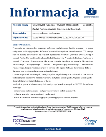 Miejsce pracy Uniwersytet Gdański, Wydział Oceanografii i Geografii, Zakład Funkcjonowania Ekosystemów Morskich Stanowisko starszy referent techniczny Wymiar etatu 100% (okres zatrudnienia: 01.10.2016-30.04.2017) OPIS STANOWISKA Pracownik na stanowisku starszego referenta technicznego będzie włączony w prace związane z realizacją projektu „Effects of potential leakage from the sub-seabed CO2 storage site on marine environment at relevant hydrostatic pressure” (akronim CO2MARINE) w ramach Polsko-Norweskiego Funduszu Badań Naukowych, Priorytet 6: Badania Naukowe w ramach Programu Operacyjnego dla wykorzystania środków w ramach Mechanizmu Finansowego Europejskiego Obszaru Gospodarczego/Norweskiego Mechanizmu Finansowego. Projekt realizowany jest w okresie od 1 lipca 2014 r. do 30 kwietnia 2017 r. Ramowy zakres obowiązków pracownika obejmuje: - udział w pracach terenowych, analitycznych i innych bieżących zadaniach o charakterze technicznym i naukowym realizowanych w Instytucie Oceanografii, Wydział Oceanografii i Geografii Uniwersytetu Gdańskiego w Gdyni - udział w pracach laboratoryjnych i analitycznych realizowanych w SINTEF, Trondheim, Norwegia - opracowanie matematyczne i statystyczne wyników badań naukowych - redakcja manuskryptów publikacji naukowych - udział w zadaniach administracyjnych i promocyjnych w ramach projektu. Project „Impact of potential leakage from the sub-seabed CO2 storage site on marine environment at relevant hydrostatic pressure” - acronym CO2MARINE Agreement no. Pol-Nor/236877/102/2014 WYMAGANIA: - wykształcenie licencjackie z oceanografii, biologii, biotechnologii lub dziedziny pokrewnej - doświadczenie w pracy laboratoryjnej związanej z badaniem wpływu czynników stresujących na organizmy bezkręgowe (diagnostyka histologiczna, analizy biochemiczne, pomiary aktywności enzymatycznej) - doświadczenie w pracy terenowej w strefie brzegowej i na morzu - dobra znajomość języka angielskiego w mowie i piśmie. WYMAGANE DOKUMENTY: - Curriculum vitae (z uwzględnieniem przebiegu dotychczasowego zatrudnienia i dorobku naukowego), - kserokopia dokumentów potwierdzających wykształcenie, - kserokopia zaświadczeń o ukończonych kursach i szkoleniach, - kserokopia innych dokumentów potwierdzających posiadane kwalifikacje. Aplikacje w formie wydruku albo kopii-pdf można składać w p. 461 w Instytucie Oceanografii Uniwersytetu Gdańskiego (Al. Piłsudskiego 46, 81-378 Gdynia) albo przesyłać na adres mailowy [email protected] w terminie do dnia 24.08.2016 Project „Impact of potential leakage from the sub-seabed CO2 storage site on marine environment at relevant hydrostatic pressure” - acronym CO2MARINE Agreement no. Pol-Nor/236877/102/2014