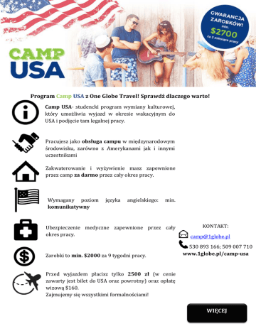 Program Camp USA z One Globe Travel! Sprawdź dlaczego warto! Camp USA- studencki program wymiany kulturowej, który umożliwia wyjazd w okresie wakacyjnym do USA i podjęcie tam legalnej pracy. Pracujesz jako obsługa campu w międzynarodowym środowisku, zarówno z Amerykanami jak i innymi uczestnikami Zakwaterowanie i wyżywienie masz zapewnione przez camp za darmo przez cały okres pracy. Wymagany poziom komunikatywny języka angielskiego: min. Ubezpieczenie medyczne zapewnione przez cały okres pracy. Zarobki to min. $2000 za 9 tygodni pracy. KONTAKT: [email protected] 530 893 166; 509 007 710 www.1globe.pl/camp-usa Przed wyjazdem płacisz tylko 2500 zł (w cenie zawarty jest bilet do USA oraz powrotny) oraz opłatę wizową $160. Zajmujemy się wszystkimi formalnościami! WIĘCEJ