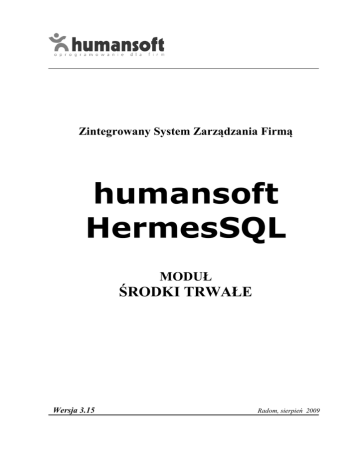 Zintegrowany System Zarządzania Firmą humansoft HermesSQL MODUŁ ŚRODKI TRWAŁE Wersja 3.15 Radom, sierpień 2009 Powielanie w jakiejkolwiek formie, całości lub fragmentów podręcznika, bez pisemnej zgody Humansoft Sp. z o.o. jest zabronione. Copyright© 1991-2009 Humansoft Sp. z .o.o. Wszelkie prawa zastrzeżone. Microsoft, Windows, Visual FoxPro, SQL Server 2009, są zastrzeżonymi znakami towarowymi firmy Microsoft Corporation. Opracowanie: Humansoft Sp z o.o. Radom VIII, 2009 Humansoft Sp. z o. o. 26-600 Radom, ul. Wernera 29/31 tel/fax (048) 360-89-09, 360-89-58 http://www.humansoft.pl e-mail: [email protected] 2 SPIS TREŚCI 1. WDROŻENIE MODUŁU ŚRODKI TRWAŁE .............................. 6 2. EWIDENCJA ŚRODKÓW TRWAŁYCH....................................... 7 2.1. 2.2. 2.3. ŚRODEK TRWAŁY - FORMULARZ ............................................................ 8 OPERACJE DLA TABELI ŚRODKI TRWAŁE ............................................. 16 FILTRY DLA TABELI ŚRODKI TRWAŁE .................................................. 17 3. KLASYFIKACJA ŚRODKÓW TRWAŁYCH ............................. 20 4. PRZYJĘCIE – DOWODY OT ........................................................ 22 5. LIKWIDACJA/SPRZEDAŻ - DOWODY LT ............................... 23 6. ZMIANA MIEJSCA UŻYTKOWANIA - DOWODY MT ........... 25 7. ZMIANA WARTOŚCI - DOWODY WT....................................... 27 8. ZMIANA DANYCH INFORMACYJNYCH -DOWODY AT ..... 29 9. AKTUALIZACJA (PRZESZACOWANIE) .................................. 30 9.1. 9.2. 10. TABELA AKTUALIZACJI ....................................................................... 32 DOWODY PT ....................................................................................... 32 NALICZANIE MIESIĘCZNE AMORTYZACJI ......................... 34 10.1. WYCOFANIE AMORTYZACJI ................................................................. 35 11. PLAN ROCZNY AMORTYZACJI ................................................ 36 12. OKRESY ŚT ..................................................................................... 38 13. DEFINICJA KSIĘGOWAŃ AMORTYZACJI ............................. 40 3 Podręcznik zawiera opis modułu Środki Trwałe, będącego jedną z części Zintegrowanego Systemu Zarządzania humansoft HermesSQL. Moduł ten jest dość autonomiczny w stosunku do całości systemu, jednak potrafi ściśle współpracować z pozostałymi opcjami programu. Np. możliwe jest automatyczne księgowanie naliczonych amortyzacji w module Księga Handlowa lub Księga Przychodów i Rozchodów. Sposób obsługi opcji modułu Środki Trwałe jest identyczny jak w całym programie i został opisany w rozdziale Komunikacja z programem. patrz Podręcznik Opis systemu - rozdział Komunikacja z programem Mechanizmy modułu Środki Trwałe są bardzo czytelne i proste w obsłudze. Wprowadzenie środków do ewidencji nie wymaga długotrwałego wdrożenia i może być przeprowadzone przez osobę zajmująca się na co dzień naliczaniem amortyzacji. Program uwzględnia wymogi aktualnych przepisów prawa. Pozwala ewidencjonować wartości bilansowe i podatkowe. Ewidencja bilansowa ujmowana będzie w księgach rachunkowych a podatkowa generuje informacje dotyczące podatku dochodowego. Podstawowe funkcje modułu Środki Trwałe: 1. Prowadzenie ewidencji: - środków trwałych - wartości niematerialnych i prawnych - inwestycji w obcych środkach trwałych - wyposażenia 2. Wprowadzanie i edycja dokumentów transakcyjnych OT przyjęcie środka trwałego LT likwidacja/sprzedaż środka trwałego WT zwiększenie/zmniejszenie wartości środka trwałego MT zmiana miejsca użytkowania środka trwałego AT zmiany w kartotece środka trwałego (stawka amortyzacji, nazwa, grupa GUS itp.) PT dokument przeszacowania/aktualizacji środka trwałego 3. Niezależna amortyzacja bilansowa i podatkowa 4. Naliczanie amortyzacji i umorzenia w trybie miesięcznym z uwzględnieniem wprowadzonych wcześniej dowodów transakcyjnych 5. Możliwość stosowania różnych metod amortyzacji - liniowa - degresywna - jednorazowa 6. Możliwość rozpoczęcia pracy z programem w dowolnym momencie roku 7. Wyznaczanie planu amortyzacji na aktualny rok obrachunkowy. 4 Wprowadzanie dokumentów comiesięcznej amortyzacji i umorzenia do Księgi Handlowej. 9. Przeszacowanie majątku trwałego zarówno według tabeli współczynników dla grup jak i indywidualnie dla każdego środka trwałego. 10. Bogaty zestaw wydruków analitycznych i syntetycznych. 8. 5 1. Wdrożenie modułu Środki Trwałe Aby rozpocząć prace z modułem Środki Trwałe należy wykonać czynności opisane poniżej. Konfiguracja 1. Definicja księgowań amortyzacji Dla Użytkowników modułu Księga Handlowa. Należy zdefiniować tu konta WN i MA, na które comiesięcznie księgowana będzie amortyzacja i umorzenia środków trwałych. Operacja ta pozwoli później na automatycznie tworzenie dokumentu Polecenie księgowania (PK). 2. Okresy Należy wprowadzić rok sprawozdawczy (podać miesiąc i rok), a następnie jeżeli w ewidencji znajdują się środki trwałe użytkowane sezonowo należy wskazać miesiące roku obrachunkowego, w którym będzie dla nich obliczana amortyzacja. Program pozwala ewidencjonować wartości bilansowe i podatkowe, co ułatwia rozlicznie kosztów wynikających z odpisów amortyzacyjnych i ujmowaniu ich na deklaracji podatkowej. Jeżeli jednak chcemy prowadzić tylko ewidencję bilansową, wówczas musimy wypełnić znacznik obliczeń podatkowych, który wyłączy wszystkie operacje związane z naliczaniem wartości podatkowych. Wprowadzenie środków do ewidencji Po wykonaniu podstawowych czynności konfiguracyjnych można rozpocząć wprowadzanie do ewidencji środków trwałych - opcja Ewidencja środków trwałych. Operacje te zostały opisane w następnym rozdziale. 6 2. Ewidencja środków trwałych Kartoteka środków trwałych to podstawowa kartoteka programu. Powinny się w niej 