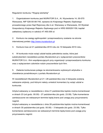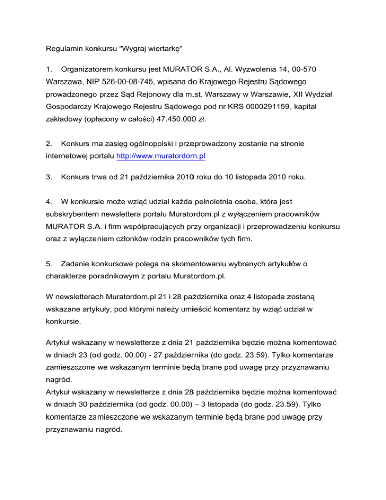 Regulamin konkursu "Wygraj wiertarkę" 1. Organizatorem konkursu jest MURATOR S.A., Al. Wyzwolenia 14, 00-570 Warszawa, NIP 526-00-08-745, wpisana do Krajowego Rejestru Sądowego prowadzonego przez Sąd Rejonowy dla m.st. Warszawy w Warszawie, XII Wydział Gospodarczy Krajowego Rejestru Sądowego pod nr KRS 0000291159, kapitał zakładowy (opłacony w całości) 47.450.000 zł. 2. Konkurs ma zasięg ogólnopolski i przeprowadzony zostanie na stronie internetowej portalu http://www.muratordom.pl 3. Konkurs trwa od 21 października 2010 roku do 10 listopada 2010 roku. 4. W konkursie może wziąć udział każda pełnoletnia osoba, która jest subskrybentem newslettera portalu Muratordom.pl z wyłączeniem pracowników MURATOR S.A. i firm współpracujących przy organizacji i przeprowadzeniu konkursu oraz z wyłączeniem członków rodzin pracowników tych firm. 5. Zadanie konkursowe polega na skomentowaniu wybranych artykułów o charakterze poradnikowym z portalu Muratordom.pl. W newsletterach Muratordom.pl 21 i 28 października oraz 4 listopada zostaną wskazane artykuły, pod którymi należy umieścić komentarz by wziąć udział w konkursie. Artykuł wskazany w newsletterze z dnia 21 października będzie można komentować w dniach 23 (od godz. 00.00) - 27 października (do godz. 23.59). Tylko komentarze zamieszczone we wskazanym terminie będą brane pod uwagę przy przyznawaniu nagród. Artykuł wskazany w newsletterze z dnia 28 października będzie można komentować w dniach 30 października (od godz. 00.00) – 3 listopada (do godz. 23.59). Tylko komentarze zamieszczone we wskazanym terminie będą brane pod uwagę przy przyznawaniu nagród. Artykuł wskazany w newsletterze z dnia 4 listopada będzie można komentować w dniach 6 (od godz. 00.00) – 10 listopada (do godz. 23.59). Tylko komentarze zamieszczone we wskazanym terminie będą brane pod uwagę przy przyznawaniu nagród. 6. Newslettery konkursowe zostaną rozesłane w dniach 21, 28 października oraz 4 listopada. Nagrodzone osoby zostaną opublikowane w newsletterach rozsyłanych w dniach:4 listopada (dotyczy artykułów z newslettera z dnia 21 października) oraz 18 listopada (dotyczy artykułów z newsletterów z dni 28 października i 4 listopada) 7. Zgłoszenia przyjmowane są poprzez formularz komentarza zamieszczony pod wskazanym artykułem. Prawidłowe powinno zawierać: a) Treść komentarza b) Adres e-mailowy osoby biorącej udział w konkursie 8. Zgłoszone prace oceniać będzie jury. Jury będzie oceniało komentarze w szczególności pod kątem fachowości, poprawności językowej, pomysłowości wypowiedzi. 9. Nagrody dla Laureatów: w każdym newsletterze jury przyzna jedną nagrodę główną, w postaci wiertarki Ryobi GripZone 500W o wartości 200 zł/szt. 10. Jedna osoba może otrzymać tylko jedną nagrodę. 11. Ogłoszenie listy nagrodzonych nastąpi na stronie internetowej portalu http://www.muratordom.pl 12. Nadesłanie odpowiedzi na pytanie konkursowe jest równoznaczne z akceptacją niniejszego Regulaminu. 13. Nadesłanie prac jest równoznaczne z wyrażeniem zgody Uczestnika na przetwarzanie w celach konkursowych, promocyjnych i marketingowych przez MURATOR S.A, danych osobowych Uczestnika, które Uczestnik przekazuje dobrowolnie, zastrzegając sobie prawo ich sprawdzenia i poprawienia lub usunięcia oraz zgodę na opublikowanie na stronach portalu Muratordom.pl danych w przypadku otrzymania nagrody. 14. Organizator prześle nagrody drogą pocztową w terminie 30 dni od daty ogłoszenia rozwiązania i listy nagrodzonych. Jeśli nagroda, przesłana zgodnie z niniejszym punktem, nie zostanie odebrana, organizator będzie uprawniony do uznania, że zwycięzca rezygnuje z nagrody. 15. Nagrodzone osoby nie są uprawnione do żądania ekwiwalentu nagrody lub zamiany na nagrodę rzeczową. 16. Organizator zastrzega sobie prawo do dokonania modyfikacji postanowień regulaminu z ważnych powodów w każdym czasie, a także do zawieszenia, przerwania, przedłużenia lub odwołania konkursu z ważnych przyczyn. 17. Aktualna wersja regulaminu będzie dostępna w lokalu Organizatora przy ul. Dęblińskiej 6 w Warszawie oraz na stronie internetowej http://www.muratordom.pl i obowiązuje od momentu jej zamieszczenia.. 18. Ewentualne reklamacje związane z konkursem mogą być kierowane do Organizatora wyłącznie w formie pisemnej, na adres Organizatora w terminie 7 dni od daty ogłoszenia rozwiązania i listy nagrodzonych. W przypadku przesłania reklamacji za pośrednictwem poczty decyduje data stempla pocztowego. 19. Reklamacja powinna zawierać imię, nazwisko, dokładny adres i numer telefonu, jak również dokładny opis i powód reklamacji. 20. Złożone przez Uczestników reklamacje będą rozpatrywane przez Komisję Sprawdzającą, powołaną przez Organizatora konkursu, nie później niż w terminie 21 dni od daty otrzymania reklamacji. 21. Zainteresowani Uczestnicy, zostaną powiadomieni o rozpatrzeniu reklamacji listem poleconym najpóźniej w ciągu 21 dni od daty rozpatrzenia reklamacji przez Komisję Sprawdzającą. 22. Decyzja Komisji Sprawdzającej co do zgłoszonej reklamacji jest ostateczna. 23. Niniejszy konkurs nie jest grą losową w rozumieniu ustawy z dnia 29 lipca 1992 roku o grach losowych i zakładach wzajemnych. 24. W razie sporów, które mogą powstać na tle stosowania niniejszego regulaminu, a nie mogą zostać rozwiązane polubownie, sądem właściwym będzie sąd powszechny W imieniu Organizatora Bartek Pataląg Warszawa, 21 października 2010 r.