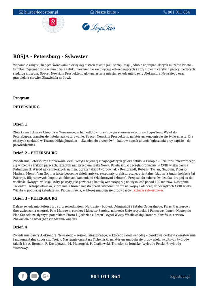 [email protected] Nasze biura 801 011 864 ROSJA - Petersburg - Sylwester Wspaniałe zabytki, będące świadkami niezwykłej historii miasta jak i samej Rosji. Jedno z najwspanialszych muzeów świata Ermitaż. Zgromadzone w nim dzieła sztuki, niezmiennie zachwycają odwiedzających każdy z pięciu carskich pałacy, będących siedzibą muzeum. Spacer Newskim Prospektem, główną arterią miasta, zwiedzanie Ławry Aleksandra Newskiego oraz przepiękna cerwiek Zbawiciela na Krwi. Program: PETERSBURG Dzień 1 Zbiórka na Lotnisku Chopina w Warszawie, w hali odlotów, przy nowym stanowisku odpraw LogosTour. Wylot do Petersburga, transfer do hotelu, zakwaterowanie. Spacer Newskim Prospektem, na którym koncentruje się życie miasta. Dla chętnych spektakl w Teatrze Mikhajlowskim – „Dziadek do orzechów” – balet w dwóch aktach (zgłoszenia przy zapisie – do potwierdzenia). Dzień 2 - PETERSBURG Zwiedzanie Petersburga z przewodnikiem. Wizyta w jednej z najbogatszych galerii sztuki w Europie – Ermitażu, mieszczącego się w pięciu carskich pałacach, leżących nad brzegiem rzeki Newy. Dzieła sztuki zaczęła gromadzić w XVIII wieku caryca Katarzyna II. Wśród najcenniejszych są m.in. obrazy takich twórców jak – Rembrandt, Rubens, Tycjan, Gauguin, Picasso, Matisse, Monet, Van Gogh, a także bezcenne dzieła antyku, eksponaty prehistoryczne, orientalne, biżuteria (m.in. kolekcja Jaj Faberge, filigranowych, bogato zdobionych kamieniami szlachetnymi i złotem). Przejazd do soboru św. Izaaka, drugiej co do wielkości świątyni w Rosji, który pokryty jest pozłacaną kopułą wznoszącą się na wysokość ponad 100 metrów. Następnie Twierdza Pietropawłowska, która miała bronić miasto przed Szwedami w czasie Wojny Północnej w początkach XVIII wieku. Wizyta w pobliskiej katedrze św. Piotra i Pawła, w której znajdują się groby carów. Kolacja sylwestrowa. Dzień 3 - PETERSBURG Dalsze zwiedzanie Petersburga z przewodnikiem. Na trasie – budynki Admiralicji i Sztabu Generalnego, Pałac Marmurowy (bez zwiedzania wnętrz), Pole Marsowe, cerkiew i klasztor Smolny, nabrzeże Uniwersyteckie i Pałacowe. Lunch. Następnie Plac Senacki ze słynnym pomnikiem Piotra I „Jeździec z Brązu”, cypel Wyspy Wasilewskiej, katedra Kazańska, cerkiew Zbawiciela na Krwi (bez zwiedzania wnętrz). Dzień 4 Zwiedzanie Ławry Aleksandra Newskiego – zespołu klasztornego, w którego skład wchodzą – barokowa cerkiew Zwiastowania i monumentalny sobór św. Trójcy. Następnie cmentarz Tichwiński, na którym znajdują się groby wielu wybitnych twórców, takich jak A. Borodin, F. Dostojewski, M. Musorgski, P. Czajkowski. Transfer na lotnisko. Wylot do Polski. Przylot do Warszawy. 801 011 864 logostour.pl [email protected] Nasze biura 801 011 864 Cena obejmuje: I RATA 1000 PLN – płatna przy zapisie II RATA płatna na 35 dni przed wyjazdem przelot samolotem transfery lotnisko – hotel – lotnisko przejazdy autokarem 3 noclegi w hotelu 3* w Petersburgu w pokojach 2-osobowych z łazienkami, dopłata do pok. 1 osob. 250 zł 3 śniadania, 1 lunch, 2 obiadokolacje (serwowane) usługi przewodnika opiekę pilota zestaw słuchawkowy Tour Guide ubezpieczenie Signal-Iduna (KL, NNW, bagaż) Dodatkowe informacje: WIZA Przy wpłacie II raty należy złożyć dokumentację wizową: 1 aktualne zdjęcie (kolorowe), 1 formularz i paszport ważny co najmniej 6 miesięcy od daty wyjazdu z dwoma wolnymi stronami. Cena wizy rosyjskiej – 300 zł – obowiązkowo płatna przy wykupie wycieczki. KOLACJA SYLWESTROWA Kolacja sylwestrowa – cena 650 PLN ( płatne na 35 dni przed wyjazdem). BILETY WSTĘPU Na bilety wstępu do zwiedzanych obiektów należy przeznaczyć ok. 30 EUR, bilet do teatru – cena od ok. 50 EUR. KOLEJNOŚĆ ZWIEDZANIA Program ma charakter ramowy, kolejność zwiedzania może ulec zmianie. Terminy: 801 011 864 logostour.pl