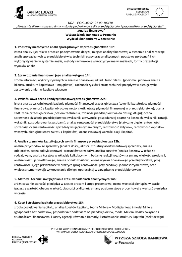 UDA - POKL.02.01.01-00-192/10 „Finansista filarem sukcesu firmy – studia podyplomowe dla przedsiębiorców i pracowników przedsiębiorstw” „Analiza finansowa” Wyższa Szkoła Bankowa w Poznaniu Wydział Ekonomiczny w Szczecinie 1. Podstawy metodyczne analiz sporządzanych w przedsiębiorstwie 10h: istota analizy i jej rola w procesie podejmowania decyzji; miejsce analizy finansowej w systemie analiz; rodzaje analiz sporządzanych w przedsiębiorstwie; techniki i etapy prac analitycznych; podstawy porównao i ich wykorzystywanie w systemie analiz; metody rachunkowe wykorzystywane w analizach; formy prezentacji wyników analiz 2. Sprawozdanie finansowe i jego analiza wstępna 14h: źródła informacji wykorzystywanych w analizie finansowej; układ i treśd bilansu (pozioma i pionowa analiza bilansu, struktura kapitałowo – majątkowa); rachunek zysków i strat; rachunek przepływów pieniężnych; zestawienie zmian w kapitale własnym 3. Wskaźnikowa ocena kondycji finansowej przedsiębiorstwa 22h: istota analizy wskaźnikowej; badanie płynności finansowej przedsiębiorstwa (czynniki kształtujące płynności finansową, płynnośd a kapitał obrotowy netto, skutki utraty płynności finansowej w przedsiębiorstwie); ocena zadłużenia przedsiębiorstwa (poziom zadłużenia, zdolnośd przedsiębiorstwa do obsługi długu); ocena sprawności działania przedsiębiorstwa (wskaźniki aktywności gospodarczej oparte na kosztach, wskaźniki rotacji, wskaźniki gospodarowania zasobami), analiza rentowności przedsiębiorstwa (statyczne ujęcie rentowności sprzedaży, ocena rentowności sprzedaży w ujęciu dynamicznym, rentownośd aktywów, rentownośd kapitałów własnych, pieniężne stopy zwrotu z kapitałów); ocena rynkowej wartości akcji i kapitału 4. Analiza czynników kształtujących wynik finansowy przedsiębiorstwa 22h: analiza przychodów ze sprzedaży (analiza ilości, jakości i struktury asortymentowej sprzedaży, analiza odbiorców, ocena polityki cenowej i warunków sprzedaży), analiza kosztów (analiza kosztów w układzie rodzajowym, analiza kosztów w układzie kalkulacyjnym, badanie reakcji kosztów na zmiany wielkości produkcji, analiza kosztu jednostkowego, analiza obniżki kosztów), ocena wyniku finansowego przedsiębiorstwa; próg rentowności i jego przydatnośd w praktyce (próg rentowności przy produkcji jednoasortymentowej oraz wieloasortymentowej); wykorzystanie dźwigni operacyjnej w zarządzaniu przedsiębiorstwem 5. Metody i techniki uwzględniania czasu w badaniach analitycznych 14h: zróżnicowanie wartości pieniądza w czasie; procent i stopa procentowa; ocena wartości pieniądza w czasie (przyszłą wartośd, obecna wartośd, płatności cykliczne); zmiany poziomu stopy procentowej a wartośd pieniądza w czasie 6. Koszt i struktura kapitału przedsiębiorstwa 18h: źródła pozyskiwania kapitału; analiza kosztów kapitału; teoria Millera – Modiglianiego i model Millera (gospodarka bez podatków, gospodarka z podatkiem od przedsiębiorstw, model Millera, koszty związane z trudnościami finansowymi i koszty agencji; równanie Hamady; kształtowanie struktury kapitału (efekt dźwigni PROJEKT WSPÓŁFINANSOWANY ZE ŚRODKOW UNII EUROEJSKIEJ W RAMACH EUROPEJSKIEGO FUNDUSZU SPOŁECZNEGO UDA - POKL.02.01.01-00-192/10 „Finansista filarem sukcesu firmy – studia podyplomowe dla przedsiębiorców i pracowników przedsiębiorstw” finansowej, stopieo dźwigni finansowej, dźwignia połączona); optymalna struktura kapitału (maksymalizacja wartości firmy, maksymalizacja EPS) 7. Metody oceny opłacalności przedsięwzięd inwestycyjnych 22h: istota i rodzaje inwestycji; kryterium rachunku opłacalności; inwestycyjne przepływy pieniężne; proste metody oceny (okres zwrotu nakładów, prosta i księgowa stopa zwrotu, analiza progu rentowności); metody dyskontowe (wartośd bieżąca netto – NPV, rodzaj miernika wartości bieżącej netto, wskaźnik wartości bieżącej netto oraz indeks rentowności, wewnętrzna stopa zwrotu – IRR, porównanie mierników NPV i IRR, zmodyfikowana wewnętrzna stopa zwrotu MIRR, NPV i IRR a przewidywana stopa reinwestycji, ocena inwestycji o różnym okresie eksploatacji); optymalny budżet inwestycyjny; ryzyko w decyzjach inwestycyjnych (istota i rodzaje ryzyka, metody uwzględniania ryzyka) 8. Wykorzystanie analizy finansowej w procesie planowania finansowego 14h: 9. Gra Menedżerska - Autorska Gra NeuroManagement – 16 godz. Wizjoner i strateg – witaj w świecie, w którym panuje twórcze napięcie! Najlepsze Praktyki – Mistrzostwo Osobiste Charyzmatyczny Lider, za którym pracownicy podążają, bo WARTO 10. Kompetencje menadżerskie - 24 godz. 11. Zasadności i wartości stosowania w firmach zasad równości kobiet i mężczyzn – 2 godziny 12. Egzamin Koocowy– 4 godz. Testy zaliczeniowe z zakresu studiów Rozwiązanie case study 182 godzin zajęd 10 miesięcy nauki 10 zjazdów PROJEKT WSPÓŁFINANSOWANY ZE ŚRODKOW UNII EUROEJSKIEJ W RAMACH EUROPEJSKIEGO FUNDUSZU SPOŁECZNEGO