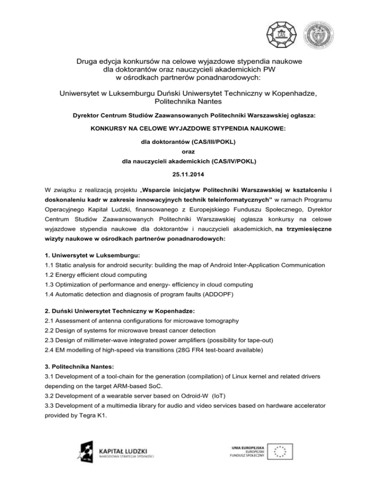 Druga edycja konkursów na celowe wyjazdowe stypendia naukowe dla doktorantów oraz nauczycieli akademickich PW w ośrodkach partnerów ponadnarodowych: Uniwersytet w Luksemburgu Duński Uniwersytet Techniczny w Kopenhadze, Politechnika Nantes Dyrektor Centrum Studiów Zaawansowanych Politechniki Warszawskiej ogłasza: KONKURSY NA CELOWE WYJAZDOWE STYPENDIA NAUKOWE: dla doktorantów (CAS/III/POKL) oraz dla nauczycieli akademickich (CAS/IV/POKL) 25.11.2014 W związku z realizacją projektu „Wsparcie inicjatyw Politechniki Warszawskiej w kształceniu i doskonaleniu kadr w zakresie innowacyjnych technik teleinformatycznych” w ramach Programu Operacyjnego Kapitał Ludzki, finansowanego z Europejskiego Funduszu Społecznego, Dyrektor Centrum Studiów Zaawansowanych Politechniki Warszawskiej ogłasza konkursy na celowe wyjazdowe stypendia naukowe dla doktorantów i nauczycieli akademickich, na trzymiesięczne wizyty naukowe w ośrodkach partnerów ponadnarodowych: 1. Uniwersytet w Luksemburgu: 1.1 Static analysis for android security: building the map of Android Inter-Application Communication 1.2 Energy efficient cloud computing 1.3 Optimization of performance and energy- efficiency in cloud computing 1.4 Automatic detection and diagnosis of program faults (ADDOPF) 2. Duński Uniwersytet Techniczny w Kopenhadze: 2.1 Assessment of antenna configurations for microwave tomography 2.2 Design of systems for microwave breast cancer detection 2.3 Design of millimeter-wave integrated power amplifiers (possibility for tape-out) 2.4 EM modelling of high-speed via transitions (28G FR4 test-board available) 3. Politechnika Nantes: 3.1 Development of a tool-chain for the generation (compilation) of Linux kernel and related drivers depending on the target ARM-based SoC. 3.2 Development of a wearable server based on Odroid-W (IoT) 3.3 Development of a multimedia library for audio and video services based on hardware accelerator provided by Tegra K1. Celowe wyjazdowe stypendia naukowe muszą zostać zrealizowane do końca czerwca 2015 r. Beneficjentem celowego wyjazdowego stypendium naukowego może zostać doktorant będący uczestnikiem studiów doktoranckich prowadzonych przez Politechnikę Warszawską (konkurs CAS/III/POKL) bądź nauczyciel akademicki zatrudniony w pełnym wymiarze czasu pracy w Politechnice Warszawskiej (konkurs CAS/IV/POKL). Kandydaci do celowego wyjazdowego stypendium naukowego powinni posiadać udokumentowany dorobek naukowy. Nie dopuszcza się możliwości jednoczesnego korzystania z dwóch rodzajów stypendiów, przyznawanych w ramach projektów współfinansowanych z funduszy strukturalnych. W ramach konkursu możliwe jest otrzymanie wsparcia na okres trzech miesięcy. Stypendium w wysokości 10 000 zł (brutto) dla doktorantów, a w przypadku nauczycieli akademickich 15 000 zł (brutto), będzie wypłacane na każdy miesiąc pobytu. Kandydat do celowego wyjazdowego stypendium naukowego powinien uzyskać zgodę kierownika jednostki (Dziekana Wydziału), w której odbywa studia doktoranckie lub pracuje. Każdy wyjazd powinien być przygotowany zgodnie z trybem określonym w Zarządzeniu Rektora PW nr 33 z dnia 19 czerwca 2008 r. Osoby, które otrzymają celowe wyjazdowe stypendia naukowe w konkursie CAS/III/POKL lub CAS/IV/POKL nie mogą być zatrudnione przez ośrodek partnera zagranicznego na umowę o pracę w okresie objętym wsparciem. Osoby zainteresowane udziałem w konkursie zapraszamy do złożenia wniosku wraz z wymaganymi załącznikami (przy składaniu kserokopii legitymacji doktoranckiej należy mieć ze sobą oryginał w celu okazania go osobie przyjmującej wniosek, i tym samym potwierdzenia zgodności dokumentu). Nauczyciele akademiccy powinni dołączyć do wniosku aktualne zaświadczenie o zatrudnieniu w Politechnice Warszawskiej, wystawione przez Biuro Spraw Osobowych, i zawierające informację o rodzaju oraz wymiarze etatu, a także o okresie, na jaki pracownik jest zatrudniony. Doktoranci będący na przedłużeniu powinni dołączyć dokument wystawiony przez Dział ds. Studiów potwierdzający status doktoranta oraz termin, do którego ważne jest przedłużenie studiów doktoranckich. Datą ogłoszenia konkursów CAS/III/POKL oraz CAS/IV/POKL na celowe wyjazdowe stypendia naukowe jest 25 listopada 2014 r. (wtorek) Wnioski wraz z załącznikami należy składać w biurze Centrum Studiów Zaawansowanych Politechniki Warszawskiej: Pl. Politechniki 1, p. 154, Gmach Główny PW od 25 października (wtorek) do 9 grudnia (wtorek) 2014 r. w godzinach 8:30 – 16:00 UWAGA: Termin na składanie wniosków upływa 9 grudnia 2014 r. o godzinie 16:00. Ze względów regulaminowych obowiązujących pracowników Centrum Studiów Zaawansowanych, złożenie bądź 2/3 uzupełnienie/wprowadzenie zmiany we wniosku po tym terminie nie będzie możliwe bez względu na przyczynę. Pracownicy Centrum nie mają obowiązku sprawdzania składanych dokumentów. Za kompletność dokumentacji odpowiedzialny jest Wnioskodawca. Konkursy CAS/III/POKL oraz CAS/IV/POKL zostaną rozstrzygnięte przez Komisję Konkursową powołaną przez Rektora Politechniki Warszawskiej na mocy decyzji nr 113/2014 z dnia 18 sierpnia 2014 r. Komisja Konkursowa Centrum ocenia każdą z merytorycznych części wniosku, przyznając punkty, na podstawie których tworzona jest lista rankingowa. W zakres informacji udzielanej przez Centrum Studiów Zaawansowanych o wyniku oceny wniosku wchodzi „0/1” decyzja Komisji Konkursowej. Obowiązujący formularz wniosku, niezbędna deklaracja i oświadczenie Wnioskodawcy, a także regulamin przyznawania stypendiów są dostępne na stronie internetowej http://www.csz.pw.edu.pl oraz w biurze Centrum Studiów Zaawansowanych Politechniki Warszawskiej. Wykaz niezbędnych załączników do wniosku jest wymieniony w części F formularza wniosku. Sekcje B2, C2, D2, E2 należy wypełnić w języku angielskim. Ponadto, w związku z dodatkowymi wytycznymi, do wniosku należy do