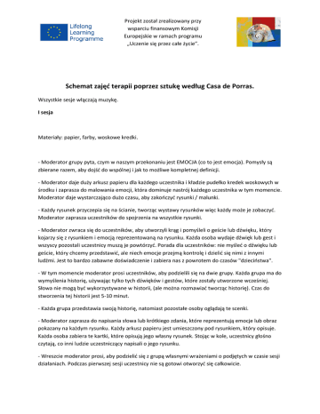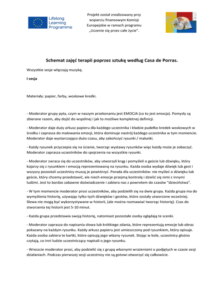 Projekt został zrealizowany przy wsparciu finansowym Komisji Europejskie w ramach programu „Uczenie się przez całe życie”. Schemat zajęć terapii poprzez sztukę według Casa de Porras. Wszystkie sesje włączają muzykę. I sesja Materiały: papier, farby, woskowe kredki. - Moderator grupy pyta, czym w naszym przekonaniu jest EMOCJA (co to jest emocja). Pomysły są zbierane razem, aby dojść do wspólnej i jak to możliwe kompletnej definicji. - Moderator daje duży arkusz papieru dla każdego uczestnika i kładzie pudełko kredek woskowych w środku i zaprasza do malowania emocji, która dominuje nastrój każdego uczestnika w tym momencie. Moderator daje wystarczająco dużo czasu, aby zakończyć rysunki / malunki. - Każdy rysunek przyczepia się na ścianie, tworząc wystawy rysunków więc każdy może je zobaczyć. Moderator zaprasza uczestników do spojrzenia na wszystkie rysunki. - Moderator zwraca się do uczestników, aby utworzyli krąg i pomyśleli o geście lub dźwięku, który kojarzy się z rysunkiem i emocją reprezentowaną na rysunku. Każda osoba wydaje dźwięk lub gest i wszyscy pozostali uczestnicy muszą je powtórzyć. Porada dla uczestników: nie myśleć o dźwięku lub geście, który chcemy przedstawić, ale niech emocje przejmą kontrolę i dzielić się nimi z innymi ludźmi. Jest to bardzo zabawne doświadczenie i zabiera nas z powrotem do czasów "dzieciństwa". - W tym momencie moderator prosi uczestników, aby podzielili się na dwie grupy. Każda grupa ma do wymyślenia historię, używając tylko tych dźwięków i gestów, które zostały utworzone wcześniej. Słowa nie mogą być wykorzystywane w historii, (ale można rozmawiać tworząc historię). Czas do stworzenia tej historii jest 5-10 minut. - Każda grupa przedstawia swoją historię, natomiast pozostałe osoby oglądają te scenki. - Moderator zaprasza do napisania słowa lub krótkiego zdania, które reprezentują emocje lub obraz pokazany na każdym rysunku. Każdy arkusz papieru jest umieszczony pod rysunkiem, który opisuje. Każda osoba zabiera te kartki, które opisują jego własny rysunek. Stojąc w kole, uczestnicy głośno czytają, co inni ludzie uczestniczący napisali o jego rysunku. - Wreszcie moderator prosi, aby podzielić się z grupą własnymi wrażeniami o podjętych w czasie sesji działaniach. Podczas pierwszej sesji uczestnicy nie są gotowi otworzyć się całkowicie. Projekt został zrealizowany przy wsparciu finansowym Komisji Europejskie w ramach programu „Uczenie się przez całe życie”. II sesja Duże lustro jest wymagane. - Moderator prosi grupę, aby usiąść przed lustrem i spojrzeć na siebie. Na początku uczestnicy poruszać górną partią ciała, aby się zrelaksować. Po tym, grupa ma wstać i poruszać dolne części ciała, aby się zrelaksować. Podczas całego procesu uczestnicy mają obserwować siebie w lustrze. W tle jest muzyka. - W parach, jeden przed drugim, uczestnicy muszą używać rąk i słuchać muzyki, aby stworzyć dialog. Dialog odbywa się poprzez mowę ciała i jest ciągłą negocjacją na temat, kto jest wiodącym i prowadzonym bez dominacji lub zdominowania. Celem jest do komunikacja i synchronizacja. Dla niektórych par może być łatwo a dla innych może to być bardzo trudno wykonać to ćwiczenie, ale ważnym jest, aby spróbować. Głównym punktem tego ćwiczenia jest pozwolenie przepływu energii, a proces jest ważniejszy niż wynik. - Moderator gasi światło (lub zamyka okna), w pokoju jest niemal całkowicie ciemno. Prosi wszystkich, aby poruszali się i tańczyli, swobodnie się poruszali. - Po pewnym czasie, moderator zaprasza do utworzenia par, partnerzy mają stanąć do siebie plecami. W tej pozycji uczestnicy nadal tańczą tak jak robili to wcześniej, naśladując masaż pleców partnera podczas tańca. Ćwiczenie odbywa się w turach, najpierw jeden z partnerów wykonuje „masaż”, a potem na odwrót. Głównym celem jest odkrywanie bez myślenia. - W prawie całkowitej ciemności, każdy kładzie się i tańczy na podłodze, pozwalając na nieskrępowane i ruchy i wyrażaniu emocji poprzez ruch. - Moderator prosi uczestników, aby usiąść w kręgu i chwycić się za ręce. W tym momencie, grupa stara się znaleźć wspólny rytm. - zapalić światło lub odsłonić zasłony, włączyć muzykę, 3 kawałki po sobie, w zupełnie różnych od siebie stylach. Uczestnicy tańczą do dźwięków, podczas gdy muzyka gra. - Podczas, gdy uczestnicy odpoczywają na podłodze, moderator zaprasza ich do wyboru muzyki z trzech używanych dotychczas. Celem jest wymyślenie historii, jako interpretacji wybranego kawałka muzyki. Jeśli to konieczne, muzyka może być odtwarzana ponownie. - Teraz każdy jest proszony o zatańczenie do muzyki wymyślonej historii indywidualnie przed grupą. - Aby zakończyć, moderator zwraca się do grupy, aby usiąść przed lustrem i powtórzyć czynności wykonywane na początku (zrelaksowanie górnej i dolnej części ciała). Projekt został zrealizowany przy wsparciu finansowym Komisji Europejskie w ramach programu „Uczenie się przez całe życie”. III Sesja Kolor-kształt-ruchu. Materiały: gwiazdy, plastelina, farby, papier, nożyczki, taśmy. Wygodnie jest mieć wodę i mydło do mycia rąk po zakończeniu ćwiczenia. - Ćwiczenie rozpoczyna się poprzez zrelaksowanie się leżąc na podłodze. Moderator pomaga grupie zrelaksować się, wyjaśniając, jak prawidłowo oddychać. Moderator prosi uczestników o wizualizację emocji, która dominuje każdego z uczestników. Aby proces był łatwiejszy, uczestnik proszeni są o użycie rąk tworząc emocję i poczucie jej między rękami. Emocja ma kolor i kształt. Powoli zrelaksować ręce i położy je na podłodze, wizualizacja pozostaje w wyobraźni. Myślenia w sposób racjonalny, nie pomaga w tym ćwiczeniu, blokuje wyobraźnię i przypływ emocji. Powoli, grupa koncentruje się znowu na oddechu i pow