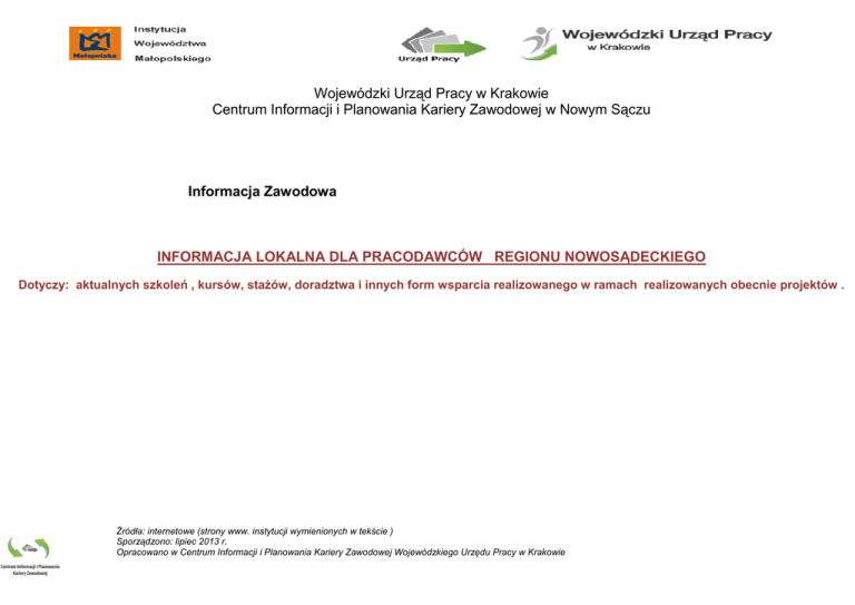 Wojewódzki Urząd Pracy w Krakowie Centrum Informacji i Planowania Kariery Zawodowej w Nowym Sączu Informacja Zawodowa INFORMACJA LOKALNA DLA PRACODAWCÓW REGIONU NOWOSĄDECKIEGO Dotyczy: aktualnych szkoleń , kursów, staŜów, doradztwa i innych form wsparcia realizowanego w ramach realizowanych obecnie projektów . Źródła: internetowe (strony www. instytucji wymienionych w tekście ) Sporządzono: lipiec 2013 r. Opracowano w Centrum Informacji i Planowania Kariery Zawodowej Wojewódzkiego Urzędu Pracy w Krakowie Organizator Sądecka Izba Gospodarcza ul. Zielona 27 33–300 NowySącz tel. 18 449 91 64, tel./fax 18 449 91 65 e-mail: [email protected] www.sig.org.pl Szkolenia, kursy Nazwa Dla kogo? Inne wsparcie, np. staŜe, doradztwo, narzędzia Termin Nazwa Doradztwo w ramach projektu „Doradca Małopolskiego Przedsiębiorcy” Doradztwo w ramach projektu Dla kogo? Oferta Termin Mikro, małe i średnie przedsiębiorstwa (w tym osoby fizyczne) prowadzące działalność na terenie małopolski posiadające siedzibę, oddział, filię na terenie województwa małopolskiego, spełniające kryteria działania 8.1.1 PO KL oraz mogące ubiegać się o pomoc de minimis Doradztwo w zakresie: - prowadzenia działalności gospodarczej, - organizacji i zarządzania przedsiębiorstwem, - marketingu i finansów -działalności eksportowej - innowacyjnych rozwiązań 1.11.11 - 31.10.14 Doradztwo w zakresie: 1.01.12-31.12.13 Źródła: internetowe (strony www. instytucji wymienionych w tekście ) Sporządzono: lipiec 2013 r. Opracowano w Centrum Informacji i Planowania Kariery Zawodowej Wojewódzkiego Urzędu Pracy w Krakowie Nowy Sącz „Managerow ie Małopolski na trudne czasy” Szkolenia w ramach projektu „Akademia Zarządzania ” w zakresie zarządzania: personelem, jakością, firmą, sprzedaŜą i Dla właścicieli i pracowników mikro, małych i średnich przedsiębiors tw, którzy do tej pory nie uzyskali pomocy w ramach Poddziałania 8.1.1 w związku z objęciem ich wsparciem w ramach projektów szkoleniowyc h zamkniętych, realizowanyc h w ramach POKL 911.09.13 2325.09.13 1416.10.13 2123.10.13 Dla mikro i małych przedsiębiors tw 1.01.12 31.12.13 „Akademia zarządzania” Mikro i małe przedsiębiorstwa zarządzania personelem, jakością, firmą, sprzedaŜą i finansami Nowy Sącz Nowy Sącz Źródła: internetowe (strony www. instytucji wymienionych w tekście ) Sporządzono: lipiec 2013 r. Opracowano w Centrum Informacji i Planowania Kariery Zawodowej Wojewódzkiego Urzędu Pracy w Krakowie RóŜne miasta (informacje na stronie www) finansami Małopolska Agencja Rozwoju Regionalnego S.A ul. Kordylewskiego 11 31-542 Kraków www.marr.pl Punkt Konsultacyjny w Nowym Sączu ul. Kościuszki 9, 33300 Nowy Sącz, godz. pracy: pon.: 8.00-18.00 wt.-pt.: 8.00-16.00 tel. 18 444 21 31 email:pknowysacz@ma rr.pl Szkolenia w ramach projektu pn. „Wiedza, Praktyka, Współpraca ” Szkolenia tematyczne (innowacje technologiczn e, organizacyjn e, procesowe, marketingow e) w ramach projektu „Ekspert ds. Innowacji” specjalistycz Dla pracowników naukowych w firmach i dla pracowników MŚP w jednostkac h naukowych od stycznia 2013 do grudni a 2014 roku Przedsiębior cy lub skierowani przez pracodawców pracownicy mikro, małych posiadającyc h siedzibę, oddział, filię lub inną jednostkę organizacyjną na terenie województwa małopolskieg o. Pracownicy od kwietn ia 2012 do marca 2014 roku. StaŜe i narzędzie w ramach projektu pn. „Wiedza, Praktyka, Współpraca” Dla firm, które posiadają siedzibę (oddział, filię) w Małopolsce i chcą przyjąć na staŜ pracownika naukowego oraz dla naukowców pracowników naukowych jednostek naukowych oraz pracowników naukowych i naukowodydaktycznych uczelni. -StaŜe dla pracowników naukowych w firmach od stycznia 2013 do grudnia 2014 roku -StaŜe dla pracowników MŚP w jednostkach naukowych Na terenie małopolski Doradztwo szkoleniowe w ramach projektu „Ekspert ds. Innowacji” Przedsiębiorcy lub skierowani przez pracodawców pracownicy mikro, małych posiadających siedzibę, oddział, filię lub inną jednostkę organizacyjną na terenie województwa małopolskiego. Doradztwo w zakresie rozwijania i udoskonalania firmy – pomoc w nabyciu niezbędnych umiejętności. Wiedza o tym, jak wprowadzać nowe rozwiązania w biznesie i optymalizować działalność. od kwietnia 2012 do marca 2014 roku. Specjalistyczne Pracownicy Doradztwo w zakresie kwiecień 2013 - Na terenie Małopols ki Na terenie Małopols ki kwiecień -Sieć wiedzy i praktyki [internetowe narzędzie wymiany i komunikacji między przedstawicielami nauki i biznesu] Źródła: internetowe (strony www. instytucji wymienionych w tekście ) Sporządzono: lipiec 2013 r. Opracowano w Centrum Informacji i Planowania Kariery Zawodowej Wojewódzkiego Urzędu Pracy w Krakowie Na terenie Małopolski ne szkolenia w zakresie wdraŜania innowacyjnyc h rozwiązań w branŜach Life Science, ICT, Chemia, ZrównowaŜo na energetyka, Usługi ICT&life science, Przemysły kultury (kreatywne), turystyka historyczna i przemysłow a w ramach projektu „Zielone Światło Innowacji” przedsiębior stw: z sektora MŚP, (mikro, małe, średnie przedsiębiors twa)zatrudnieni na umowę o pracę na terenie Małopolski, odpowiedzial ni za wdraŜanie innowacyjnoś ci lub posiadają wpływ na rozwój zakładu pracy, z którego są oddelegow ani, -chcący podnieść kompetencje zawodowe w zakresie wdraŜania nowoczesnyc h technologii, -pracujący 2013 marzec 2015 Na terenie Małopols ki doradztwo w zakresie wdraŜania innowacyjnych rozwiązań w ramach projektu „Zielone Światło Innowacji” przedsiębiorstw: z sektora MŚP, (mikro, małe, średnie przedsiębiorstwa), -zatrudnieni na umowę o pracę na terenie Małopolski, -odpowiedzialni za wdraŜanie innowacyjności lub posiadają wpływ na rozwój zakładu pracy, z którego są oddelegowani, wdraŜania innowacyjnych rozwiązań w tym sposobów, me