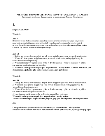 NIEKTÓRE PROPOZYCJE ZAPISU KONSTYTUCYJNEGO O LASACH Propozycje społeczne dyskutowane w ramach prac Zespołu Sterującego 1. (zapis 28.02.2014) Wersja A Art. 5. Rzeczpospolita Polska strzeże niepodległości i nienaruszalności swojego terytorium, zapewnia wolności i prawa człowieka i obywatela oraz bezpieczeństwo obywateli, strzeże dziedzictwa narodowego oraz zapewnia ochronę środowiska, szczególnie lasów, kierując się zasadą zrównoważonego rozwoju. Art. 64. 1. Każdy ma prawo do własności, innych praw majątkowych oraz prawo dziedziczenia. 2. Własność, inne prawa majątkowe oraz prawo dziedziczenia podlegają równej dla wszystkich ochronie prawnej. 3. Własność może być ograniczona tylko w drodze ustawy i tylko w zakresie, w jakim nie narusza ona istoty prawa własności. 4. Własność lasów państwowych jest niepodzielna i niezbywalna. Zmiana własności jest dopuszczalna jedynie, gdy jest dokonywana na cele publiczne. Wersja B Art. 64. 1. Każdy ma prawo do własności, innych praw majątkowych oraz prawo dziedziczenia. 2. Własność, inne prawa majątkowe oraz prawo dziedziczenia podlegają równej dla wszystkich ochronie prawnej. 3. Własność może być ograniczona tylko w drodze ustawy i tylko w zakresie, w jakim nie narusza ona istoty prawa własności. 4. Lasy jako czynnik środowiska podlegają szczególnej ochronie. Własność lasów państwowych jest niepodzielna i niezbywalna. Zmiana własności jest dopuszczalna jedynie, gdy jest dokonywana na cele publiczne. albo Lasy państwowe jako dziedzictwo narodowe, są niepodzielne i niezbywalne. Każdorazowa zmiana własności uzasadniona celami publicznymi, wymaga decyzji sądu. 1 2. LASY W KONSTYTUCJI (C) (zapis 28.02.2014) Art. 5. Rzeczpospolita Polska strzeże niepodległości i nienaruszalności swojego terytorium, zapewnia wolności i prawa człowieka i obywatela oraz bezpieczeństwo obywateli, strzeże dziedzictwa narodowego oraz zapewnia ochronę środowiska, szczególnie lasów, kierując się zasadą zrównoważonego rozwoju. lub Art. 74. 1. Władze publiczne prowadzą politykę zapewniającą bezpieczeństwo ekologiczne współczesnemu i przyszłym pokoleniom. 2. Ochrona środowiska jest obowiązkiem władz publicznych. Szczególnej ochronie podlegają środowiskotwórcze wartości lasów. 3. Każdy ma prawo do informacji o stanie i ochronie środowiska. 4. Władze publiczne wspierają działania obywateli na rzecz ochrony i poprawy stanu środowiska. Art. 64. 1. Każdy ma prawo do własności, innych praw majątkowych oraz prawo dziedziczenia. 2. Własność, inne prawa majątkowe oraz prawo dziedziczenia podlegają równej dla wszystkich ochronie prawnej. 3. Własność może być ograniczona tylko w drodze ustawy i tylko w zakresie, w jakim nie narusza ona istoty prawa własności. 4. Własność lasów państwowych jest niepodzielna i niezbywalna. Zmiana własności jest dopuszczalna jedynie, gdy jest dokonywana na cele publiczne. 3. Propozycja prof. dr hab. Władysława CHAŁUPKI Art. 74. 1. Władze publiczne prowadzą politykę zapewniającą bezpieczeństwo ekologiczne współczesnemu i przyszłym pokoleniom. 1a (lub 2). Strategiczne zasoby naturalne kraju są dobrem narodowym i jako własność Skarbu Państwa nie podlegają przekształceniom własnościowym. 2 (lub 3). Ochrona środowiska jest obowiązkiem władz publicznych. 3 (lub 4). Każdy ma prawo do informacji o stanie i ochronie środowiska. 4 (lub 5). Władze publiczne wspierają działania obywateli na rzecz ochrony i poprawy stanu środowiska. 2 4. Propozycja KSZNOŚiL NSZZ „SOLIDARNOŚĆ” 5. Art. 64 ust. 4. (Wszystkie) lasy (w swych funkcjach środowiskowych) podlegają szczególnej ochronie. Lasy państwowe jako dobro narodowe są niepodzielne i niezbywalne. Każdorazowe przekształcenie własności (zmiana własności) wymaga decyzji sądu. lub Art. 64 ust. 4. (Wszystkie) lasy (w swych funkcjach środowiskowych) podlegają szczególnej ochronie. ust. 5. Lasy państwowe (jako dobro narodowe) są niepodzielne i niezbywalne. Każdorazowe przekształcenie własności/zmiana własności wymaga decyzji sądu. 3 6. Propozycja po korektach A Art. 74. 1. Władze publiczne prowadzą politykę zapewniającą bezpieczeństwo ekologiczne współczesnemu i przyszłym pokoleniom. 2. Ochrona środowiska jest obowiązkiem władz publicznych. Szczególnej ochronie podlegają lasy jako dziedzictwo narodowe. 3. Każdy ma prawo do informacji o stanie i ochronie środowiska. 4. Władze publiczne wspierają działania obywateli na rzecz ochrony i poprawy stanu środowiska. 5. Lasy państwowe podlegają zarządowi jednostki organizacyjnej Skarbu Państwa. Przeniesienie własności może nastąpić jedynie na podstawie prawomocnego orzeczenia sądu czy jest to uzasadnione celami publicznymi lub celami zrównoważonej gospodarki leśnej. B (uproszczona) Art. 74. 1. Władze publiczne prowadzą politykę zapewniającą bezpieczeństwo ekologiczne współczesnemu i przyszłym pokoleniom. 2. Ochrona środowiska jest obowiązkiem władz publicznych. Szczególnej ochronie podlegają lasy jako dziedzictwo narodowe. 3. Każdy ma prawo do informacji o stanie i ochronie środowiska. 4. Władze publiczne wspierają działania obywateli na rzecz ochrony i poprawy stanu środowiska. 5. Lasy państwowe podlegają zarządowi jednostki organizacyjnej Skarbu Państwa. Przeniesienie własności może nastąpić jedynie na podstawie prawomocnego orzeczenia sądu. 7. PROPOZYCJA ROLP USTAWA z dnia …………………… o zmianie Konstytucji Rzeczypospolitej Polskiej Art1) W Konstytucji Rzeczpospolitej Polskiej z dnia 02.kwietnia 1997r ( Dz.U.Nr.78.poz.483,z póż.zm. dodaje się art. 74 a w brzmieniu: 4 Art74a 1. Lasy stanowiące własność Skarbu Państwa są dobrem wspólnym i podlegają szczególnej ochronie. 2. Lasy stanowiące własność Skarbu Państwa zachowują jedność organizacyjną i nie podlegają przekształceniom własnościowym 3. Lasy stan