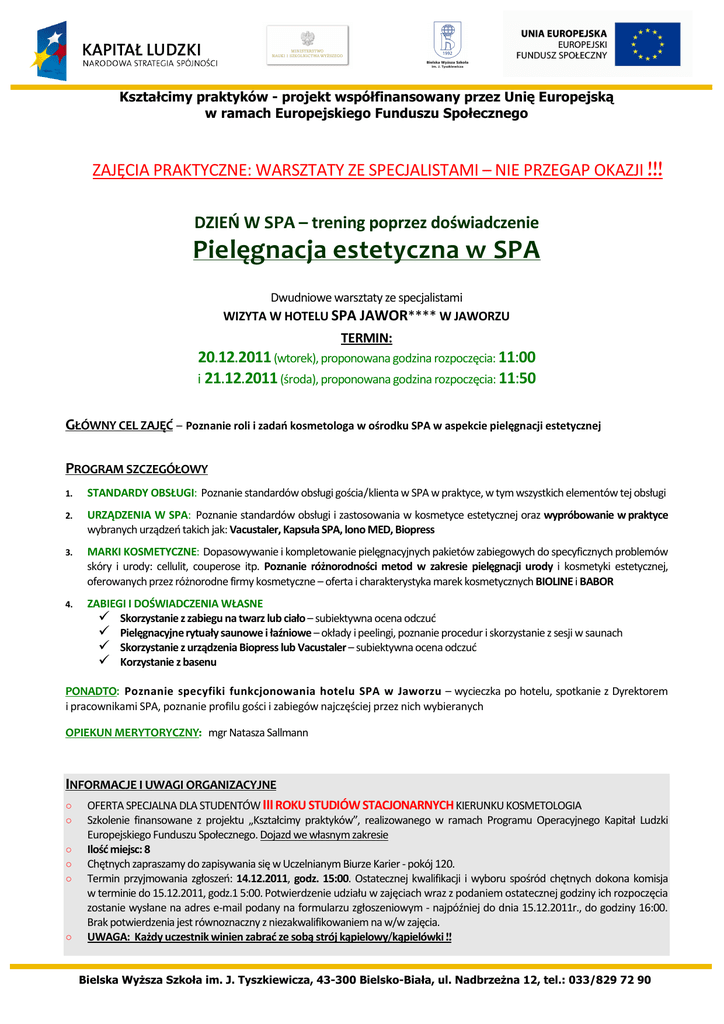 Kształcimy praktyków - projekt współfinansowany przez Unię Europejską w ramach Europejskiego Funduszu Społecznego ZAJĘCIA PRAKTYCZNE: WARSZTATY ZE SPECJALISTAMI – NIE PRZEGAP OKAZJI !!! DZIEŃ W SPA – trening poprzez doświadczenie Pielęgnacja estetyczna w SPA Dwudniowe warsztaty ze specjalistami WIZYTA W HOTELU SPA JAWOR**** W JAWORZU TERMIN: 20.12.2011 (wtorek), proponowana godzina rozpoczęcia: 11:00 i 21.12.2011 (środa), proponowana godzina rozpoczęcia: 11:50 GŁÓWNY CEL ZAJĘĆ – Poznanie roli i zadań kosmetologa w ośrodku SPA w aspekcie pielęgnacji estetycznej PROGRAM SZCZEGÓŁOWY 1. STANDARDY OBSŁUGI: Poznanie standardów obsługi gościa/klienta w SPA w praktyce, w tym wszystkich elementów tej obsługi 2. URZĄDZENIA W SPA: Poznanie standardów obsługi i zastosowania w kosmetyce estetycznej oraz wypróbowanie w praktyce wybranych urządzeń takich jak: Vacustaler, Kapsuła SPA, lono MED, Biopress 3. MARKI KOSMETYCZNE: Dopasowywanie i kompletowanie pielęgnacyjnych pakietów zabiegowych do specyficznych problemów skóry i urody: cellulit, couperose itp. Poznanie różnorodności metod w zakresie pielęgnacji urody i kosmetyki estetycznej, oferowanych przez różnorodne firmy kosmetyczne – oferta i charakterystyka marek kosmetycznych BIOLINE i BABOR 4. ZABIEGI I DOŚWIADCZENIA WŁASNE Skorzystanie z zabiegu na twarz lub ciało – subiektywna ocena odczuć Pielęgnacyjne rytuały saunowe i łaźniowe – okłady i peelingi, poznanie procedur i skorzystanie z sesji w saunach Skorzystanie z urządzenia Biopress lub Vacustaler – subiektywna ocena odczuć Korzystanie z basenu PONADTO: Poznanie specyfiki funkcjonowania hotelu SPA w Jaworzu – wycieczka po hotelu, spotkanie z Dyrektorem i pracownikami SPA, poznanie profilu gości i zabiegów najczęściej przez nich wybieranych OPIEKUN MERYTORYCZNY: mgr Natasza Sallmann INFORMACJE I UWAGI ORGANIZACYJNE ○ ○ ○ ○ ○ ○ OFERTA SPECJALNA DLA STUDENTÓW III ROKU STUDIÓW STACJONARNYCH KIERUNKU KOSMETOLOGIA Szkolenie finansowane z projektu „Kształcimy praktyków”, realizowanego w ramach Programu Operacyjnego Kapitał Ludzki Europejskiego Funduszu Społecznego. Dojazd we własnym zakresie Ilość miejsc: 8 Chętnych zapraszamy do zapisywania się w Uczelnianym Biurze Karier - pokój 120. Termin przyjmowania zgłoszeń: 14.12.2011, godz. 15:00. Ostatecznej kwalifikacji i wyboru spośród chętnych dokona komisja w terminie do 15.12.2011, godz.1 5:00. Potwierdzenie udziału w zajęciach wraz z podaniem ostatecznej godziny ich rozpoczęcia zostanie wysłane na adres e-mail podany na formularzu zgłoszeniowym - najpóźniej do dnia 15.12.2011r., do godziny 16:00. Brak potwierdzenia jest równoznaczny z niezakwalifikowaniem na w/w zajęcia. UWAGA: Każdy uczestnik winien zabrać ze sobą strój kąpielowy/kąpielówki !! Bielska Wyższa Szkoła im. J. Tyszkiewicza, 43-300 Bielsko-Biała, ul. Nadbrzeżna 12, tel.: 033/829 72 90 Str. 1 / 1