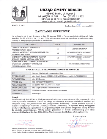 URZĄD GMINY BRALIN 63-640 Bralin, ul. Rynek 3 fax. (62)78 LI 202 tel. (62)78 11 201 NIP: 619-10-80-414 ; Regon:000535824 lin. tn. so.13r.9.20rr Bralin, on u. €(.. czerwca[Ol7 ZAPYTANIE OFERTOWE Na podstawie art. 4 pkt. 8 ustawy z dnia Ż9 sĘcznia 2004 r. Prawo zamówień publicznych (tekst jednolity: Dz. U. z Ż0I0 r. Nr 1 13, poz. 7 59 z poźn zm.) zwracam się z prośbąo przedłożenieofeĘ cenowej w następuj ącym przedmiocie zamówienia: TYp."tj,gENG.Jl LICENCJA MICROSOFT WINDOWS 7 PROFESSIONAL PL GGWA LICENCJA MICROSOFT WINDOWS SERVER CAL 2OO8 USER MOLP GOV .szTl 16 35 MICROSOFT WINDOWS REMOTE DESKTOP SERVICES 2OO8 R2 USER CAL MOLP GOV 10 KOMPUTER PC TYPU COMPAQ WYPOSAZONY W LICENCJE MICROSOFT WINDOWS 7 PROFESSIONAL PL OEM 4 KOIV!ENTARZ l( LICENCJA GRUPOWA OTWARTA LICENCJA MICROSOFT OPEN OTWARTA LICENCJA MICROSOFT OPEN WG. PON IZSZEJ SPECYFI KACJ I SPECYFIKACJA STANOWISK KOMPUTEROWYCH Zalecany COMPAQ lub inny podobnej klasy YP TYP PROCESORA lntel Core 2 Duo min E7500(2.93 GHz,3MB Cache magistrala FSB 1066 MHz) PŁYIA'GŁoWIvA lntel Q45 Express pAMlĘĆnnnn, 4 GB DDR3 SDRAM 1333 MHz POJEMNOSC HDD min 320 GB 7200 obr./min SATA 3Gb/s KARTA GRAFICZNA lntel Graphics Media Accelerator 4500 OPROGRAMOWANIE Microsoft Windows 7 Professional 32bit Pl OEM GWARANCJA 24 miesiące Uwagi: Termin rea|izacji do 8.07.2011r. Niniejsze zapytanie ofertowe proszę traktowaó jako tozpoznanie rynku celem wykonania zamówienia. Zwraca się uwagę, 4e oferowany przedmiot zamówienia powinien byó fabrycznie nowy' bez jakichkolwiek wad, przygotowany do instalacji. oferent powinien v,ykazać i załączyć kompetencje Microsoft Licensing Solutions Competency. W wycenie naleĘ uwzględnić lrwoty brutto (łącznie z podatkiem vAT) poszczególnych porycji oraz uwzględnić koszĘ dostawy do siędziby zamawiającego. ofertę naleĘ przekazać w formie elektronicznej pod adres informaĘ[email protected] do dnia 28.06.Żut r. Nie dopuszcza się składania ofert częściowych. ,: i'.1 j'i 'ł '! ''. .l'.1 -" !, r r:li '; i: .i"1'i .i.': ;1 ,ł.' t{ ;":,; -,r7 l,tN\ ;,1rgiil Sprawę prowadzi: inż' Radosław Murawski :t:.|rf łiI, 1ł''l ł,łi'ii'i,:'i";;;i; '"i'.r'}t;a a1IiłII'rY