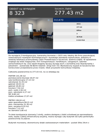 OBIEKT na WYNAJEM 8 323 Szczecin, Dąbie 277.43 m2 311470 2015 277.43 Office 2 30 PLN 8 323 PLN Opis Do wynajęcia 2-kondygnacyjny, kameralny biurowiec z 2015 roku idealny dla firmy poszukującej nowoczesnych rozwiązań technologicznych i wysokiego standardu wykończenia, położony w świetnej lokalizacji przemysłowej części Prawobrzeża w Szczecinie, dzielnica Dąbie. W sąsiedztwie znajduje się wiele magazynów, firm transportowych, handlowych, usługowych, salonów samochodowych itp. oraz węzeł drogowy łączący Europę wsch z zachodnią oraz Skandynawię z południem - autostrada A6 Berlin-Gdańsk i drogi S10 i S3. Błyskawiczny wyjazd ze Szczecina bez konieczności przejeżdżania przez miasto. Obok przystanki komunikacji miejskiej. Całkowita powierzchnia to 277,43 m2, na co składają się: PARTER 141,39 m2 pomieszczenie biurowe 16,07 m2 sala konferencyjna 17,12 m2 sekretariat 31,33 m2 gabinet 19,53 m2 gabinet 19,40 m2 korytarz 7,54 m2 pom. szafa 2,56 m2 pom. sekretarki 4,17 m2 WC 6,60 m2 klatka schodowa 17,07 m2 PIĘTRO 136,04 m2 open space/biuro 84,21 m2 pom. kierownika 31,30 m2 pom. socjalne 8,33 m2 korytarz 7,12 m2 wc damskie 5,08 m2 Te dwie kondygnacje stanowią 2 strefy, osobno dostępne z klatki schodowej po wprowadzeniu kodu, każda z pełną infrastrukturą socjalną, można wynająć cały budynek lub tylko parter/tylko powierzchnię na piętrze. Budynek murowany, ekonomiczny dzięki zastosowanym materiałom - pustak Silka 24cm z RYZO NIERUCHOMOŚCI sp. z o.o. dociepleniem 15cm, dach dobrze zaizolowany, ocieplenie od strony gruntu. Powierzchnia wykończona w wysokim standardzie - na podłodze w części biurowej elegancka wykładzina dywanowa, sufity podwieszane, w części socjalnej glazura i terakota, otwierane okna. Ogrzewanie indywidualne gazowe, komfort pracy zapewniają kaloryfery z regulacją temperatury oraz w pomieszczeniach biurowych klimatyzatory z funkcją chłodzenia/grzania. Ciepła woda ogrzewacze elektryczne przepływowe. Media miejskie - prąd, woda, kanalizacja. Wentylacja grawitacyjna i mechaniczna z rekuperacją. Oświetlenie LED i fluorescencyjne, centrala telefoniczna i sieć komputerowa. Teren jest ogrodzony i strzeżony - przy bramie wjazdowej strażnik, kamery, elektroniczna kontrola dostępu do budynku i instalacja alarmowa. Cena wynajmu: 35zł/m2 netto + podatek VAT 23% plus opłaty za prąd wg zużycia, ogrzewanie proporcjonalnie wg powierzchni, woda i ścieki wg zużycia. Zostaje wyposażenie w części socjalnej - meble i sprzęty do uzgodnienia. Prezentowana nieruchomość jest bardzo atrakcyjna ze względu na cenę w stosunku do standardu oraz na świetną lokalizację. Możliwe wydanie natychmiastowe. Zapraszam! RYZO NIERUCHOMOŚCI sp. z o.o. tel. 91 484 22 84 email: [email protected] RYZO NIERUCHOMOŚCI sp. z o.o. Powered by TCPDF (www.tcpdf.org)