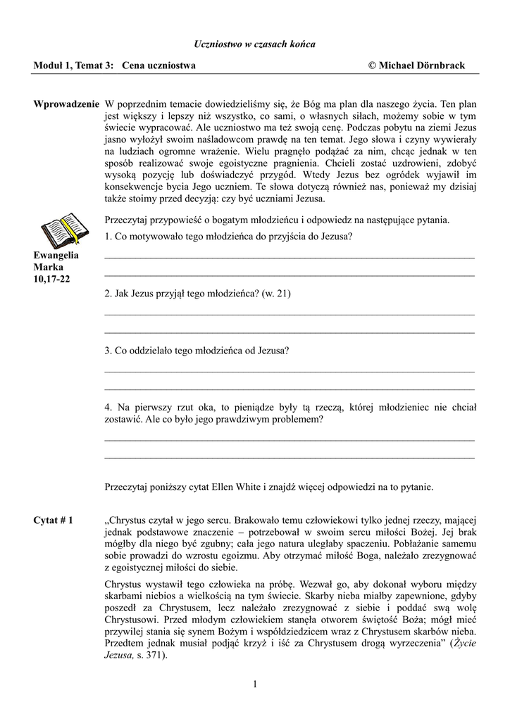 Uczniostwo w czasach końca Moduł 1, Temat 3: Cena uczniostwa © Michael Dörnbrack Wprowadzenie W poprzednim temacie dowiedzieliśmy się, że Bóg ma plan dla naszego życia. Ten plan jest większy i lepszy niż wszystko, co sami, o własnych siłach, możemy sobie w tym świecie wypracować. Ale uczniostwo ma też swoją cenę. Podczas pobytu na ziemi Jezus jasno wyłożył swoim naśladowcom prawdę na ten temat. Jego słowa i czyny wywierały na ludziach ogromne wrażenie. Wielu pragnęło podążać za nim, chcąc jednak w ten sposób realizować swoje egoistyczne pragnienia. Chcieli zostać uzdrowieni, zdobyć wysoką pozycję lub doświadczyć przygód. Wtedy Jezus bez ogródek wyjawił im konsekwencje bycia Jego uczniem. Te słowa dotyczą również nas, ponieważ my dzisiaj także stoimy przed decyzją: czy być uczniami Jezusa. Przeczytaj przypowieść o bogatym młodzieńcu i odpowiedz na następujące pytania. 1. Co motywowało tego młodzieńca do przyjścia do Jezusa? Ewangelia Marka 10,17-22 ________________________________________________________________________ ________________________________________________________________________ 2. Jak Jezus przyjął tego młodzieńca? (w. 21) ________________________________________________________________________ ________________________________________________________________________ 3. Co oddzielało tego młodzieńca od Jezusa? ________________________________________________________________________ ________________________________________________________________________ 4. Na pierwszy rzut oka, to pieniądze były tą rzeczą, której młodzieniec nie chciał zostawić. Ale co było jego prawdziwym problemem? ________________________________________________________________________ ________________________________________________________________________ Przeczytaj poniższy cytat Ellen White i znajdź więcej odpowiedzi na to pytanie. Cytat # 1 „Chrystus czytał w jego sercu. Brakowało temu człowiekowi tylko jednej rzeczy, mającej jednak podstawowe znaczenie – potrzebował w swoim sercu miłości Bożej. Jej brak mógłby dla niego być zgubny; cała jego natura uległaby spaczeniu. Pobłażanie samemu sobie prowadzi do wzrostu egoizmu. Aby otrzymać miłość Boga, należało zrezygnować z egoistycznej miłości do siebie. Chrystus wystawił tego człowieka na próbę. Wezwał go, aby dokonał wyboru między skarbami niebios a wielkością na tym świecie. Skarby nieba miałby zapewnione, gdyby poszedł za Chrystusem, lecz należało zrezygnować z siebie i poddać swą wolę Chrystusowi. Przed młodym człowiekiem stanęła otworem świętość Boża; mógł mieć przywilej stania się synem Bożym i współdziedzicem wraz z Chrystusem skarbów nieba. Przedtem jednak musiał podjąć krzyż i iść za Chrystusem drogą wyrzeczenia” (Życie Jezusa, s. 371). 1 Każdy musi podjąć decyzję! Ewangelia Łukasza 14,25-33 Jezus nie wzywa każdego z nas do sprzedania wszystkiego, co mamy i rozdania pieniędzy ubogim. Musimy jednak dokonać takiego samego wyboru, jak ten bogaty młodzieniec. Albo oddamy całe nasze serce Jezusowi albo pozwolimy by przywiązało się do rzeczy tego świata. Oczywiście zbawienie jest darem dla każdego; nie możemy nań zarobić żadną naszą pracą. A jednak istnieje cena, którą musimy zapłacić jeśli chcemy być uczniami Jezusa. W poniższych wersetach Jezus przemawia do tłumów na temat ceny uczniostwa. Nawołuje ludzi do tego by przyjrzeli się kosztom i świadomie zadecydowali czy rzeczywiście chcą być Jego naśladowcami. Jezus trzykrotnie mówi: „(...) nie może być uczniem moim.” Kiedy ktoś nie może być uczniem Jezusa? w. 26:___________________________________________________________________ ________________________________________________________________________ w. 27:___________________________________________________________________ ________________________________________________________________________ w. 33:___________________________________________________________________ ________________________________________________________________________ Nic nie może być ważniejsze niż Jezus! Te wypowiedzi brzmią nieco drastycznie. Mówiąc o nienawidzeniu rodziny, Jezus stawia sprawę na ostrzu noża, by dobitnie uświadomić ludziom o co chodzi. Jezus przecież sam kocha naszą rodzinę. Chodziło tu o to by ludzie zrozumieli, że nic nie powinno być dla nich ważniejsze niż Jezus: żadna osoba (w. 26), żadne zadanie (w. 27) ani żadna rzecz (w. 33). Jezus wzywa każdego kto chce być Jego uczniem do rozważenia kosztów uczniostwa i podjęcia decyzji o postawieniu Go na pierwszym miejscu. Zastanów się przez chwilę jakie rzeczy w Twoim życiu mogą zajmować miejsce Chrystusa? ________________________________________________________________________ ________________________________________________________________________ ________________________________________________________________________ ________________________________________________________________________ ________________________________________________________________________ Ewangelia Łukasza 9,23 ________________________________________________________________________ Jezus wymienia tu 3 kroki, które musi wykonać każdy jego naśladowca. Jakie to kroki? a.)______________________________________________________________________ b.)______________________________________________________________________ c.)______________________________________________________________________ 2 1. krok Zaparcie się samego siebie Co według Ciebie znaczy zaprzeć się samego siebie? ________________________________________________________________________ ________________________________________________________________________ ________________________________________________________________________ ________________________________________________________________________ Co to (nie) oznacza Kiedy Jezus mówił o zap