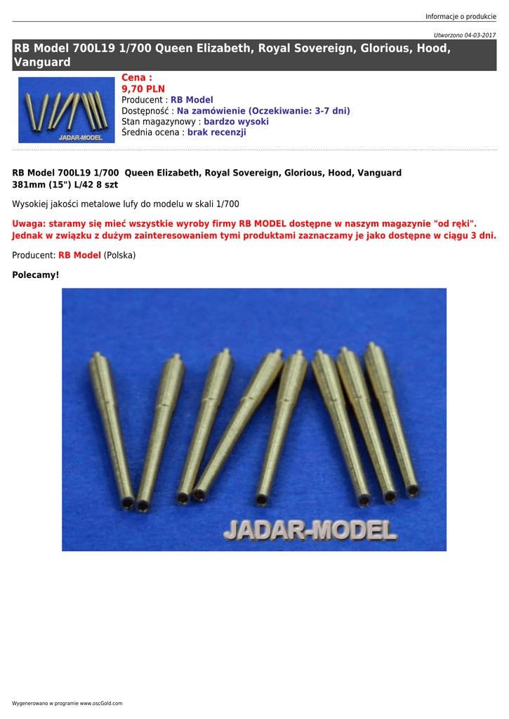 Informacje o produkcie Utworzono 04-03-2017 RB Model 700L19 1/700 Queen Elizabeth, Royal Sovereign, Glorious, Hood, Vanguard Cena : 9,70 PLN Producent : RB Model Dostępność : Na zamówienie (Oczekiwanie: 3-7 dni) Stan magazynowy : bardzo wysoki Średnia ocena : brak recenzji RB Model 700L19 1/700 Queen Elizabeth, Royal Sovereign, Glorious, Hood, Vanguard 381mm (15") L/42 8 szt Wysokiej jakości metalowe lufy do modelu w skali 1/700 Uwaga: staramy się mieć wszystkie wyroby firmy RB MODEL dostępne w naszym magazynie "od ręki". Jednak w związku z dużym zainteresowaniem tymi produktami zaznaczamy je jako dostępne w ciągu 3 dni. Producent: RB Model (Polska) Polecamy! Wygenerowano w programie www.oscGold.com Ważne informacje: - Całkowita cena niniejszego przedmiotu wraz z kosztami przesyłki będzie widoczna po "wrzuceniu" go do koszyka. - Zamówione towary wysyłamy w ciągu 3 dni. Wyjątkiem są przedmioty, gdzie w oknie "Dostępność" jest podany termin oznaczający, że towar będzie sprowadzony na indywidualne zamówienie klienta. Jeśli zamówione zostaną przedmioty dostępne "od ręki" oraz te "na zamówienie" termin wysyłki ulegnie zmianie o czas potrzebny na sprowadzenie towaru. - Wszystkie dostępne w naszym sklepie formy płatności są widoczne w regulaminie sklepu oraz po przejściu do koszyka.