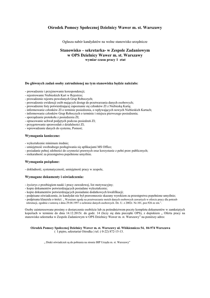 Ośrodek Pomocy Społecznej Dzielnicy Wawer m. st. Warszawy Ogłasza nabór kandydatów na wolne stanowisko urzędnicze Stanowisko – sekretarka- w Zespole Zadaniowym w OPS Dzielnicy Wawer m. st. Warszawy wymiar czasu pracy 1 etat Do głównych zadań osoby zatrudnionej na tym stanowisku będzie należało: - prowadzenie i przyjmowanie korespondencji; - rejestrowanie Niebieskich Kart w Rejestrze; - prowadzenie rejestru powołanych Grup Roboczych; - prowadzenie ewidencji osób mających dostęp do przetwarzania danych osobowych; - prowadzenie listy potwierdzającej zapoznanie się członków ZI z Niebieską Kartą; - informowanie członków ZI o terminie posiedzenia, o wpływających nowych Niebieskich Kartach; - informowanie członków Grup Roboczych o terminie i miejscu pierwszego posiedzenia; - sporządzanie protokołu z posiedzenia ZI; - opracowanie uchwał podjętych podczas posiedzeń ZI; - przygotowanie sprawozdań z działalności ZI; - wprowadzanie danych do systemu, Pomost; Wymagania konieczne: - wykształcenie minimum średnie; - umiejętność swobodnego posługiwania się aplikacjami MS Office; - posiadanie pełnej zdolności do czynności prawnych oraz korzystanie z pełni praw publicznych; - niekaralność za przestępstwa popełnione umyślnie. Wymagania pożądane: - dokładność, systematyczność, umiejętność pracy w zespole, Wymagane dokumenty i oświadczenia: - życiorys z przebiegiem nauki i pracy zawodowej, list motywacyjny; - kopie dokumentów potwierdzających posiadane wykształcenie; - kopie dokumentów potwierdzających posiadanie dodatkowych kwalifikacji; - podpisane oświadczenie, że kandydat nie był prawomocnie skazany wyrokiem za przestępstwa popełnione umyślnie; - podpisana klauzula o treści: „ Wyrażam zgodę na przetwarzanie moich danych osobowych zawartych w ofercie pracy dla potrzeb rekrutacji, zgodnie z ustawą z dnia 29.08.1997 o ochronie danych osobowych. Dz. U. z 2002r. Nr.101, poz.926 ze zm.”. Osoby zainteresowane prosimy o dostarczenie osobiście lub za pośrednictwem poczty kompletu dokumentów w zamkniętych kopertach w terminie do dnia 14.12.2015r. do godz. 14 (liczy się data pieczątki OPS), z dopiskiem „ Oferta pracy na stanowisko sekretarka w Zespole Zadaniowym w OPS Dzielnicy Wawer m. st. Warszawy” na poniższy adres: Ośrodek Pomocy Społecznej Dzielnicy Wawer m. st. Warszawy ul. Włókiennicza 54, 04-974 Warszawa ( I piętro, sekretariat Ośrodka ) tel. ( 0-22) 872-15-13. „ Druki oświadczeń są do pobrania na stronie BIP Urzędu m. st. Warszawy”