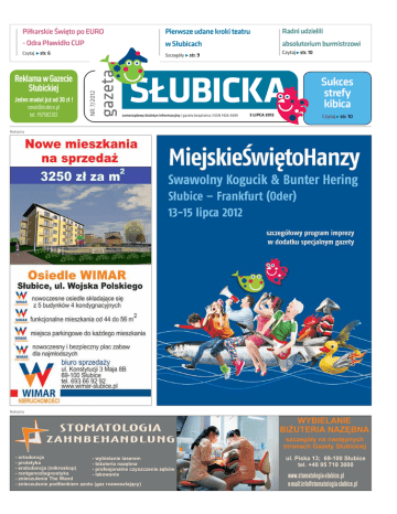 Piłkarskie Święto po EURO - Odra Pławidło CUP str. 6 Reklama w Gazecie Słubickiej Jeden moduł już od 30 zł ! [email protected] tel. 957582202 Radni udzielili w Słubicach absolutorium burmistrzowi Szczegóły NR 7/2012 Czytaj Pierwsze udane kroki teatru Czytaj str. 10 str. 9 Sukces strefy kibica samorządowy biuletyn informacyjny | gazeta bezpłatna | ISSN 1426-5699 5 LIPCA 2012 Czytaj str. 10 Reklama Reklama WYBIELANIE BI¯UTERIA NAZÊBNA szczegó³y na nastêpnych stronach Gazety S³ubickiej - ortodoncja - wybielanie laserem - protetyka - bi¿uteria nazêbna - endodoncja (mikroskop) - profesjonalne czyszczenie zêbów - rentgenodiagnostyka - lakowanie - znieczulenie The Wand - znieczulenie podtlenkiem azotu (gaz rozweselaj¹cy) ul. Piska 13; 69-100 S³ubice tel. +48 95 718 3000 gazeta SŁUBICKA 2 7/2012 5 LIPCA Drodzy słubiczanie, szanowni Goście Od 13 lipca przez trzy dni po raz kolejny wspólnie z Frankfurtem nad Odrą obchodzić będziemy Miejskie Święto Hanzy Swawolny Kogucik – Kolorowy Śledź. Jak każdego roku czeka na wszystkich wiele atrakcji i jestem przekonany, że każdy znajdzie coś dla siebie. W piątek 13 lipca rozpoczniemy zabawę podczas uroczystego otwarcia na moście. Tradycyjnie nie zabraknie uczty ze śledziem, ogórkiem i smalcem w rolach głównych. Wieczór uświetni pokaz fajerwerków, który podziwiać będzie można z obu nadodrzańskich promenad. Sobota upływać będzie pod hasłem integracji pokoleniowej i narodowej. Tego dnia po raz pierwszy wspólnie z Słubicko -Frankfurckim Centrum Kooperacji przygotowujemy Doroczne Spotkanie Mieszkań- ców. Nie zabraknie wielu atrakcji dla dzieci i dorosłych, a nad całością czuwać będzie lubiany prezenter Steffen Möller. Wieczorem na scenie na placu Bohaterów zabawę uświetnią występy Jagody Macewicz, znanej z programu Bitwa na głosy, niezapomnianego Andrzeja Rosiewicza i gwiazdy wieczoru – zespołu KOMBI. Po takim wstępie szaloną noc zapewni Buenos Ares. i DJ Cashanka. Niedziela będzie dniem dla aktywności i formy. Dlatego wspólnie z Słubickim Ośrodkiem Sportu Program Miejskiego Święta Hanzy w Słubicach piątek, 13 lipca: 18.00 na moście barwna inauguracja, 24:00 pokaz fajerwerków na Odrze Sobota, 14 lipca: 12:00-19:00 scena na deptaku I Doroczne Spotkanie Mieszkańców – muzyka, quizy, rozmowy, atrakcje dla dzieci; moderuje Steffen Möller Pl. Bohaterów: 18:00 Jagoda Macewicz 19:30 Andrzej Rosiewicz 21:00 Kombii 22:50 Buenos Ares 24:00 DJ Cashanka i Rekreacji przygotowanych zostało wiele atrakcji sportowych, w wśród nich nauka gry w golfa, turniej siatkówki plażowej i mecz piłki nożnej reprezentacji urzędów miejskich ze Słubic i Frankfurtu. Gorąco zachęcam do wspólnej zabawy i oczarowania się klimatem Miejskiego Święta Hanzy Swawolny Kogucik – Kolorowy Śledź 2012. Burmistrz Słubic Tomasz Ciszewicz Program Miejskiego Święta Hanzy we Frankfurcie nad Odrą Piątek 13 lipca Sobota 14 Lipca Godz. 18.00 Wspólne otwarcie Godz. 11.00-15.00 Występy na moście miejskim sceniczne - 50 m stół a na nim 1000 - polsko-niemiecki chór bułek ze śledziami, ogórkami i - artyści z Polski i Niemiec smalcem! Godz. 18.30 Konkurs zespołów Brandenburskiego Stowarzyszenia Muzyki Rokowej (Scena na lewo od mostu przy Oderspeicher) Godz. 20.00 muzyka na żywo (północna część Holzmarkt, po lewo od mostu) „Najlepsze z Bawarii od Reggae do Rocka Godz. 19.00 Zawody wioślarskie Uniwersytetu Europejskiego Vidrina (Po prawej stronie mostu na wysokości hali koncertowej) - udział biorą przedstawiciele studenci i docenci trzech kierunków -Bürgermeista & die Gemeinderäte / Los Dos y Compa eros Godz. 20.00-0.00 Muzyka na żywo (Rynek przed Ratuszem) - Jürgen Drews - SIX Godz. 0.00 Pokaz sztucznych ognii Godz. 20.00- 23.00 muzyka na żywo (scena na Rynku przy Ratuszu) - Los Colorados (Polka Band z Ukrainy) - Chris Norman Niedziala 15 Lipca Godz. 11.00-18.00 konkurs zespołów Brandenburskiego Stowarzyszenia Muzyki Rockowej (scena przy Oderspeicher, po lewej od mostu) Godz. 12.30 Występy polsko-niemieckich chórów (scena na Rynku przy Rartuszu) Godz. 15.00 Plenerowy konzert Brandenburskiej Orkiestry z Frankfurtu nad Odrą (scena na Rynku przy Ratuszu) Godz. 18.00 koncert kończący - Max Mutzke Ponad to gry i zabawy dla dzieci i wiele atrakcji na miejscu w różnych stoiskach wzdłuż promenady i na rynku pod Ratuszem! Szczegółowy program na www.smok.slubice.pl oraz www.bunterhering.de gazeta SŁUBICKA 7/2012 5 LIPCA 3 Reklama Otwarcie z fajerwerkami Wspólne świętowanie zaczynamy tradycyjnie już otwarciem na moście granicznym połączonym z programem artystycznym, degustacją charakterystycznych potraw i odbiciem beczki piwa. O północy zapraszamy na barwny pokaz fajerwerków. Reklama Artyści z grupy teatralnej Helmnot uświetnią otwarcie imprezy. które poruszać się będą pomiędzy publicznością. W wykonaniu niemieckiego teatru Helmnot obejrzymy niewiarygodnie poetycką prezentację. Uroczyste otwarcie na moście zwieńczy wyścig osad wioślarskich Uniwersytetu Viadrina. O północy natomiast podziwiać będzie można efektowny pokaz fajerwerków. W tym roku sztuczne ognie odpalone zostaną z wyspy Ziegenwerder, najlepszy widok słubiczanie będą mieli zatem z mostu. fot.Jana Schütze Mieszkańców obu miast i ich gości zapraszamy do wspólnego świętowania w piątek o 18.00. Przy pięćdziesięciometrowym stole skosztować będzie można jak zwykle m.in. przepysznych bułek ze śledziem. Po oficjalnym powitaniu włodarzy obu miast nastąpi także odbicie beczki z piwem ufundowanej tradycyjnie przez frankfurcki browar. Nie zabraknie oczywiście atrakcji artystycznych. W tym roku podczas inauguracji podziwiać będzie można gigantyczne, 5-metrowe figury, Tradycyjnie już w pierwszy dzień Miejskiego Święta Hanzy wspólnie odkorkujemy pierwszą beczkę piwa. gazeta SŁUBICKA 4 Steffen Möller zabawi słubicką publiczność Steffen Möller bę
