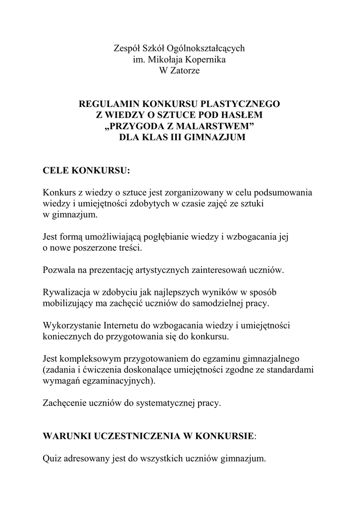 Zespół Szkół Ogólnokształcących im. Mikołaja Kopernika W Zatorze REGULAMIN KONKURSU PLASTYCZNEGO Z WIEDZY O SZTUCE POD HASŁEM „PRZYGODA Z MALARSTWEM” DLA KLAS III GIMNAZJUM CELE KONKURSU: Konkurs z wiedzy o sztuce jest zorganizowany w celu podsumowania wiedzy i umiejętności zdobytych w czasie zajęć ze sztuki w gimnazjum. Jest formą umożliwiającą pogłębianie wiedzy i wzbogacania jej o nowe poszerzone treści. Pozwala na prezentację artystycznych zainteresowań uczniów. Rywalizacja w zdobyciu jak najlepszych wyników w sposób mobilizujący ma zachęcić uczniów do samodzielnej pracy. Wykorzystanie Internetu do wzbogacania wiedzy i umiejętności koniecznych do przygotowania się do konkursu. Jest kompleksowym przygotowaniem do egzaminu gimnazjalnego (zadania i ćwiczenia doskonalące umiejętności zgodne ze standardami wymagań egzaminacyjnych). Zachęcenie uczniów do systematycznej pracy. WARUNKI UCZESTNICZENIA W KONKURSIE: Quiz adresowany jest do wszystkich uczniów gimnazjum. W pierwszym etapie biorą udział wszyscy uczniowie z klas trzecich. W drugim ostatnim etapie uczniowie, którzy uzyskali najlepsze wyniki to znaczy po cztery osoby z każdej klasy. Uczestnicy w obu etapach zobowiązani są do samodzielnej pracy. Za brak samodzielności uczestnik zostaje zdyskwalifikowany. PRZEBIEG KONKURSU: Pierwszy etap- napisanie testu z zakresu materiału dotyczącego historii malarstwa europejskiego od epoki średniowiecza do czasów najnowszych. Drugi etap - analiza wylosowanego obrazu; * uczeń określa styl, kierunek lub epokę w jakiej dzieło zostało namalowane, * omawia w trzech zdaniach twórcę, *dokonuje analizy obrazu pod kątem kompozycji, kolorystyki a także wyrazu dzieła, tematu i wyrazu emocjonalnego. Trzeci etap- uczniowie, którzy zdobyli największą ilość punktów przechodzą do finału którym podobnie jak w etapie pierwszym piszą test i odpowiadają ustnie na wylosowane pytania. TERMINY: Pierwszy i drugi etap konkursu odbędzie się w dniach od 19 kwietnia do 22 kwietnia 2010 roku. Trzeci etap odbędzie się 23 kwietnia 2010 roku godzinie 7.10. O miejscu konkursu uczniowie zostaną poinformowani wcześniej. MATERIAŁY: Zestaw planszy prezentujących malarstwo europejskie wydawnictwa MAC Edukacja, czasopisma ”Victor” oraz „Wielcy Malarze” „Sztuka świata”