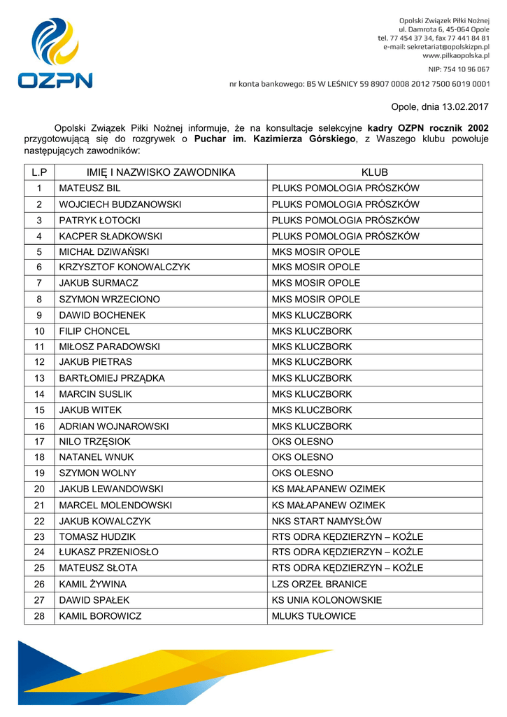 Opole, dnia 13.02.2017 Opolski Związek Piłki Nożnej informuje, że na konsultacje selekcyjne kadry OZPN rocznik 2002 przygotowującą się do rozgrywek o Puchar im. Kazimierza Górskiego, z Waszego klubu powołuje następujących zawodników: L.P IMIĘ I NAZWISKO ZAWODNIKA KLUB 1 MATEUSZ BIL PLUKS POMOLOGIA PRÓSZKÓW 2 WOJCIECH BUDZANOWSKI PLUKS POMOLOGIA PRÓSZKÓW 3 PATRYK ŁOTOCKI PLUKS POMOLOGIA PRÓSZKÓW 4 KACPER SŁADKOWSKI PLUKS POMOLOGIA PRÓSZKÓW 5 MICHAŁ DZIWAŃSKI MKS MOSIR OPOLE 6 KRZYSZTOF KONOWALCZYK MKS MOSIR OPOLE 7 JAKUB SURMACZ MKS MOSIR OPOLE 8 SZYMON WRZECIONO MKS MOSIR OPOLE 9 DAWID BOCHENEK MKS KLUCZBORK 10 FILIP CHONCEL MKS KLUCZBORK 11 MIŁOSZ PARADOWSKI MKS KLUCZBORK 12 JAKUB PIETRAS MKS KLUCZBORK 13 BARTŁOMIEJ PRZĄDKA MKS KLUCZBORK 14 MARCIN SUSLIK MKS KLUCZBORK 15 JAKUB WITEK MKS KLUCZBORK 16 ADRIAN WOJNAROWSKI MKS KLUCZBORK 17 NILO TRZĘSIOK OKS OLESNO 18 NATANEL WNUK OKS OLESNO 19 SZYMON WOLNY OKS OLESNO 20 JAKUB LEWANDOWSKI KS MAŁAPANEW OZIMEK 21 MARCEL MOLENDOWSKI KS MAŁAPANEW OZIMEK 22 JAKUB KOWALCZYK NKS START NAMYSŁÓW 23 TOMASZ HUDZIK RTS ODRA KĘDZIERZYN – KOŹLE 24 ŁUKASZ PRZENIOSŁO RTS ODRA KĘDZIERZYN – KOŹLE 25 MATEUSZ SŁOTA RTS ODRA KĘDZIERZYN – KOŹLE 26 KAMIL ŻYWINA LZS ORZEŁ BRANICE 27 DAWID SPAŁEK KS UNIA KOLONOWSKIE 28 KAMIL BOROWICZ MLUKS TUŁOWICE 29 JAKUB GALLA MLUKS TUŁOWICE 30 KACPER KOTELUK MLUKS TUŁOWICE Konsultacja odbędzie się 26.02.2017r. (niedziela) o godz.18:00 na obiektach Centrum Sportu w Opolu, przy ul. Wandy Rutkiewicz 10. Zbiórka zawodników o godz.17:00. Na konsultacje należy zabrać ze sobą: strój piłkarski ( koszulka, spodenki, getry, dres, ochraniacze), ważną kartę zdrowia, buty piłkarskie na nawierzchnię naturalną i sztuczną. W przypadku niemożności przybycia powołanego zawodnika na daną akcję szkoleniową OZPN z przyczyn obiektywnych (choroba, kontuzja, itp.) klub ma obowiązek powiadomić trenera reprezentacji OZPN drogą telefoniczną oraz za pośrednictwem wiadomości e – mail na adres e – mail [email protected] niezwłocznie, nie później niż dzień przed rozpoczęciem danej akcji szkoleniowej OZPN. Trenerzy zespołu: Ireneusz Kwok, tel. 508-205-455 Mateusz Flegel, tel. 510-586-930 Trener koordynator: Filip Sikorski, tel. 533-474-766, e-mail: [email protected]