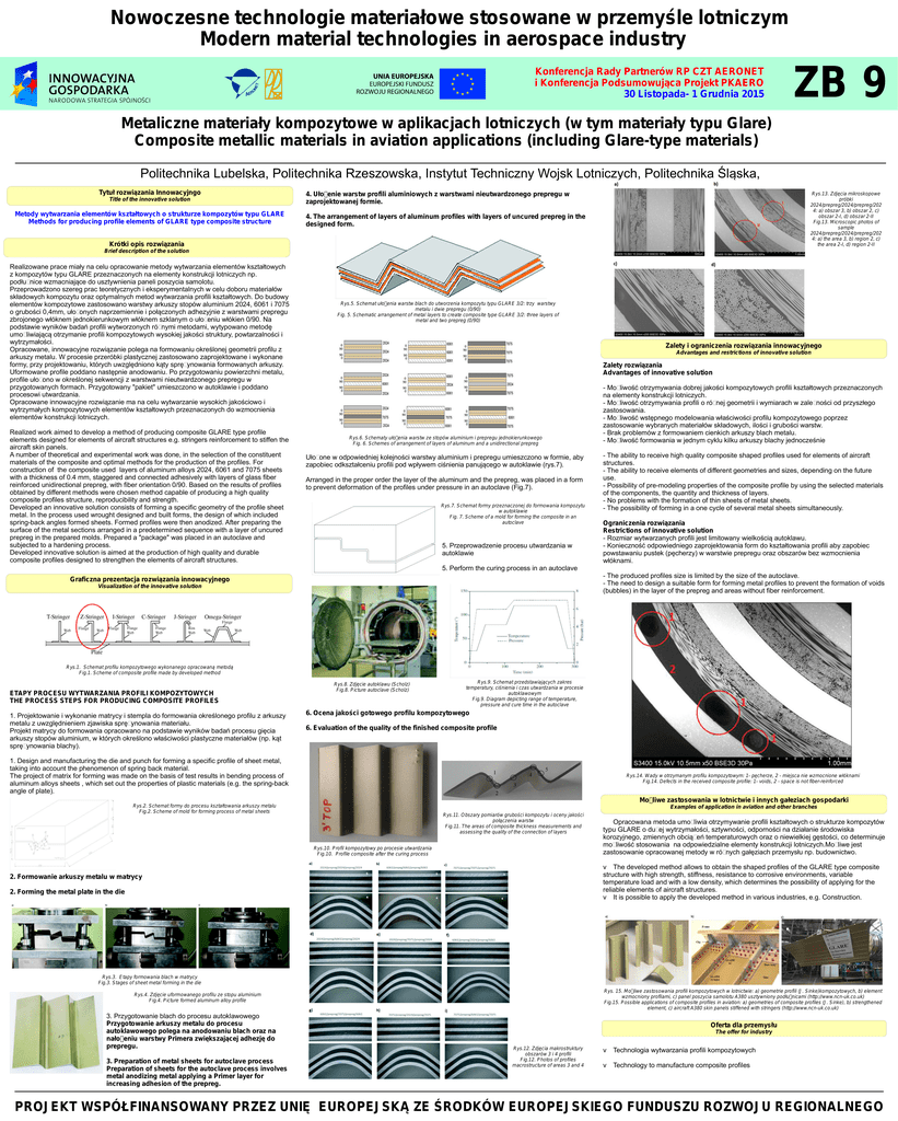 Nowoczesne technologie materiałowe stosowane w przemyśle lotniczym Modern material technologies in aerospace industry Konferencja Rady Partnerów RP CZT AERONET i Konferencja Podsumowująca Projekt PKAERO 30 Listopada- 1 Grudnia 2015 ZB 9 Metaliczne materiały kompozytowe w aplikacjach lotniczych (w tym materiały typu Glare) Composite metallic materials in aviation applications (including Glare-type materials) Politechnika Lubelska, Politechnika Rzeszowska, Instytut Techniczny Wojsk Lotniczych, Politechnika Śląska, Tytuł rozwiązania Innowacyjngo Title of the innovative solution Metody wytwarzania elementów kształtowych o strukturze kompozytów typu GLARE Methods for producing profile elements of GLARE type composite structure 4. Ułożenie warstw profili aluminiowych z warstwami nieutwardzonego prepregu w zaprojektowanej formie. Rys.13. Zdjęcia mikroskopowe próbki 2024/prepreg/2024/prepreg/202 4: a) obszar 3, b) obszar 2, c) obszar 2-I, d) obszar 2-II Fig.13. Microscopic photos of sample 2024/prepreg/2024/prepreg/202 4: a) the area 3, b) region 2, c) the area 2-I, d) region 2-II 4. The arrangement of layers of aluminum profiles with layers of uncured prepreg in the designed form. Krótki opis rozwiązania Brief description of the solution Realizowane prace miały na celu opracowanie metody wytwarzania elementów kształtowych z kompozytów typu GLARE przeznaczonych na elementy konstrukcji lotniczych np. podłużnice wzmacniające do usztywnienia paneli poszycia samolotu. Przeprowadzono szereg prac teoretycznych i eksperymentalnych w celu doboru materiałów składowych kompozytu oraz optymalnych metod wytwarzania profili kształtowych. Do budowy elementów kompozytowe zastosowano warstwy arkuszy stopów aluminium 2024, 6061 i 7075 o grubości 0,4mm, ułożonych naprzemiennie i połączonych adhezyjnie z warstwami prepregu zbrojonego włóknem jednokierunkowym włóknem szklanym o ułożeniu włókien 0/90. Na podstawie wyników badań profili wytworzonych różnymi metodami, wytypowano metodę umożliwiającą otrzymanie profili kompozytowych wysokiej jakości struktury, powtarzalności i wytrzymałości. Opracowane, innowacyjne rozwiązanie polega na formowaniu określonej geometrii profilu z arkuszy metalu. W procesie przeróbki plastycznej zastosowano zaprojektowane i wykonane formy, przy projektowaniu, których uwzględniono kąty sprężynowania formowanych arkuszy. Uformowane profile poddano następnie anodowaniu. Po przygotowaniu powierzchni metalu, profile ułożono w określonej sekwencji z warstwami nieutwardzonego prepregu w przygotowanych formach. Przygotowany "pakiet" umieszczono w autoklawie i poddano procesowi utwardzania. Opracowane innowacyjne rozwiązanie ma na celu wytwarzanie wysokich jakościowo i wytrzymałych kompozytowych elementów kształtowych przeznaczonych do wzmocnienia elementów konstrukcji lotniczych. Realized work aimed to develop a method of producing composite GLARE type profile elements designed for elements of aircraft structures e.g. stringers reinforcement to stiffen the aircraft skin panels. A number of theoretical and experimental work was done, in the selection of the constituent materials of the composite and optimal methods for the production of the profiles. For construction of the composite used layers of aluminum alloys 2024, 6061 and 7075 sheets with a thickness of 0.4 mm, staggered and connected adhesively with layers of glass fiber reinforced unidirectional prepreg, with fiber orientation 0/90. Based on the results of profiles obtained by different methods were chosen method capable of producing a high quality composite profiles structure, reproducibility and strength. Developed an innovative solution consists of forming a specific geometry of the profile sheet metal. In the process used wrought designed and built forms, the design of which included spring-back angles formed sheets. Formed profiles were then anodized. After preparing the surface of the metal sections arranged in a predetermined sequence with a layer of uncured prepreg in the prepared molds. Prepared a "package" was placed in an autoclave and subjected to a hardening process. Developed innovative solution is aimed at the production of high quality and durable composite profiles designed to strengthen the elements of aircraft structures. Rys.5. Schemat ułożenia warstw blach do utworzenia kompozytu typu GLARE 3/2: trzy warstwy metalu i dwie prepregu (0/90) Fig. 5. Schematic arrangement of metal layers to create composite type GLARE 3/2: three layers of metal and two prepreg (0/90) Zalety i ograniczenia rozwiązania innowacyjnego Advantages and restrictions of innovative solution Zalety rozwiązania Advantages of innovative solution Rys.6. Schematy ułożenia warstw ze stopów aluminium i prepregu jednokierunkowego Fig. 6. Schemes of arrangement of layers of aluminum and a unidirectional prepreg Ułożone w odpowiedniej kolejności warstwy aluminium i prepregu umieszczono w formie, aby zapobiec odkształceniu profili pod wpływem ciśnienia panującego w autoklawie (rys.7). Arranged in the proper order the layer of the aluminum and the prepreg, was placed in a form to prevent deformation of the profiles under pressure in an autoclave (Fig.7). Rys.7. Schemat formy przeznaczonej do formowania kompozytu w autoklawie Fig. 7. Scheme of a mold for forming the composite in an autoclave 5. Przeprowadzenie procesu utwardzania w autoklawie - Możliwość otrzymywania dobrej jakości kompozytowych profili kształtowych przeznaczonych na elementy konstrukcji lotniczych. - Możliwość otrzymywania profili o różnej geometrii i wymiarach w zależności od przyszłego zastosowania. - Możliwość wstępnego modelowania właściwości profilu kompozytowego poprzez zastosowanie wybranych materiałów składowych, ilości i grubości warstw. - Brak problemów z formowaniem cienkich arkuszy blach metalu. - Możliwość formowania w jednym cyklu kilku arkuszy blachy jednocześnie