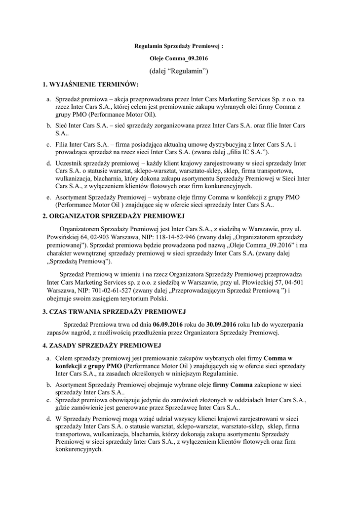 Regulamin Sprzedaży Premiowej : Oleje Comma_09.2016 (dalej “Regulamin”) 1. WYJAŚNIENIE TERMINÓW: a. Sprzedaż premiowa – akcja przeprowadzana przez Inter Cars Marketing Services Sp. z o.o. na rzecz Inter Cars S.A., której celem jest premiowanie zakupu wybranych olei firmy Comma z grupy PMO (Performance Motor Oil). b. Sieć Inter Cars S.A. – sieć sprzedaży zorganizowana przez Inter Cars S.A. oraz filie Inter Cars S.A.. c. Filia Inter Cars S.A. – firma posiadająca aktualną umowę dystrybucyjną z Inter Cars S.A. i prowadząca sprzedaż na rzecz sieci Inter Cars S.A. (zwana dalej „filia IC S.A.”). d. Uczestnik sprzedaży premiowej – każdy klient krajowy zarejestrowany w sieci sprzedaży Inter Cars S.A. o statusie warsztat, sklepo-warsztat, warsztato-sklep, sklep, firma transportowa, wulkanizacja, blacharnia, który dokona zakupu asortymentu Sprzedaży Premiowej w Sieci Inter Cars S.A., z wyłączeniem klientów flotowych oraz firm konkurencyjnych. e. Asortyment Sprzedaży Premiowej – wybrane oleje firmy Comma w konfekcji z grupy PMO (Performance Motor Oil ) znajdujące się w ofercie sieci sprzedaży Inter Cars S.A.. 2. ORGANIZATOR SPRZEDAŻY PREMIOWEJ Organizatorem Sprzedaży Premiowej jest Inter Cars S.A., z siedzibą w Warszawie, przy ul. Powsińskiej 64, 02-903 Warszawa, NIP: 118-14-52-946 (zwany dalej „Organizatorem sprzedaży premiowanej”). Sprzedaż premiowa będzie prowadzona pod nazwą „Oleje Comma_09.2016” i ma charakter wewnętrznej sprzedaży premiowej w sieci sprzedaży Inter Cars S.A. (zwany dalej „Sprzedażą Premiową”). Sprzedaż Premiową w imieniu i na rzecz Organizatora Sprzedaży Premiowej przeprowadza Inter Cars Marketing Services sp. z o.o. z siedzibą w Warszawie, przy ul. Płowieckiej 57, 04-501 Warszawa, NIP: 701-02-61-527 (zwany dalej „Przeprowadzającym Sprzedaż Premiową ”) i obejmuje swoim zasięgiem terytorium Polski. 3. CZAS TRWANIA SPRZEDAŻY PREMIOWEJ Sprzedaż Premiowa trwa od dnia 06.09.2016 roku do 30.09.2016 roku lub do wyczerpania zapasów nagród, z możliwością przedłużenia przez Organizatora Sprzedaży Premiowej. 4. ZASADY SPRZEDAŻY PREMIOWEJ a. Celem sprzedaży premiowej jest premiowanie zakupów wybranych olei firmy Comma w konfekcji z grupy PMO (Performance Motor Oil ) znajdujących się w ofercie sieci sprzedaży Inter Cars S.A., na zasadach określonych w niniejszym Regulaminie. b. Asortyment Sprzedaży Premiowej obejmuje wybrane oleje firmy Comma zakupione w sieci sprzedaży Inter Cars S.A.. c. Sprzedaż premiowa obowiązuje jedynie do zamówień złożonych w oddziałach Inter Cars S.A., gdzie zamówienie jest generowane przez Sprzedawcę Inter Cars S.A.. d. W Sprzedaży Premiowej mogą wziąć udział wszyscy klienci krajowi zarejestrowani w sieci sprzedaży Inter Cars S.A. o statusie warsztat, sklepo-warsztat, warsztato-sklep, sklep, firma transportowa, wulkanizacja, blacharnia, którzy dokonają zakupu asortymentu Sprzedaży Premiowej w sieci sprzedaży Inter Cars S.A., z wyłączeniem klientów flotowych oraz firm konkurencyjnych. e. Organizator powoła Komisję Sprzedaży Premiowej, w skład której wchodzą następujące osoby: Przedstawiciel Przeprowadzającego Konkurs – Witold Siedlecki Przedstawiciel Przeprowadzającego Konkurs – Małgorzata Olejniczak f. Komisja Sprzedaży Premiowej nadzoruje zgodność wyłonienia laureatów zgodnie z niniejszym Regulaminem. g. Prace Komisji Konkursowej są niejawne. h. Platformą informacyjną w ramach Sprzedaży Premiowej jest strona internetowa www.intercars.com.pl , która jest obsługiwana przez Przeprowadzającego Konkurs. i. Informacje o organizacji Konkursu i jego przebiegu będą emitowane (ogłaszane) za pośrednictwem środków masowego przekazu, w tym: akcji mailingowej, strony internetowej. j. Nagrody w Sprzedaży Premiowej będą przyznawane zgodnie z zasadami ustalonymi poniżej. k. Nieterminowe płatności za zakupy asortymentu Sprzedaży Premiowej lub przeterminowane należności wobec Organizatora Sprzedaży Premiowej, powodują wykluczenie Uczestnika z udziału w Sprzedaży Premiowej. 5. NAGRODY a. Za jednorazowy zakup wybranych olei Comma w konfekcji z grupy PMO (Performance Motor Oil) za min. 300 zł netto w okresie trwania promocji, klient ma możliwość zakupu konewki za 1 zł netto. Zestawienie indeksów towarów objętych promocją znajduje się w załączniku nr 1 do Regulaminu Promocji. b. Liczba zestawów nagród przyznanych Uczestnikowi Sprzedaży Premiowej zależy od ostatecznej ilości zakupionego towaru, dokonanych w czasie trwania Sprzedaży Premiowej c. Promocja dostępna jest dla klientów w oddziałach Inter Cars S.A. oraz w tzw. sprzedaży przez IC KATALOG ONLINE. d. Zakupy asortymentu Sprzedaży Premiowej dokonanej przez klienta nie sumują się przez cały okres obowiązywania Sprzedaży Premiowej. e. Organizator Sprzedaży Premiowej zastrzega że wszelkie należności podatkowe które mogą zaistnieć w związku z przekazaniem nagród pozostają po stronie Laureata Sprzedaży Premiowej. 6. ODPOWIEDZIALNOŚĆ ORGANIZATORA Odpowiedzialność Organizatora Sprzedaży Premiowej wobec Uczestników z tytułu Sprzedaży Premiowej, w żadnym przypadku nie przekroczy wartości nagród określonych w niniejszym Regulaminie. 7. REKLAMACJE I ROSZCZENIA a. Uczestnikowi przysługuje prawo złożenia reklamacji. b. Reklamacje przyjmowane będą wyłącznie w trybie korespondencji przesłanej listem poleconym na adres Przeprowadzającego Sprzedaż Premiową z dopiskiem „Oleje Comma_09.2016”, nie później niż do dnia 14.10.2016 r., przy czym o dotrzymaniu terminu będzie decydować data stempla pocztowego. Reklamacja zgłoszona po tym terminie nie zostanie rozpatrzona. c. Reklamacja powinna być sporządzona na piśmie i zawierać imię, nazwisko i dokładny adres Uczestnika, jak również dokładny opis przyczyny reklamacji. d. Przeprowadzający Sprzedaż Premiową rozpatrzy reklamację w terminie 7 (siedmiu) dni rob