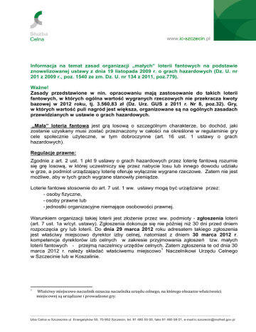 www.ic-szczecin.pl Informacja na temat zasad organizacji „małych” loterii fantowych na podstawie znowelizowanej ustawy z dnia 19 listopada 2009 r. o grach hazardowych (Dz. U. nr 201 z 2009 r., poz. 1540 ze zm. Dz. U. nr 134 z 2011, poz.779). Ważne! Zasady przedstawione w nin. opracowaniu mają zastosowanie do takich loterii fantowych, w których ogólna wartość wygranych rzeczowych nie przekracza kwoty bazowej w 2012 roku, tj. 3.560,83 zł (Dz. Urz. GUS z 2011 r. Nr 8, poz.32). Gry, w których wartość puli nagród jest większa, organizowane są na ogólnych zasadach przewidzianych w ustawie o grach hazardowych. „Mała” loteria fantowa jest grą losową o szczególnym charakterze, bo dochód, jaki zostanie uzyskany musi zostać przeznaczony w całości na określone w regulaminie gry cele społecznie użyteczne, w tym dobroczynne (art. 16 ust. 1 ustawy o grach hazardowych). Regulacje prawne: Zgodnie z art. 2 ust. 1 pkt 9 ustawy o grach hazardowych przez loterię fantową rozumie się grę losową, w której uczestniczy się przez nabycie losu lub innego dowodu udziału w grze, a podmiot urządzający loterię oferuje wyłącznie wygrane rzeczowe. Zatem nie jest możliwe, aby w tych grach wygrane stanowiły pieniądze. Loterie fantowe stosownie do art. 7 ust. 1 ww. ustawy mogą być urządzane przez: - osoby fizyczne, - osoby prawne lub - jednostki organizacyjne niemające osobowości prawnej. Warunkiem organizacji takiej loterii jest złożenie przez ww. podmioty - zgłoszenia loterii (art. 7 ust. 1a w/cyt. ustawy). Zgłoszenia dokonuje się nie później niż 30 dni przed dniem rozpoczęcia gry lub loterii. Do dnia 29 marca 2012 roku adresatem takiego zgłoszenia jest właściwy miejscowo dyrektor izby celnej, natomiast z dniem 30 marca 2012 r. kompetencje dyrektorów izb celnych w zakresie przyjmowania zgłoszeń tzw. małych loterii fantowych - przejmą naczelnicy urzędów celnych. Zatem zgłoszenia te od dnia 30 marca 2012 r. należy składać właściwemu miejscowo1 Naczelnikowi Urzędu Celnego w Szczecinie lub w Koszalinie. 1 Właściwy miejscowo naczelnik oznacza naczelnika urzędu celnego, na którego obszarze właściwości miejscowej są urządzane i prowadzone gry. Izba Celna w Szczecinie ul. Energetyków 55, 70-952 Szczecin, tel. 91 480 55 00, faks 91 480 58 01, e-mail:[email protected] Zgłoszenie loterii fantowej, powinno zawierać stosownie do art. 38 ust. 2 ustawy o grach hazardowych: 1) określenie rodzaju gry; 2) nazwę i status prawny podmiotu zgłaszającego, a w przypadku spółek handlowych również numer w Krajowym Rejestrze Sądowym; 3) dane osobowe (imiona, nazwiska, obywatelstwo, miejsce zamieszkania, rodzaj oraz serię i numer dokumentu tożsamości) osób zarządzających podmiotem oraz reprezentujących podmiot zgłaszający; 4) określenie obszaru, na którym planowane jest urządzenie gry; 5) określenie czasu, w którym planuje się urządzenie gry; 6) dokładne wyznaczenie celu, na który przeznacza się dochód z urządzanej gry; 7) określenie planowanej wielkości sprzedaży losów; 8) zobowiązanie wypłacalności nagród; 9) regulamin gry; 10) oświadczenie o legalności źródeł pochodzenia środków finansowych lub innego majątku przeznaczonego na urządzenie loterii fantowej; 11) oświadczenie o niezaleganiu z zapłatą podatków stanowiących dochód budżetu państwa, należności celnych oraz składek na ubezpieczenia społeczne oraz ubezpieczenie zdrowotne; 12) wzór losu, innego dowodu udziału w grze; 13) oświadczenie osób fizycznych zarządzających podmiotem oraz reprezentujących podmiot zgłaszający, że nie były skazane za umyślne przestępstwo lub umyślne przestępstwo skarbowe. Do zgłoszenia loterii fantowej, w których wartość puli wygranych nie przekracza kwoty bazowej, dołącza się oświadczenie osoby nadzorującej oraz osoby bezpośrednio prowadzącej tę grę o znajomości przepisów ustawy w zakresie loterii fantowych (art. 38 ust. 3 ustawy). Jednym z elementów zgłoszenia loterii fantowej jest regulamin gry, który powinien dokładnie określać zasady urządzanej gry, uwzględniając w tym zakresie postanowienia ustawy o grach hazardowych, w szczególności te dotyczące ochrony interesów osób uczestniczących w grze. Ustawa wymienia elementy regulamin gry (art. 61 ust. 2 ustawy): 1) nazwę gry; 2) nazwę podmiotu urządzającego grę; 3) wskazanie organu wydającego zezwolenie (przy czym w przypadku loterii fantowej, w których wartość puli wygranych nie przekracza kwoty bazowej będzie to organ, do którego kierowane jest zgłoszenie); 4) obszar, na którym będzie urządzana gra, oraz miejsce i termin losowania nagród; 2 www.ic-szczecin.pl 5) 6) 7) 8) 9) 10) 11) 12) 13) 14) liczbę losów przeznaczonych do sprzedaży; cenę jednego losu; sposób prowadzenia gry; sposób zapewnienia prawidłowości urządzania gry; terminy rozpoczęcia i zakończenia sprzedaży losów; cel społecznie użyteczny, w szczególności dobroczynny, na który zostanie przeznaczony dochód z gry; sposób i termin ogłaszania wyników; miejsce i termin wydawania wygranych; tryb i terminy rozpatrywania reklamacji i zgłaszania roszczeń; liczbę i rodzaj fantów przeznaczonych na nagrody oraz procentowe określenie wartości fantów w stosunku do łącznej ceny przeznaczonych do sprzedaży losów. Podkreślić również należy, że wartość wygranej w grach hazardowych nie może być niższa od ceny losu lub innego dowodu udziału w grze albo kwoty wpłaconej stawki (art. 18 ust. 1 ustawy). Oznacza to, że w loterii fantowej, wygrana rzeczowa nie może być mniejsza niż cena losu lub innego dowodu udziału w grze. Dodatkowo zgodnie z art. 17 ust.1 ustawy podmiot urządzający „małą” loterię fantową jest obowiązany zabezpieczyć losy lub inne dowody udziału w takiej grze przed sfałszowaniem oraz przedwczesnym odczytaniem wyniku gry, w szczególności przed prześwietleniem, otwarciem lub zdrapaniem farb