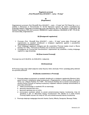 Regulamin promocji „First Minute® Zima 2016/2017 – narty – VI etap” §1 [Organizator] Organizatorem promocji „First Minute® Zima 2016/2017 – narty – VI etap” jest TUI Poland Sp. z o.o. z siedzibą w Warszawie, ul. Domaniewska 41, 02-672 Warszawa wpisana do rejestru przedsiębiorców Krajowego Rejestru Sądowego prowadzonego przez Sąd Rejonowy dla m.st. Warszawy w Warszawie, XIII Wydział Gospodarczy KRS pod numerem 0000083435, kapitał zakładowy 200.000,00 zł, NIP: 779-20-48522 zwana dalej „Organizatorem”. §2 [Dostępność regulaminu] 1. Promocja „First Minute® Zima 2016/2017 – narty – VI etap” zwana dalej „Promocją” jest organizowana na zasadach określonych w niniejszym regulaminie zgodnie z powszechnie obowiązującymi przepisami prawa. 2. Treść niniejszego regulaminu dostępna jest dla uczestników Promocji między innymi w Biurze Podróży TU I TAM – TUI Centrum Podróży oraz na stronie www.tuitam.pl. 3. Przystąpienie do Promocji jest równoznaczne z zapoznaniem się uczestnika z treścią niniejszego regulaminu i jego akceptacją. §3 [Czas trwania Promocji] Promocja trwa od 21.06.2016r. do 30.06.2016 r. (włącznie). §4 [Uczestnicy] W Promocji mogą wziąć udział wyłącznie osoby fizyczne, które ukończyły 18 lat i posiadają pełną zdolność do czynności prawnych. §5 [Zasady uczestnictwa w Promocji] 1. Promocja polega na przyznaniu na zasadach określonych w niniejszym regulaminie Klientowi, który zawarł umowę o świadczenie usług turystycznych z Organizatorem w biurze podróży ze znakiem TUI tj.: np. w Biurze Podróży TU I TAM - TUI Centrum Podróży lub na stronie www.tuitam.pl w okresie trwania Promocji na imprezę turystyczną z dojazdem własnym (wakacje samochodem) na sezon Zima 2016/2017: a. rabatu procentowego w wysokości 5% na rezerwację; b. gwarancji niezmienności ceny; c. gwarancji najniższej ceny na rynku; d. promocyjnej wysokości zaliczki na poczet zarezerwowanej imprezy turystycznej, innej niż określona w pkt. 2.1 Warunków Imprez Turystycznych TUI. Zaliczka ta w czasie trwania Promocji, będzie wynosić nie mniej niż 10% ceny zarezerwowanej imprezy turystycznej. 2. Promocja obejmuje następujące kierunki: Austria, Czechy, Włochy, Szwajcaria, Słowacja, Polska. Strona 1 z 3 3. Zasady udzielania rabatu procentowego: a. b. c. d. e. Warunkiem skorzystania z Promocji jest założenie rezerwacji dla min. 1 osoby pełnopłatnej z długością pobytu min. 1 noc. Wartość rabatu przyznana Promocją odliczana jest od ceny podstawowej wycieczki dla min. 1 osoby. Dzieci do 2. roku życia nie są objęte Promocją. Rabat nie dotyczy dodatkowych usług, tj.: dodatkowe ubezpieczenie, Gwarancja Niezmienności Ceny Gratis, przesyłka dokumentów podróży kurierem. Rabat będzie udzielony wyłącznie w postaci określonej w niniejszym regulaminie, bez możliwości wypłaty równowartości w gotówce lub zamiany na inny rabat. 4. Zasady udzielania gwarancji niezmienności ceny: a. Gwarancja ta oznacza, że cena zarezerwowanej imprezy turystycznej w okresie Promocji nie ulegnie zmianie do dnia wyjazdu zgodnie z pkt 4.1 Warunków Imprez Turystycznych. Dotyczy to sytuacji, gdyby wzrósł kurs walut, koszty transportu lub opłaty lotniskowe czy portowe – cena zarezerwowanych wakacji zostaje bez zmian. b. Gwarancja niezmienności ceny nie dotyczy sytuacji wprowadzania zmian w rezerwacji na żądanie klienta, skutkiem których pierwotna cena na umowie o świadczenie usług turystycznych może ulec zmianie. 5. Zasady udzielania gwarancji najniższej ceny na rynku: a. Gwarancja ta oznacza, iż w przypadku, jeżeli inny organizator turystyczny będzie posiadał tańszą identyczną ofertę w stosunku do dostępnej oferty Organizatora, Organizator zmniejszy cenę rezerwacji o różnicę w wartości zakupionego wyjazdu u Organizatora w stosunku do tańszej oferty innego organizatora turystycznego. Identyczna oferta innego organizatora turystycznego powinna dotyczyć tego samego terminu, hotelu, liczby pokoi, typu pokoju i konfiguracji osób w pokoju, formy wyżywienia. b. Zgłoszenie dotyczące gwarancji najniższej ceny na rynku można dokonywać do momentu podpisania umowy, kontaktując się z biurem podróży, w którym dokonało się rezerwacji wyjazdu. Do zgłoszenia należy dołączyć zrzut ekranu ze strony innego organizatora (screenshot) przedstawiający ofertę tego organizatora spełniającą wymóg identyczności pod względem terminu, hotelu, liczby pokoi, typu pokoju i konfiguracji osób w pokoju, formy wyżywienia do imprezy turystycznej Organizatora, którą klient planuje zakupić w okresie Promocji, a jednocześnie oferowanej po niższej cenie. 6. Ceny zaprezentowane na stronie internetowej www.tui.pl dotyczące ofert dojazd własny (wakacje samochodem) Zima 2016/2017 są cenami kompletnymi. Oznacza to, że zawierają już wszystkie rabaty oraz obowiązkowe dopłaty. 7. Rabat procentowy przyznany na podstawie niniejszej Promocji jest już uwzględniony w cenie wskazanej w zawieranej z Klientem umowie o świadczenie usług turystycznych w pozycji „Cena imprezy turystycznej”. 8. Promocją nie są objęte wyjazdy grupowe, tj. grupy rozpoczynające się od min. 15 osób dla 1 rezerwacji, jadących w tym samym terminie i do tego samego hotelu. 9. Uczestnictwo w Promocji jest dobrowolne. §6 [Skutki zmiany rezerwacji] 1. W przypadku rezygnacji z imprezy turystycznej przez uczestnika Promocji, zastosowanie mają postanowienia umowy o świadczenie usług turystycznych oraz Warunki Imprez Turystycznych Strona 2 z 3 Organizatora z tym zastrzeżeniem, iż w przypadku rezygnacji z: a. hotelu - do 31 dni przed rozpoczęciem imprezy wynoszą za osobę 10% ustalonej ceny, a od 30 dni koszty anulacji są zgodnie z pkt 6.4 lub 6.5A Warunków Imprez Turystycznych Organizatora; b. mieszkania, apartamentu i domu wakacyjnego - do 46 dni przed rozpoczęciem imprezy wynoszą za osobę 10% ustalonej ceny, a od 45 dni kos
