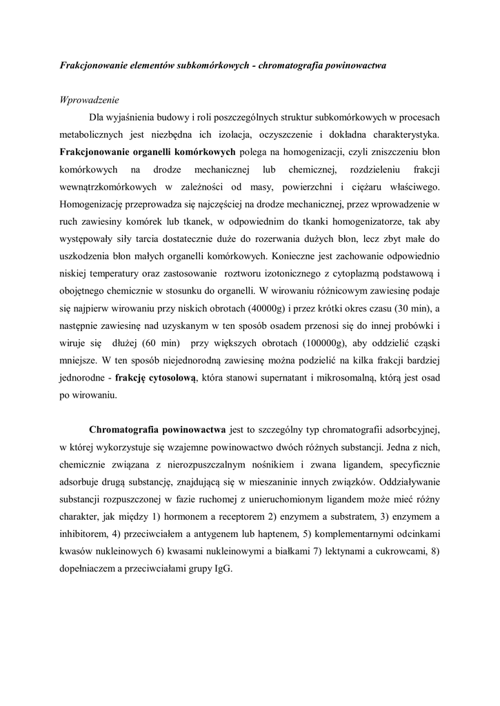 Frakcjonowanie elementów subkomórkowych - chromatografia powinowactwa Wprowadzenie Dla wyjaśnienia budowy i roli poszczególnych struktur subkomórkowych w procesach metabolicznych jest niezbędna ich izolacja, oczyszczenie i dokładna charakterystyka. Frakcjonowanie organelli komórkowych polega na homogenizacji, czyli zniszczeniu błon komórkowych na drodze mechanicznej lub chemicznej, rozdzieleniu frakcji wewnątrzkomórkowych w zależności od masy, powierzchni i ciężaru właściwego. Homogenizację przeprowadza się najczęściej na drodze mechanicznej, przez wprowadzenie w ruch zawiesiny komórek lub tkanek, w odpowiednim do tkanki homogenizatorze, tak aby występowały siły tarcia dostatecznie duże do rozerwania dużych błon, lecz zbyt małe do uszkodzenia błon małych organelli komórkowych. Konieczne jest zachowanie odpowiednio niskiej temperatury oraz zastosowanie roztworu izotonicznego z cytoplazmą podstawową i obojętnego chemicznie w stosunku do organelli. W wirowaniu różnicowym zawiesinę podaje się najpierw wirowaniu przy niskich obrotach (40000g) i przez krótki okres czasu (30 min), a następnie zawiesinę nad uzyskanym w ten sposób osadem przenosi się do innej probówki i wiruje się dłużej (60 min) przy większych obrotach (100000g), aby oddzielić cząski mniejsze. W ten sposób niejednorodną zawiesinę można podzielić na kilka frakcji bardziej jednorodne - frakcję cytosolową, która stanowi supernatant i mikrosomalną, którą jest osad po wirowaniu. Chromatografia powinowactwa jest to szczególny typ chromatografii adsorbcyjnej, w której wykorzystuje się wzajemne powinowactwo dwóch różnych substancji. Jedna z nich, chemicznie związana z nierozpuszczalnym nośnikiem i zwana ligandem, specyficznie adsorbuje drugą substancję, znajdującą się w mieszaninie innych związków. Oddziaływanie substancji rozpuszczonej w fazie ruchomej z unieruchomionym ligandem może mieć różny charakter, jak między 1) hormonem a receptorem 2) enzymem a substratem, 3) enzymem a inhibitorem, 4) przeciwciałem a antygenem lub haptenem, 5) komplementarnymi odcinkami kwasów nukleinowych 6) kwasami nukleinowymi a białkami 7) lektynami a cukrowcami, 8) dopełniaczem a przeciwciałami grupy IgG. Schemat przebiegu chromatografii powinowactwa: a) chemiczne wiązanie ligandu ze złożem (immobilizacja ligandu) b) specyficzne wiązanie substratu do unieruchomionego ligandu oraz odmycie niespecyficznie zaadsorbowanych cząsteczek białkowych c) elucja specyficznie związanego substratu Związki izolowane metodą chromatografii powinowactwa można eluować również w sposób niespecyficzny, za pomocą buforów o niskim lub wysokim pH (np. bufor octanowy, bufor węglanowy itp.), roztworów o dużej sile jonowej (2,5 M roztwór NaCl) czy związków rozrywających wiązania wodorowe (4-8 M roztwór mocznika, 6 M roztwór guanidyny). Zastosowanie zarówno specyficznych , jak i niespecyficznych eluentów pozwala uzyskać czysty preparat izolowanej substancji. Jako nośniki w chromatografii powinowactwa są stosowane złoża, które tradycyjnie wykorzystuje się do filtracji żelowej z tym, że przed użyciem konieczna jest odpowiednia ich aktywacja. Są to pochodne dekstranowe (Sephadex), agarozowe (Sepharose, Bio-Gel A) lub poliakrylamidowe (Bio-Gel P). Do aktywacji żeli dekstranowych i agarozowych powszechnie stosuje się reakcję z halogenocyjanami. Oprócz nośników, które można przygotować we własnym zakresie (Sephadex, Sepharose, Bio-Gel A), dostępne są również złoża już przystosowane do chemicznego wiązania ligandu, np. CNBr-activated-Sepharose 4B lub AffiGel 10. Rodzaj wiązania między ligandem i nośnikiem zależy zarówno od rodzaju substancji używanej jako ligand, jak i od nośnika. Ugrupowania karboimidowe, powstające podczas aktywacji żelu bromocyjanem, reagują wyłącznie z grupami aminowymi przyłączanej substancji. Z aktywnym nośnikiem można następnie związać chemicznie wszystkie typy biopolimerów, tj białka, kwasy nukleinowe oraz wielocukrowce zawierające grupy aminowe. Ligandy białkowe wiążą się także za pomocą grup karboksylowych (Glu, Asp), hydroksylowych (Tyr, Ser, Thr), sulfhydrylowych (Cys). Kwasy nukleinowe przyłącza się do nośnika za pośrednictwem reszt fosforanowych lub grup enolowych zasad azotowych, a cukrowce - przez grupy wodorotlenowe reszt cukrowych. W tabeli podano rodzaje nośników oraz reagujące z nimi grupy funkcyjne ligandów. Tabela 1. Zestawienie najczęściej stosowanych złóż gotowych do kowalencyjnego wiązania ligandu. L.p. Ligand Grupa funkcyjna ligandu użyta do wiązania z nośnikiem Aminowa Nazwa handlowa złoża 1. Białka, peptydy, aminokwasy, kwasy nukleinowe, polinukleotydy 2. Białka, peptydy, aminokwasy Karboksylowa AH-Sepharose 4B Affi-Gel 102 3. Cukrowce Hydroksylowa Epoxy-activated Sepharose 6B Affi-Gel Hz 4. Białka, peptydy, aminokwasy, nukleotydy zawierające siarkę Tiolowa Thiopropyl Sepharose 6B Activated Thiol Sepharose 4B Affi-Gel 501 5. Antybiotyki, hormony, koenzymy, inne małocząsteczkowe buiomolekuły Grupy dystansowe: aminowa, tiolowa,, hydroksylowa, karboksylowa CH-Sepharose 4B AH-Sepharose 4B Epoxy-activated Sepharose 6B Activated Thiol Sepharose 4B Thiopropyl Sepharose 6B Affi-Gel 601 CNBr-activated Sepharose 4B Activated CH-Sepharose 4B Epoxy-activated Sepharose 6B CH-Sepharose 4B Affi-Gel 10 Affi-Prep 10 Chromatografia kowalencyjna jest to szczególny przypadek chromatografii powinowactwa. Chromatografia kowalencyjna znalazła szczególne zastosowanie w przypadku izolowania cząsteczek zawierających grupy tiolowe. U podstaw tego rodzaju chromatografii powinowactwa leży możliwość utworzenia kowalencyjnego wiązania między cząsteczkami, które zawierają grupy tiolowe, z wolnymi grupami tiolowymi znajdującymi się w obrębie złoża. Wiązanie takie jest spontaniczne i odwracalne. Innym wariantem chromatografii powinowactwa jest chromatografia c