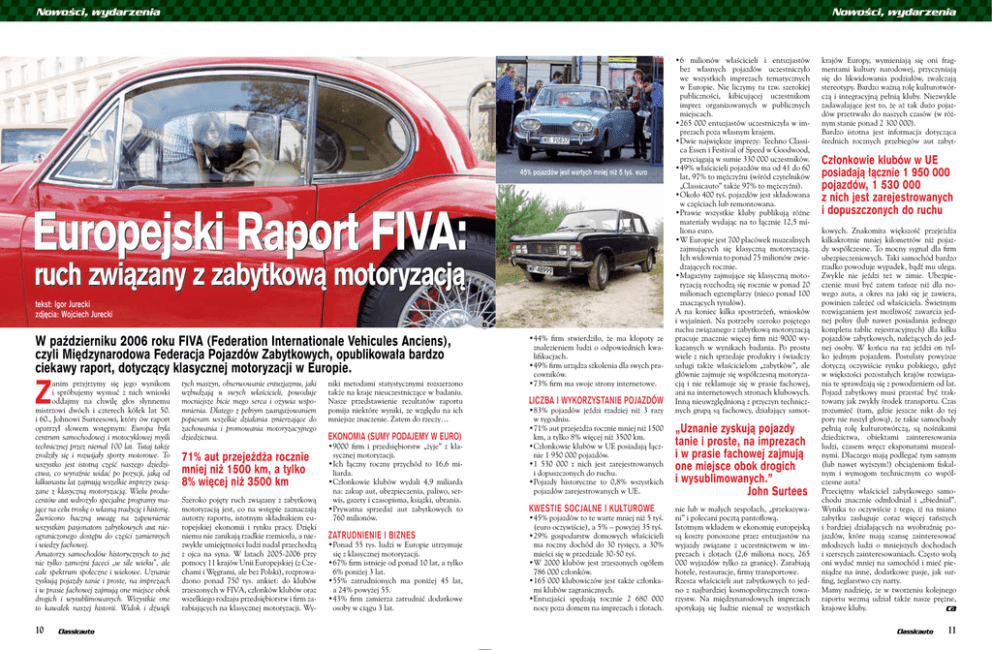 45% pojazdów jest wartych mniej niż 5 tyś. euro Europejski Raport FIVA: ruch związany z zabytkową motoryzacją tekst: Igor Jurecki zdjęcia: Wojciech Jurecki W październiku 2006 roku FIVA (Federation Internationale Vehicules Anciens), czyli Międzynarodowa Federacja Pojazdów Zabytkowych, opublikowała bardzo ciekawy raport, dotyczący klasycznej motoryzacji w Europie. Z anim przyjrzymy się jego wynikom i spróbujemy wysnuć z nich wnioski oddajmy na chwilę głos słynnemu mistrzowi dwóch i czterech kółek lat 50. i 60., Johnowi Surteesowi, który ów raport opatrzył słowem wstępnym: Europa była centrum samochodowej i motocyklowej myśli technicznej przez niemal 100 lat. Tutaj także zrodziły się i rozwijały sporty motorowe. To wszystko jest istotną część naszego dziedzictwa, co wyraźnie widać po pozycji, jaką od kilkunastu lat zajmują wszelkie imprezy związane z klasyczną motoryzacją. Wielu producentów aut wdrożyło specjalne programy mające na celu troskę o własną tradycję i historię. Zwrócono baczną uwagę na zapewnienie wszystkim pasjonatom zabytkowych aut nieograniczonego dostępu do części zamiennych i wiedzy fachowej. Amatorzy samochodów historycznych to już nie tylko zamożni faceci „w sile wieku”, ale całe spektrum społeczne i wiekowe. Uznanie zyskują pojazdy tanie i proste, na imprezach i w prasie fachowej zajmują one miejsce obok drogich i wysublimowanych. Wszystkie one to kawałek naszej historii. Widok i dźwięk 10 tych maszyn, obserwowanie entuzjazmu, jaki wzbudzają u swych właścicieli, powoduje mocniejsze bicie mego serca i ożywia wspomnienia. Dlatego z pełnym zaangażowaniem popieram wszelkie działania zmierzające do zachowania i promowania motoryzacyjnego dziedzictwa. 71% aut przejeżdża rocznie mniej niż 1500 km, a tylko 8% więcej niż 3500 km Szeroko pojęty ruch związany z zabytkową motoryzacją jest, co na wstępie zaznaczają autorzy raportu, istotnym składnikiem europejskiej ekonomii i rynku pracy. Dzięki niemu nie zanikają rzadkie rzemiosła, a niezwykłe umiejętności ludzi nadal przechodzą z ojca na syna. W latach 2005-2006 przy pomocy 11 krajów Unii Europejskiej (z Czechami i Węgrami, ale bez Polski), rozprowadzono ponad 750 tys. ankiet: do klubów zrzeszonych w FIVA, członków klubów oraz wszelkiego rodzaju przedsiębiorstw i rm zarabiających na klasycznej motoryzacji. Wy- niki metodami statystycznymi rozszerzono także na kraje nieuczestniczące w badaniu. Nasze przedstawienie rezultatów raportu pomija niektóre wyniki, ze względu na ich mniejsze znaczenie. Zatem do rzeczy… EKONOMIA (SUMY PODAJEMY W EURO) •9000 rm i przedsiębiorstw „żyje” z klasycznej motoryzacji. •Ich łączny roczny przychód to 16,6 miliarda. •Członkowie klubów wydali 4,9 miliarda na: zakup aut, ubezpieczenia, paliwo, serwis, gazety i czasopisma, książki, ubrania. •Prywatna sprzedaż aut zabytkowych to 760 milionów. ZATRUDNIENIE I BIZNES •Ponad 55 tys. ludzi w Europie utrzymuje się z klasycznej motoryzacji. •67% rm istnieje od ponad 10 lat, a tylko 6% poniżej 3 lat. •55% zatrudnionych ma poniżej 45 lat, a 24% powyżej 55. •43% rm zamierza zatrudnić dodatkowe osoby w ciągu 3 lat. •44% rm stwierdziło, że ma kłopoty ze znalezieniem ludzi o odpowiednich kwalikacjach. •49% rm urządza szkolenia dla swych pracowników. •73% rm ma swoje strony internetowe. LICZBA I WYKORZYSTANIE POJAZDÓW •83% pojazdów jeździ rzadziej niż 3 razy w tygodniu. •71% aut przejeżdża rocznie mniej niż 1500 km, a tylko 8% więcej niż 3500 km. •Członkowie klubów w UE posiadają łącznie 1 950 000 pojazdów. •1 530 000 z nich jest zarejestrowanych i dopuszczonych do ruchu. •Pojazdy historyczne to 0,8% wszystkich pojazdów zarejestrowanych w UE. KWESTIE SOCJALNE I KULTUROWE •45% pojazdów to te warte mniej niż 5 tyś. (euro oczywiście), a 5% – powyżej 35 tyś. •29% gospodarstw domowych właścicieli ma roczny dochód do 30 tysięcy, a 30% mieści się w przedziale 30-50 tyś. •W 2000 klubów jest zrzeszonych ogółem 786 000 członków. •165 000 klubowiczów jest także członkami klubów zagranicznych. •Entuzjaści spędzają rocznie 2 680 000 nocy poza domem na imprezach i zlotach. •6 milionów właścicieli i entuzjastów bez własnych pojazdów uczestniczyło we wszystkich imprezach tematycznych w Europie. Nie liczymy tu tzw. szerokiej publiczności, kibicującej uczestnikom imprez organizowanych w publicznych miejscach. •265 000 entuzjastów uczestniczyła w imprezach poza własnym krajem. •Dwie największe imprezy: Techno Classica Essen i Festival of Speed w Goodwood, przyciągają w sumie 330 000 uczestników. •49% właścicieli pojazdów ma od 41 do 60 lat, 97% to mężczyźni (wśród czytelników „Classicauto” także 97% to mężczyźni). •Około 400 tyś. pojazdów jest składowana w częściach lub remontowana. •Prawie wszystkie kluby publikują różne materiały wydając na to łącznie 12,5 miliona euro. •W Europie jest 700 placówek muzealnych zajmujących się klasyczną motoryzacją. Ich widownia to ponad 75 milionów zwiedzających rocznie. •Magazyny zajmujące się klasyczną motoryzacją rozchodzą się rocznie w ponad 20 milionach egzemplarzy (nieco ponad 100 znaczących tytułów). A na koniec kilka spostrzeżeń, wniosków i wyjaśnień. Na potrzeby szeroko pojętego ruchu związanego z zabytkową motoryzacją pracuje znacznie więcej rm niż 9000 wykazanych w wynikach badania. Po prostu wiele z nich sprzedaje produkty i świadczy usługi także właścicielom „zabytków”, ale głównie zajmuje się współczesną motoryzacją i nie reklamuje się w prasie fachowej, ani na internetowych stronach klubowych. Inną nieuwzględnioną z przyczyn technicznych grupą są fachowcy, działający samot- „Uznanie zyskują pojazdy tanie i proste, na imprezach i w prasie fachowej zajmują one miejsce obok drogich i wysublimowanych.” Jo