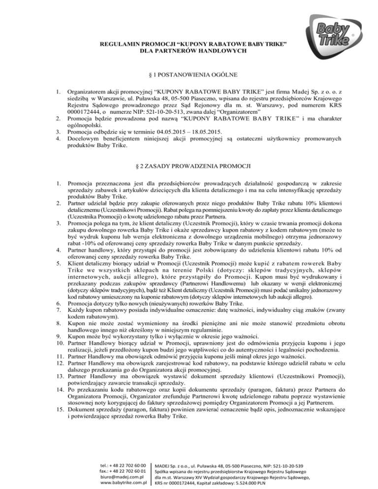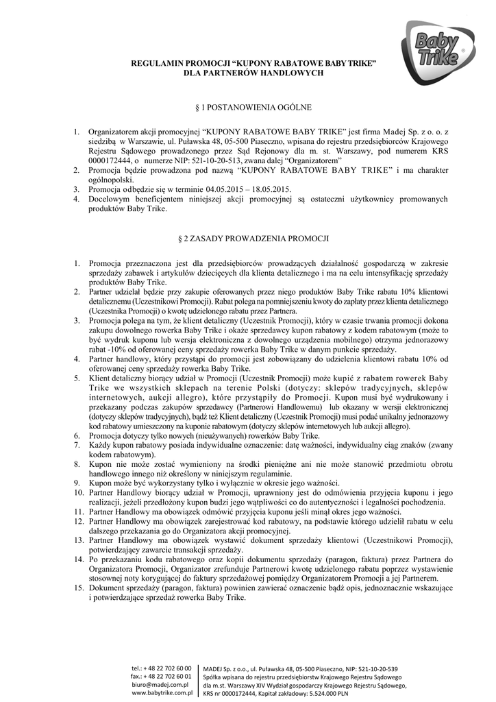 REGULAMIN PROMOCJI “KUPONY RABATOWE BABY TRIKE” DLA PARTNERÓW HANDLOWYCH § 1 POSTANOWIENIA OGÓLNE 1. 2. 3. 4. Organizatorem akcji promocyjnej “KUPONY RABATOWE BABY TRIKE” jest firma Madej Sp. z o. o. z siedzibą w Warszawie, ul. Puławska 48, 05-500 Piaseczno, wpisana do rejestru przedsiębiorców Krajowego Rejestru Sądowego prowadzonego przez Sąd Rejonowy dla m. st. Warszawy, pod numerem KRS 0000172444, o numerze NIP: 521-10-20-513, zwana dalej “Organizatorem” Promocja będzie prowadzona pod nazwą “KUPONY RABATOWE BABY TRIKE” i ma charakter ogólnopolski. Promocja odbędzie się w terminie 04.05.2015 – 18.05.2015. Docelowym beneficjentem niniejszej akcji promocyjnej są ostateczni użytkownicy promowanych produktów Baby Trike. § 2 ZASADY PROWADZENIA PROMOCJI 1. 2. 3. 4. 5. 6. 7. 8. 9. 10. 11. 12. 13. 14. 15. Promocja przeznaczona jest dla przedsiębiorców prowadzących działalność gospodarczą w zakresie sprzedaży zabawek i artykułów dziecięcych dla klienta detalicznego i ma na celu intensyfikację sprzedaży produktów Baby Trike. Partner udzielał będzie przy zakupie oferowanych przez niego produktów Baby Trike rabatu 10% klientowi detalicznemu (Uczestnikowi Promocji). Rabat polega na pomniejszeniu kwoty do zapłaty przez klienta detalicznego (Uczestnika Promocji) o kwotę udzielonego rabatu przez Partnera. Promocja polega na tym, że klient detaliczny (Uczestnik Promocji), który w czasie trwania promocji dokona zakupu dowolnego rowerka Baby Trike i okaże sprzedawcy kupon rabatowy z kodem rabatowym (może to być wydruk kuponu lub wersja elektroniczna z dowolnego urządzenia mobilnego) otrzyma jednorazowy rabat -10% od oferowanej ceny sprzedaży rowerka Baby Trike w danym punkcie sprzedaży. Partner handlowy, który przystąpi do promocji jest zobowiązany do udzielenia klientowi rabatu 10% od oferowanej ceny sprzedaży rowerka Baby Trike. Klient detaliczny biorący udział w Promocji (Uczestnik Promocji) może kupić z rabatem rowerek Baby Trike we wszystkich sklepach na terenie Polski (dotyczy: sklepów tradycyjnych, sklepów internetowych, aukcji allegro), które przystąpiły do Promocji. Kupon musi być wydrukowany i przekazany podczas zakupów sprzedawcy (Partnerowi Handlowemu) lub okazany w wersji elektronicznej (dotyczy sklepów tradycyjnych), bądź też Klient detaliczny (Uczestnik Promocji) musi podać unikalny jednorazowy kod rabatowy umieszczony na kuponie rabatowym (dotyczy sklepów internetowych lub aukcji allegro). Promocja dotyczy tylko nowych (nieużywanych) rowerków Baby Trike. Każdy kupon rabatowy posiada indywidualne oznaczenie: datę ważności, indywidualny ciąg znaków (zwany kodem rabatowym). Kupon nie może zostać wymieniony na środki pieniężne ani nie może stanowić przedmiotu obrotu handlowego innego niż określony w niniejszym regulaminie. Kupon może być wykorzystany tylko i wyłącznie w okresie jego ważności. Partner Handlowy biorący udział w Promocji, uprawniony jest do odmówienia przyjęcia kuponu i jego realizacji, jeżeli przedłożony kupon budzi jego wątpliwości co do autentyczności i legalności pochodzenia. Partner Handlowy ma obowiązek odmówić przyjęcia kuponu jeśli minął okres jego ważności. Partner Handlowy ma obowiązek zarejestrować kod rabatowy, na podstawie którego udzielił rabatu w celu dalszego przekazania go do Organizatora akcji promocyjnej. Partner Handlowy ma obowiązek wystawić dokument sprzedaży klientowi (Uczestnikowi Promocji), potwierdzający zawarcie transakcji sprzedaży. Po przekazaniu kodu rabatowego oraz kopii dokumentu sprzedaży (paragon, faktura) przez Partnera do Organizatora Promocji, Organizator zrefunduje Partnerowi kwotę udzielonego rabatu poprzez wystawienie stosownej noty korygującej do faktury sprzedażowej pomiędzy Organizatorem Promocji a jej Partnerem. Dokument sprzedaży (paragon, faktura) powinien zawierać oznaczenie bądź opis, jednoznacznie wskazujące i potwierdzające sprzedaż rowerka Baby Trike. tel.: + 48 22 702 60 00 fax.: + 48 22 702 60 01 [email protected] www.babytrike.com.pl MADEJ Sp. z o.o., ul. Puławska 48, 05‐500 Piaseczno, NIP: 521‐10‐20‐539 Spółka wpisana do rejestru przedsiębiorstw Krajowego Rejestru Sądowego dla m.st. Warszawy XIV Wydział gospodarczy Krajowego Rejestru Sądowego, KRS nr 0000172444, Kapitał zakładowy: 5.524.000 PLN § 3 WARUNKI UCZESTNICTWA PARTNERA W PROMOCJI 1. Warunkiem uczestnictwa Partnera Handlowego w Promocji jest łączne spełnienie następujących warunków: Udzielenie rabatu 10% klientowi detalicznemu (Uczestnikowi Promocji) przy zakupie dowolnego rowerka Baby Trike na podstawie okazanego kuponu rabatowego. Przekazanie Organizatorowi Promocji kodu rabatowego wraz z kopią dokumentu sprzedaży (paragon, faktura) ma którym widnieje opis jednoznacznie wskazujący i potwierdzający sprzedaż rowerka Baby Trike. 2. Udział w promocji jest dobrowolny. § 4 ODPOWIEDZIALNOŚĆ ORGANIZATORA 1. Organizator nie ponosi odpowiedzialności, jeżeli punkt sprzedaży (Partner), w którym klient (Uczestnik Promocji) dokonał zakupu produktu promowanego odmówi realizacji rabatu promocyjnego. Uczestnik Promocji powinien przed dokonaniem zakupu ustalić, czy dany podmiot zadeklarował uczestnictwo w niniejszej Promocji i faktycznie honoruje niniejszą akcję promocyjną. 2. Zasady rozliczenia niniejszej Promocji między Organizatorem a Partnerami Handlowymi Organizatora zawarte są w § 3 niniejszego regulaminu. 3. Organizator zastrzega sobie prawo do niewypłacenia Partnerowi kwoty równowartej udzielonego rabatu klientowi (Uczestnikowi Promocji), jeśli przekazany przez Partnera kod rabatowy nie jest prawidłowy (nie pochodzi z kuponu rabatowego Baby Trike) lub jeśli przekazana kopia dokumentu sprzedaży (paragon, faktura) nie wskazuje wyraźnie lub budzi wątpliwości, iż zawarta transakcja sprzedaży dotyczy rowerka Baby Trike. 4. Wszelkie reklamacje powinny być kierowane do Organiza