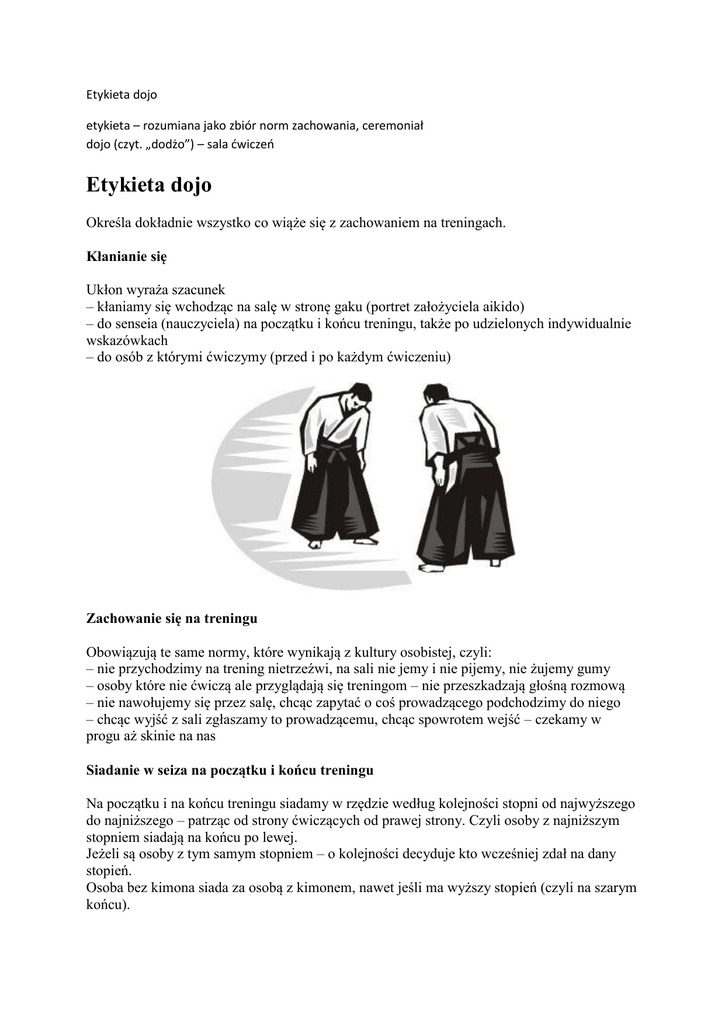 Etykieta dojo etykieta – rozumiana jako zbiór norm zachowania, ceremoniał dojo (czyt. „dodżo”) – sala ćwiczeń Etykieta dojo Określa dokładnie wszystko co wiąże się z zachowaniem na treningach. Kłanianie się Ukłon wyraża szacunek – kłaniamy się wchodząc na salę w stronę gaku (portret założyciela aikido) – do senseia (nauczyciela) na początku i końcu treningu, także po udzielonych indywidualnie wskazówkach – do osób z którymi ćwiczymy (przed i po każdym ćwiczeniu) Zachowanie się na treningu Obowiązują te same normy, które wynikają z kultury osobistej, czyli: – nie przychodzimy na trening nietrzeźwi, na sali nie jemy i nie pijemy, nie żujemy gumy – osoby które nie ćwiczą ale przyglądają się treningom – nie przeszkadzają głośną rozmową – nie nawołujemy się przez salę, chcąc zapytać o coś prowadzącego podchodzimy do niego – chcąc wyjść z sali zgłaszamy to prowadzącemu, chcąc spowrotem wejść – czekamy w progu aż skinie na nas Siadanie w seiza na początku i końcu treningu Na początku i na końcu treningu siadamy w rzędzie według kolejności stopni od najwyższego do najniższego – patrząc od strony ćwiczących od prawej strony. Czyli osoby z najniższym stopniem siadają na końcu po lewej. Jeżeli są osoby z tym samym stopniem – o kolejności decyduje kto wcześniej zdał na dany stopień. Osoba bez kimona siada za osobą z kimonem, nawet jeśli ma wyższy stopień (czyli na szarym końcu). Nauka technik Jeśli są objaśnienia na środku i wszyscy siedzą w seiza - wstajemy nie wtedy jak instruktor skończy mówić tylko wtedy jak padnie komenda hajime - ćwiczymy Przed i po ćwiczeniach w parach ukłon; pamiętać o onegai shimas i arigato Osoba z którą ćwiczymy pomaga nam, nie rywalizujemy. Nazewnictwo technik Japońskie nazwy – to jest problem spamiętać na początku. Tak naprawdę nie ma ich tak dużo, słówka japońskie są jak klocki lego z których buduje się nazwy technik. Japońskie pismo przypomina „krzaczki” więc zapisuje się je w alfabecie europejskim. Czytamy je zgodnie z wymową angielską, czyli sh=sz ch=cz j=dż Wiemy już co to dojo i gaku, czas poznać pozostałe słówka. sensei – nauczyciel, trener, ten który prowadzi zajęcia tori – ten który się broni, rzucający uke – ten który atakuje, przyjmujący technikę Postawy – jak stoimy przed wykonaniem techniki w parach ai-hanmi – postawa zgodna, obie osoby stają tak samo gyaku-hanmi – postawa odwrotna, lustrzana to jest ai-hanmi ASHI SABAKI – praca stóp tsugi-ashi – krok dostawny ayumi-ashi – krok przestawny TAI SABAKI – praca ciałem. Zwroty, obroty, przemieszczania się tenkan – obrót (najczęściej o 180 stopni) obracamy się na stopie nogi która jest z przodu, noga z tyłu zakreśla łuk jak cyrkiel, pięta nadaje kierunek irimi-tenkan jak wyżej, tylko najpierw robimy krok do przodu (irimi znaczy wejście do przodu) uchi-tenkan kolejna odmiana tenkan, tu obracamy się o 90 stopni czyli o ćwiartkę koła tenkai-ashi to jest zwrot w miejscu o 180 stopni, zmieniamy kierunek nie odrywając stóp od podłoża zempo-tenkai-ashi – krok do przodu i tenkai-ashi (czyli krok do przodu i zwrot w miejscu) UKEMI WAZA – przewroty i pady mae-ukemi – przewrót w przód ushiro-ukemi – przewrót w tył Przewroty i techniki występują w 2 wersjach: tachi-waza – pozycja stojąca suwari- waza – pozycja siedząca Nazwy są długie niekiedy, bo opisują całą technikę. Czyli zarówno sposób ataku, jak i to co się robi broniąc się. Na egzaminie może tez być coś spoza wymagań, jakieś podstawowe ćwiczenie. taino tenkan ho stoimy w gyaku, chwyt za rękę, „broniący się” wykonuje tenkan; to nie jest technika tylko ćwiczenie, obie osoby starają się „zharmonizować” ze sobą Podstawowy podział wariantów technik omote – techniki wykonywane wchodząc przed partnerem ura – wykonywane wchodząc za partnera Większość technik wykonuje się właśnie w tych 2 wariantach. Dla przypomnienia – o co chodzi w podstawowych technikach: ikkyo – napieramy na łokieć w kierunku twarzy i obalamy shiho nage – łapiemy przedramię jak miecz, robimy krok, obracamy się i tniemy jak mieczem w dół irimi nage – obalenie poprzez unieruchomienie odcinka szyjnego przeciwnika i wejście w przód Słowniczek Liczenie po japońsku Nie będzie tego na egzaminie ale wypada umieć policzyć do 10-ciu. Liczy się przeważnie tylko na rozgrzewce, licząc powtórzenia danego ćwiczenia. 1 – ichi 2 – ni 3 – san 4 – shi (czasami yon) 5 – go 6 – roku 7 – shichi (czasami nana) 8 – hachi 9 – kyuu (czasami ku) 10 – juu Liczby wyższe tworzymy w następujący sposób: 11 – juu ichi (czyli dziesięć i jeden) 13 – juu san (czyli dziesięć i trzy) 20 – nijuu (czyli dwie dziesiątki) Pozostałe słówka dojo („dodżo”) – sala treningowa sensei – nauczyciel tatami – mata do ćwiczeń dan – stopień mistrzowski, kyu – stopień uczniowski między sobą: onegai shimasu („onegaj szimaz”) – „proszę ćwicz ze mną” arigato – dziękuję komendy instruktora: hajime (“hadżime”) – „ćwiczcie” yame – „stop” seiza – “siadać” kakari geiko – ćwiczymy w grupach (nie w parach) tai-sabaki – praca ciałem, zwroty, obroty, poruszanie się ukemi – przewroty, pady shikko – łażenie na kolanach uke – rzucany (ten który atakuje) tori – rzucający (ten który broni się) tsugi–ashi – krok dostawny, ayumi–ashi – krok przestawny ai–hanmi – pozycja zgodna (stoimy tak samo) gyaku–hanmi – pozycja przeciwna (stoimy „lustrzanie”) hidari – lewa (postawa) migi – prawa (postawa) kamae – pozycja, postawa (walki) przykładowo: „migi kamae” oznacza „przyjmij prawą postawę” poziomy ciała: jodan – wysoki (głowa, szyja), chudan – średni (klatka piersiowa, splot słoneczny), gedan – niski (poniżej p