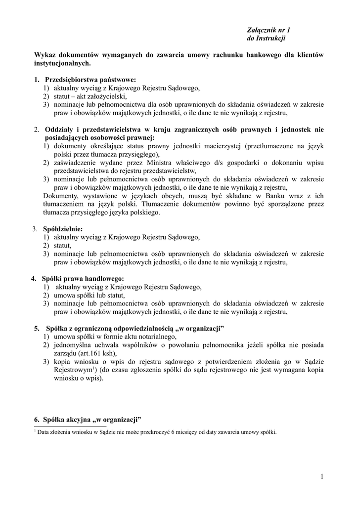 Załącznik nr 1 do Instrukcji Wykaz dokumentów wymaganych do zawarcia umowy rachunku bankowego dla klientów instytucjonalnych. 1. Przedsiębiorstwa państwowe: 1) aktualny wyciąg z Krajowego Rejestru Sądowego, 2) statut – akt założycielski, 3) nominacje lub pełnomocnictwa dla osób uprawnionych do składania oświadczeń w zakresie praw i obowiązków majątkowych jednostki, o ile dane te nie wynikają z rejestru, 2. Oddziały i przedstawicielstwa w kraju zagranicznych osób prawnych i jednostek nie posiadających osobowości prawnej: 1) dokumenty określające status prawny jednostki macierzystej (przetłumaczone na język polski przez tłumacza przysięgłego), 2) zaświadczenie wydane przez Ministra właściwego d/s gospodarki o dokonaniu wpisu przedstawicielstwa do rejestru przedstawicielstw, 3) nominacje lub pełnomocnictwa osób uprawnionych do składania oświadczeń w zakresie praw i obowiązków majątkowych jednostki, o ile dane te nie wynikają z rejestru, Dokumenty, wystawione w językach obcych, muszą być składane w Banku wraz z ich tłumaczeniem na język polski. Tłumaczenie dokumentów powinno być sporządzone przez tłumacza przysięgłego języka polskiego. 3. Spółdzielnie: 1) aktualny wyciąg z Krajowego Rejestru Sądowego, 2) statut, 3) nominacje lub pełnomocnictwa osób uprawnionych do składania oświadczeń w zakresie praw i obowiązków majątkowych jednostki, o ile dane te nie wynikają z rejestru, 4. Spółki prawa handlowego: 1) aktualny wyciąg z Krajowego Rejestru Sądowego, 2) umowa spółki lub statut, 3) nominacje lub pełnomocnictwa osób uprawnionych do składania oświadczeń w zakresie praw i obowiązków majątkowych jednostki, o ile dane te nie wynikają z rejestru, 5. Spółka z ograniczoną odpowiedzialnością „w organizacji” 1) umowa spółki w formie aktu notarialnego, 2) jednomyślna uchwała wspólników o powołaniu pełnomocnika jeżeli spółka nie posiada zarządu (art.161 ksh), 3) kopia wniosku o wpis do rejestru sądowego z potwierdzeniem złożenia go w Sądzie Rejestrowym1) (do czasu zgłoszenia spółki do sądu rejestrowego nie jest wymagana kopia wniosku o wpis). 6. Spółka akcyjna „w organizacji” 1 Data złożenia wniosku w Sądzie nie może przekroczyć 6 miesięcy od daty zawarcia umowy spółki. 1 1) akt notarialny o: a) zawiązaniu spółki oraz b) objęciu akcji, może być przedłożony jeden akt notarialny o zawiązaniu spółki oraz objęciu akcji), 2) dokument świadczący o umocowaniu do działania w imieniu spółki (wszyscy założyciele, zarząd, pełnomocnik ustanowiony jednomyślną uchwałą założycieli – art. 323 ksh), 3) kopia wniosku o wpis spółki do rejestru sądowego z potwierdzeniem złożenia go w Sądzie Rejestrowym*) (do czasu zgłoszenia spółki do sądu rejestrowego nie jest wymagana kopia wniosku o wpis). 7. Osoby fizyczne prowadzące działalność gospodarczą oraz wspólnicy spółek cywilnych: 1) zaświadczenie o wpisie do Ewidencji Działalności Gospodarczej, 2) umowa spółki (rejestracja w Urzędzie Skarbowym) – w przypadku spółki cywilnej, 3) pełnomocnictwa osób uprawnionych do składania oświadczeń w zakresie praw i obowiązków majątkowych spółki cywilnej lub osoby fizycznej prowadzącej działalność gospodarcza, o ile dane te nie wynikają z wpisu do ewidencji działalności gospodarczej, 8. Prowadzące działalność gospodarczą na własny rachunek wymagającą zezwolenia lub koncesji (m.in. agenci ubezpieczeniowi): 1) zaświadczenie o wpisie do ewidencji działalności gospodarczej, 2) zezwolenie lub koncesja na prowadzenie określonej działalności, 3) dokumenty wskazujące osoby uprawnione do składania oświadczeń woli w zakresie praw i obowiązków majątkowych, 9. Prowadzenie działalności gospodarczej, która nie podlega zgłoszeniu do ewidencji działalności gospodarczej (m.in. rolnicy indywidualni): dokonujący działalności wytwórczej w rolnictwie w zakresie upraw rolnych oraz chowu i hodowli zwierząt, ogrodnictwa, warzywnictwa, leśnictwa i rybactwa śródlądowego, a także wynajmowania przez rolników pokoi, sprzedaży posiłków domowych i świadczenia w gospodarstwach rolnych innych usług związanych z pobytem turystów ( art. 3 Ustawy o swobodzie działalności gospodarczej z dnia 2 lipca 2004r. Dz.U. Nr 173, poz.1807), 1) oświadczenie o prowadzeniu działalności rolniczej i sposobie rozliczania podatku VAT, 2) aktualny nakaz płatniczy, 10. Zakłady opieki zdrowotnej oraz lekarze prowadzący praktyki lekarskie: a) Samodzielne publiczne zakłady opieki zdrowotnej (od 01/01.1990 r. – po obowiązkowym przekształceniu z publicznych zakładów opieki zdrowotnej utworzone przez ministra lub centralny organ administracji rządowej, przez wojewodę (w przypadkach określonych w Ustawie o inspekcji sanitarnej), jednostkę samorządu terytorialnego, przez państwową uczelnię medyczna lub uczelnię prowadzącą działalność dydaktyczna-badawczą w dziedzinie nauk medycznych, kościół lub związek wyznaniowy, pracodawcę, fundację, związek zawodowy, samorząd zawodowy lub stowarzyszenie, inną krajową albo zagraniczną osobę prawną lub osobę fizyczną, spółką nie mająca osobowości prawnej. 1) aktualny wyciąg z KRS, 2) statut, 3) dokumenty wskazujące osoby upoważnione do składania oświadczeń w zakresie praw i obowiązków majątkowych, 2 b) Zakłady opieki zdrowotnej inne niż wyżej wymienione: 1) wypis z rejestru zakładów opieki zdrowotnej prowadzonego przez wojewodę lub ministra zdrowia i opieki społecznej, 2) statut, 3) dokumenty wskazujące osoby uprawnione do składania oświadczeń w zakresie praw i obowiązków majątkowych, c) Kasy chorych: 1) wypis z rejestru prowadzonego przez Sąd Rejonowy dla Miasta Stołecznego Warszawy w Warszawie, 2) statut kasy chorych ogłaszany w wojewódzkich dziennikach urzędowych województw, na których obszarze działa kasa, 3) dokumenty wskazujące osoby upraw