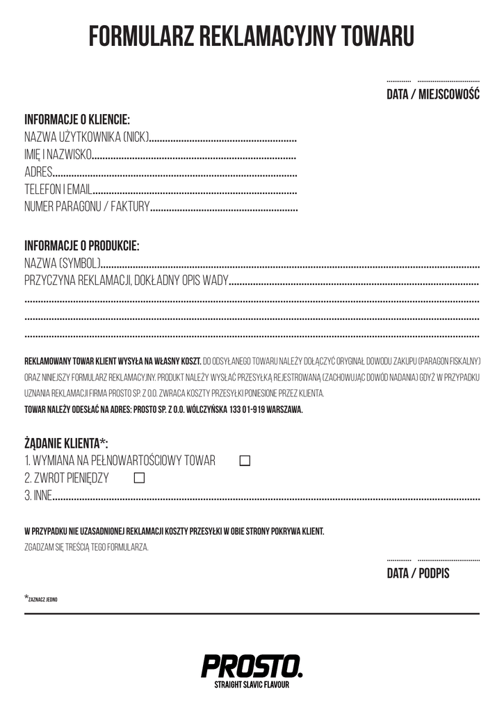 FORMULARZ REKLAMACYJNY TOWARU ............. ................................. data / Miejscowość INFORMACJE O KLIENCIE: Nazwa użytkownika (nick)....................................................... Imię i nazwisko............................................................................ Adres........................................................................................... Telefon i Email............................................................................ Numer paragonu / faktury....................................................... INFORMACJE O PRODUKCIE: NAZWA (SYMBOL)............................................................................................................................................. PRZYCZYNA REKLAMACJI, DOKŁADNY OPIS WADY............................................................................................. ......................................................................................................................................................................... ......................................................................................................................................................................... ......................................................................................................................................................................... REKLAMowany towar klient wysyła na własny koszt. do odsyłanego towaru należy dołączyć oryginał dowodu zakupu (paragon fiskalny) oraz niniejszy formularz reklamacyjny. produkt należy wysłać przesyłką rejestrowaną (zachowując dowód nadania) gdyż w przypadku uznania reklamacji firma Prosto sp. z o.o. zwraca koszty przesyłki poniesione przez klienta. Towar należy odesłać na adres: Prosto sp. z o.o. Wólczyńska 133 01-919 Warszawa. ŻĄDANIE KLIENTA*: 1. WYMIANA NA PEŁNOWARTOŚCIOWY TOWAR 2. ZWROT PIENIĘDZY 3. INNE............................................................................................................................................................... W przypadku nie uzasadnionej reklamacji koszty przesyłki w obie strony pokrywa klient. Zgadzam się treścią tego formularza. ............. ................................. data / PODPIS *ZAZNACZ JEDNO