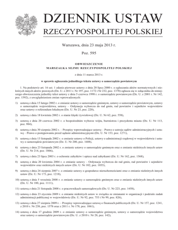 DZIENNIK USTAW RZECZYPOSPOLITEJ POLSKIEJ Warszawa, dnia 23 maja 2013 r. Poz. 595 OBWIESZCZENIE MARSZAŁKA SEJMU RZECZYPOSPOLITEJ POLSKIEJ z dnia 11 marca 2013 r. w sprawie ogłoszenia jednolitego tekstu ustawy o samorządzie powiatowym 1. Na podstawie art. 16 ust. 1 zdanie pierwsze ustawy z dnia 20 lipca 2000 r. o ogłaszaniu aktów normatywnych i niektórych innych aktów prawnych (Dz. U. z 2011 r. Nr 197, poz. 1172 i Nr 232, poz. 1378) ogłasza się w załączniku do niniejszego obwieszczenia jednolity tekst ustawy z dnia 5 czerwca 1998 r. o samorządzie powiatowym (Dz. U. z 2001 r. Nr 142, poz. 1592), z uwzględnieniem zmian wprowadzonych: 1)ustawą z dnia 15 lutego 2002 r. o zmianie ustawy o samorządzie gminnym, ustawy o samorządzie powiatowym, ustawy o samorządzie województwa, ustawy – Ordynacja wyborcza do rad gmin, rad powiatów i sejmików województw oraz ustawy o referendum lokalnym (Dz. U. Nr 23, poz. 220), 2)ustawą z dnia 18 kwietnia 2002 r. o stanie klęski żywiołowej (Dz. U. Nr 62, poz. 558), 3)ustawą z dnia 20 czerwca 2002 r. o bezpośrednim wyborze wójta, burmistrza i prezydenta miasta (Dz. U. Nr 113, poz. 984), 4)ustawą z dnia 30 sierpnia 2002 r. – Przepisy wprowadzające ustawę – Prawo o ustroju sądów administracyjnych i ustawę – Prawo o postępowaniu przed sądami administracyjnymi (Dz. U. Nr 153, poz. 1271), 5)ustawą z dnia 13 listopada 2002 r. o zmianie ustawy o Policji, ustawy o administracji rządowej w województwie i ustawy o samorządzie powiatowym (Dz. U. Nr 200, poz. 1688), 6)ustawą z dnia 23 listopada 2002 r. o zmianie ustawy o samorządzie gminnym oraz o zmianie niektórych innych ustaw (Dz. U. Nr 214, poz. 1806), 7)ustawą z dnia 23 lipca 2003 r. o ochronie zabytków i opiece nad zabytkami (Dz. U. Nr 162, poz. 1568), 8)ustawą z dnia 20 kwietnia 2004 r. o zmianie ustawy – Ordynacja wyborcza do rad gmin, rad powiatów i sejmików województw oraz niektórych innych ustaw (Dz. U. Nr 102, poz. 1055), 9)ustawą z dnia 24 sierpnia 2007 r. o zmianie ustawy o gospodarce nieruchomościami oraz o zmianie niektórych innych ustaw (Dz. U. Nr 173, poz. 1218), 10)ustawą z dnia 5 września 2008 r. o zmianie ustawy o samorządzie gminnym oraz o zmianie niektórych innych ustaw (Dz. U. Nr 180, poz. 1111), 11)ustawą z dnia 21 listopada 2008 r. o pracownikach samorządowych (Dz. U. Nr 223, poz. 1458), 12)ustawą z dnia 23 stycznia 2009 r. o zmianie niektórych ustaw w związku ze zmianami w organizacji i podziale zadań administracji publicznej w województwie (Dz. U. Nr 92, poz. 753 i Nr 99, poz. 826), 13)ustawą z dnia 27 sierpnia 2009 r. – Przepisy wprowadzające ustawę o finansach publicznych (Dz. U. Nr 157, poz. 1241, z 2010 r. Nr 238, poz. 1578 oraz z 2011 r. Nr 178, poz. 1061), 14)ustawą z dnia 17 grudnia 2009 r. o zmianie ustawy o samorządzie gminnym, ustawy o samorządzie województwa oraz ustawy o samorządzie powiatowym (Dz. U. z 2010 r. Nr 28, poz. 142), Dziennik Ustaw –2– Poz. 595 15)ustawą z dnia 22 stycznia 2010 r. o zmianie ustawy o działalności pożytku publicznego i o wolontariacie oraz niektórych innych ustaw (Dz. U. Nr 28, poz. 146), 16)ustawą z dnia 12 lutego 2010 r. o zmianie ustawy o informatyzacji działalności podmiotów realizujących zadania publiczne oraz niektórych innych ustaw (Dz. U. Nr 40, poz. 230), 17)ustawą z dnia 7 maja 2010 r. o wspieraniu rozwoju usług i sieci telekomunikacyjnych (Dz. U. Nr 106, poz. 675), 18)ustawą z dnia 5 stycznia 2011 r. – Przepisy wprowadzające ustawę – Kodeks wyborczy (Dz. U. Nr 21, poz. 113 oraz z 2012 r. poz. 1399), 19)ustawą z dnia 9 czerwca 2011 r. o wspieraniu rodziny i systemie pieczy zastępczej (Dz. U. Nr 149, poz. 887), 20)ustawą z dnia 31 sierpnia 2011 r. o zmianie ustawy – Kodeks wyborczy oraz niektórych innych ustaw (Dz. U. Nr 217, poz. 1281) oraz zmian wynikających z przepisów ogłoszonych przed dniem 27 lutego 2013 r. 2. Podany w załączniku do niniejszego obwieszczenia tekst jednolity ustawy nie obejmuje: 1)art. 8 ustawy z dnia 15 lutego 2002 r. o zmianie ustawy o samorządzie gminnym, ustawy o samorządzie powiatowym, ustawy o samorządzie województwa, ustawy – Ordynacja wyborcza do rad gmin, rad powiatów i sejmików województw oraz ustawy o referendum lokalnym (Dz. U. Nr 23, poz. 220), który stanowi: „Art. 8. Ustawa wchodzi w życie po upływie 14 dni od dnia ogłoszenia, z tym że przepis art. 17 ustawy, o której mowa w art. 1, i przepis art. 9 ust. 4 ustawy, o której mowa w art. 2, mają zastosowanie do kadencji następującej po kadencji, w czasie której ustawa weszła w życie.”; 2)art. 34 ustawy z dnia 18 kwietnia 2002 r. o stanie klęski żywiołowej (Dz. U. Nr 62, poz. 558), który stanowi: „Art. 34. Ustawa wchodzi w życie po upływie 30 dni od dnia ogłoszenia.”; 3)art. 102 ustawy z dnia 20 czerwca 2002 r. o bezpośrednim wyborze wójta, burmistrza i prezydenta miasta (Dz. U. Nr 113, poz. 984), który stanowi: „Art. 102. Ustawa wchodzi w życie po upływie 14 dni od dnia ogłoszenia, z tym że przepisy art. 28–81, art. 82 pkt 1 i 6 oraz art. 83–99 wchodzą w życie w dniu wyborów do organów stanowiących jednostek samorządu terytorialnego przeprowadzonych w związku z zakończeniem kadencji tych organów wybranych w dniu 11 października 1998 r.”; 4)art. 106 ustawy z dnia 30 sierpnia 2002 r. – Przepisy wprowadzające ustawę – Prawo o ustroju sądów administracyjnych i ustawę – Prawo o postępowaniu przed sądami administracyjnymi (Dz. U. Nr 153, poz. 1271), który stanowi: „Art. 106. Ustawa wchodzi w życie z dniem 1 stycznia 2004 r., z wyjątkiem przepisów art. 8 pkt 1 i 2, art. 10 pkt 2 i 3, art. 84 pkt 1, art. 86 § 1, art. 87 § 2, art. 88, art. 90 § 1, art. 91 i art. 92, które wchodzą w życie po upływie 14 dni od dnia ogłoszenia.”; 5)art. 6 ustawy z dnia 13 listopada 2002 r. o zmianie ustawy o Policji, ustawy o administracji rządowej w województwie i ustawy o samorządzie pow