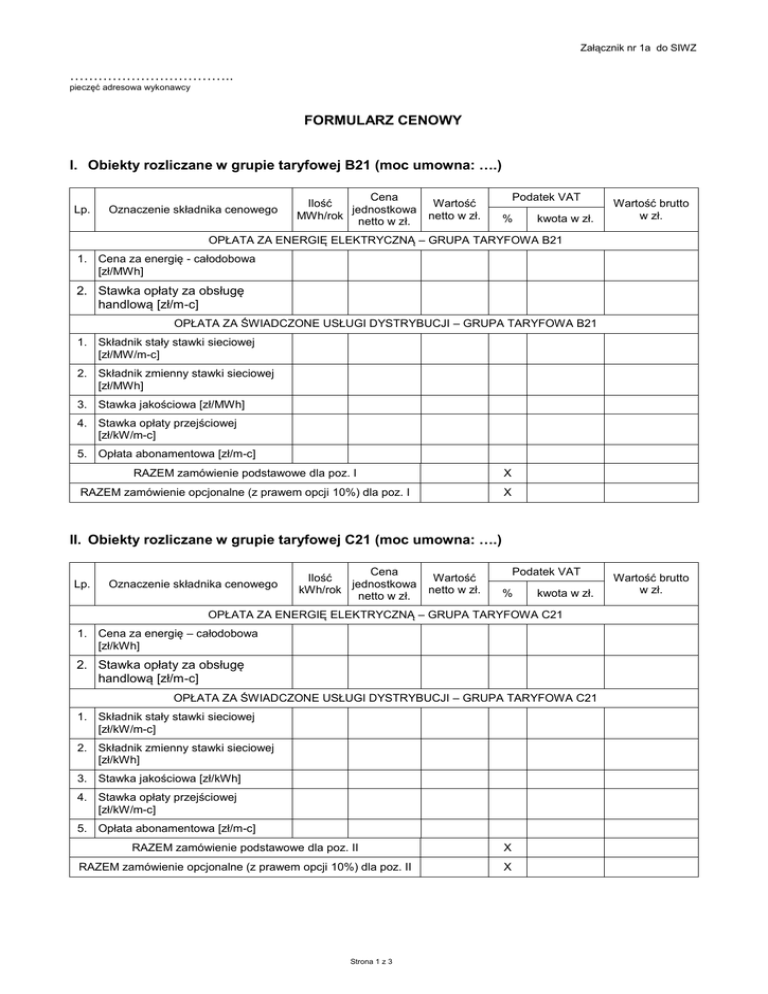 FORMULARZ CENOWY I. Obiekty rozliczane w grupie taryfowej B21