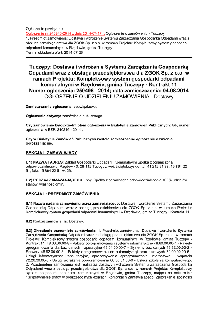 Ogłoszenie powiązane: Ogłoszenie nr 240246-2014 z dnia 2014-07-17 r. Ogłoszenie o zamówieniu - Tuczępy 1. Przedmiot zamówienia: Dostawa i wdrożenie Systemu Zarządzania Gospodarką Odpadami wraz z obsługą przedsiębiorstwa dla ZGOK Sp. z o.o. w ramach Projektu: Kompleksowy system gospodarki odpadami komunalnymi w Rzędowie, gmina Tuczępy -... Termin składania ofert: 2014-07-25 Tuczępy: Dostawa i wdrożenie Systemu Zarządzania Gospodarką Odpadami wraz z obsługą przedsiębiorstwa dla ZGOK Sp. z o.o. w ramach Projektu: Kompleksowy system gospodarki odpadami komunalnymi w Rzędowie, gmina Tuczępy - Kontrakt 11 Numer ogłoszenia: 259496 - 2014; data zamieszczenia: 04.08.2014 OGŁOSZENIE O UDZIELENIU ZAMÓWIENIA - Dostawy Zamieszczanie ogłoszenia: obowiązkowe. Ogłoszenie dotyczy: zamówienia publicznego. Czy zamówienie było przedmiotem ogłoszenia w Biuletynie Zamówień Publicznych: tak, numer ogłoszenia w BZP: 240246 - 2014r. Czy w Biuletynie Zamówień Publicznych zostało zamieszczone ogłoszenie o zmianie ogłoszenia: nie. SEKCJA I: ZAMAWIAJĄCY I. 1) NAZWA I ADRES: Zakład Gospodarki Odpadami Komunalnymi Spółka z ograniczoną odpowiedzialnością, Rzędów 40, 28-142 Tuczępy, woj. świętokrzyskie, tel. 41 242 91 33, 15 864 22 51, faks 15 864 22 51 w. 26. I. 2) RODZAJ ZAMAWIAJĄCEGO: Inny: Spółka z ograniczoną odpowiedzialnością 100% udziałów stanowi własność gmin. SEKCJA II: PRZEDMIOT ZAMÓWIENIA II.1) Nazwa nadana zamówieniu przez zamawiającego: Dostawa i wdrożenie Systemu Zarządzania Gospodarką Odpadami wraz z obsługą przedsiębiorstwa dla ZGOK Sp. z o.o. w ramach Projektu: Kompleksowy system gospodarki odpadami komunalnymi w Rzędowie, gmina Tuczępy - Kontrakt 11. II.2) Rodzaj zamówienia: Dostawy. II.3) Określenie przedmiotu zamówienia: 1. Przedmiot zamówienia: Dostawa i wdrożenie Systemu Zarządzania Gospodarką Odpadami wraz z obsługą przedsiębiorstwa dla ZGOK Sp. z o.o. w ramach Projektu: Kompleksowy system gospodarki odpadami komunalnymi w Rzędowie, gmina Tuczępy Kontrakt 11. 48.00.00.00-8 - Pakiety oprogramowania i systemy informatyczne 48.60.00.00-4 - Pakiety oprogramowania dla baz danych i operacyjne 48.61.00.00-7 - Systemy baz danych 48.82.00.00-2 Serwery 48.92.00.00-3 - Pakiety oprogramowania do automatyzacji prac biurowych 72.00.00.00-5 Usługi informatyczne: konsultacyjne, opracowywania oprogramowania, internetowe i wsparcia 72.26.30.00-6 - Usługi wdrażania oprogramowania 80.53.31.00-0 - Usługi szkolenia komputerowego. 2. Przedmiotem zamówienia jest realizacja dostawy i wdrożenia Systemu Zarządzania Gospodarką Odpadami wraz z obsługą przedsiębiorstwa dla ZGOK Sp. z o.o. w ramach Projektu: Kompleksowy system gospodarki odpadami komunalnymi w Rzędowie, gmina Tuczępy, mająca na celu m.in.: 1)usprawnienie pracy w poszczególnych działach, komórkach Zamawiającego, 2)uzyskanie spójności danych oraz szybsza wymiana informacji i jej przetwarzanie, 3)usprawnienie planowania zadań krótko i długoterminowych, 4)lepsza realizacja statutowej działalności przedsiębiorstwa, 5)pełen monitoring kosztów, 6)wysoka jakość obsługi Klienta. Zakres zamówienia obejmuje: - dostawę i instalację sprzętu serwerowego, bazy danych, udzielenie licencji systemu; - wdrożenie systemu i obsługa systemu. 3. Szczegółowy opis przedmiotu zamówienia został opisany w Szczegółowym opisie przedmiotu zamówienia - Załącznik Nr 8 do SIWZ. 4. Ilekroć w treści SIWZ, w tym w Szczegółowym opisie przedmiotu zamówienia, użyte są znaki towarowe, patenty lub pochodzenie a także normy, Zamawiający dopuszcza rozwiązanie równoważne. W przypadku oferowania produktów równoważnych do produktów wyspecyfikowanych przez Zamawiającego, produkty równoważne muszą charakteryzować się nie gorszymi parametrami technicznymi niż produkty wyspecyfikowane przez Zamawiającego. Przez produkt równoważny dla przedmiotu zamówienia rozumie się sprzęt (produkt) o parametrach i wymaganiach minimalnych wyszczególnionych (wymienionych) i określonych w Szczegółowym opisie przedmiotu zamówienia - Załącznik Nr 8 do SIWZ, który w sposób poprawny współpracuje z urządzeniami i systemami będącymi w posiadaniu Zamawiającego oraz realizuje wszystkie funkcjonalności, a jego zastosowanie nie wymaga żadnych nakładów związanych z dostosowaniem urządzeń i systemów Zamawiającego lub produktu równoważnego oraz posiada wszystkie funkcjonalności określone w poszczególnych punktach Szczegółowego opisu przedmiotu zamówienia. 5. Dostawy objęte przedmiotem zamówienia muszą być wykonane zgodnie z obowiązującymi przepisami oraz warunkami zawartymi w SIWZ. 6. Zamówienie jest realizowane w ramach Projektu pn.: Kompleksowy system gospodarki odpadami komunalnymi w Rzędowie gmina Tuczępy dla którego została podpisana umowa o dofinansowanie z Funduszu Spójności nr POIS.02.01.00-00-010/09 w ramach działania 2.1 - Kompleksowe przedsięwzięcia z zakresu gospodarki odpadami komunalnymi ze szczególnym uwzględnieniem odpadów niebezpiecznych priorytetu II Gospodarka odpadami i ochrona powierzchni ziemi Programu Operacyjnego Infrastruktura i Środowisko 2007 - 2013 wraz z Aneksem nr 1 z dnia 1 marca 2013 r., Aneksem nr 2 z dnia 3 kwietnia 2014 r. i Aneksem nr 3 z dnia 30 czerwca 2014 r. 7. Projekt zakłada budowę kompleksowego Zakładu Gospodarki Odpadami Komunalnymi (ZGOK) na terenie byłej Kopalni Siarki Grzybów, na gruntach leżących w obrębach Dobrów, Rzędów gmina Tuczępy, powiat Busko - Zdrój oraz w obrębie Grzybów, gmina Staszów, powiat Staszów (składowisko odpadów komunalnych). Projektowana inwestycja obejmuje budowę kompleksowego zakładu gospodarki odpadów komunalnych z technologią segregacji, kompostowania odpadów organicznych, belowania surowców wtórnych i składowania pozostałości po segregacji. II.4) Wspólny Słownik Zamówień (CPV): 48.00.00.00-8, 48.60.00.00-4, 48.61.00.00-7, 48